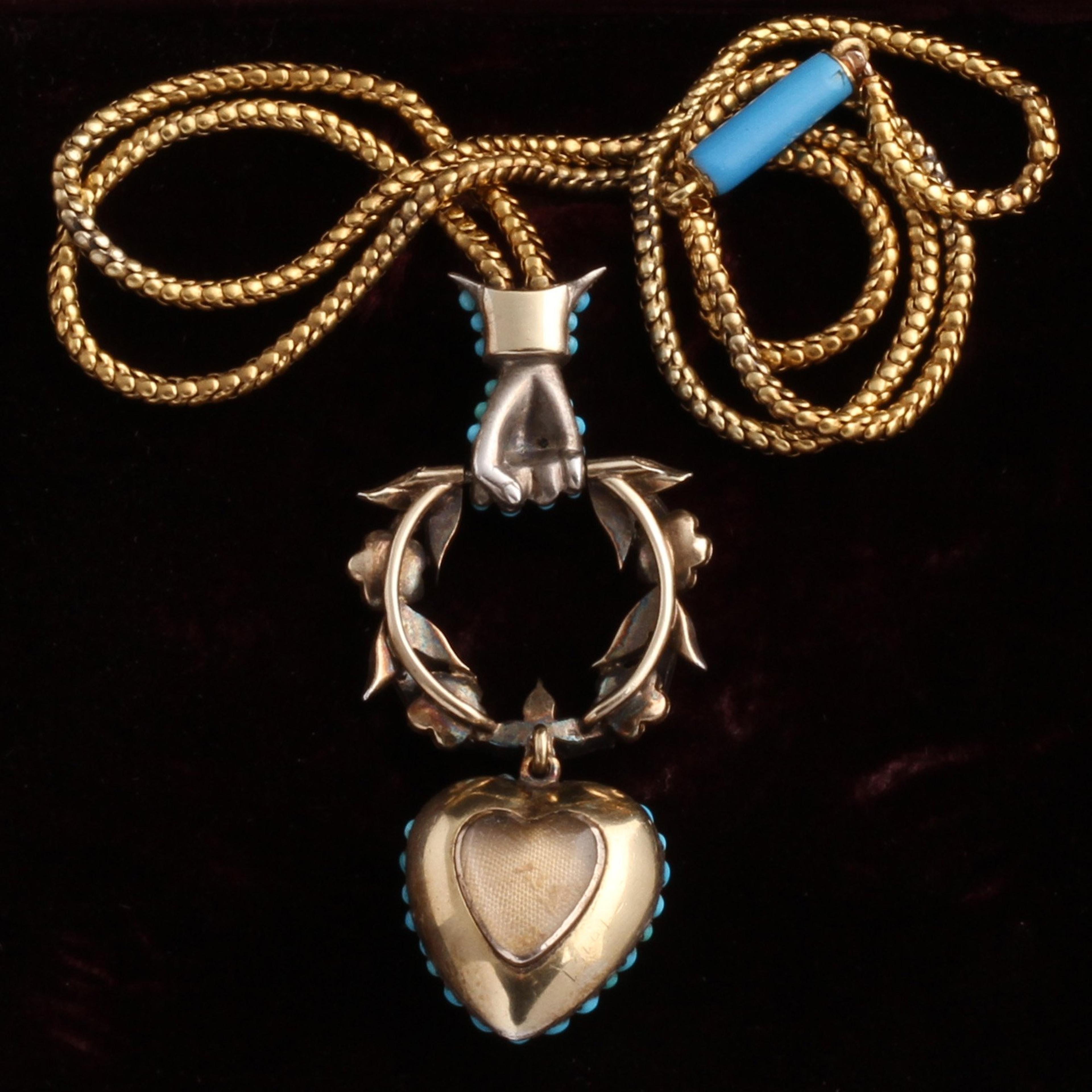 Victorian Turquoise and Diamond Hand Grasping Wreath and Heart Locket in Original Box