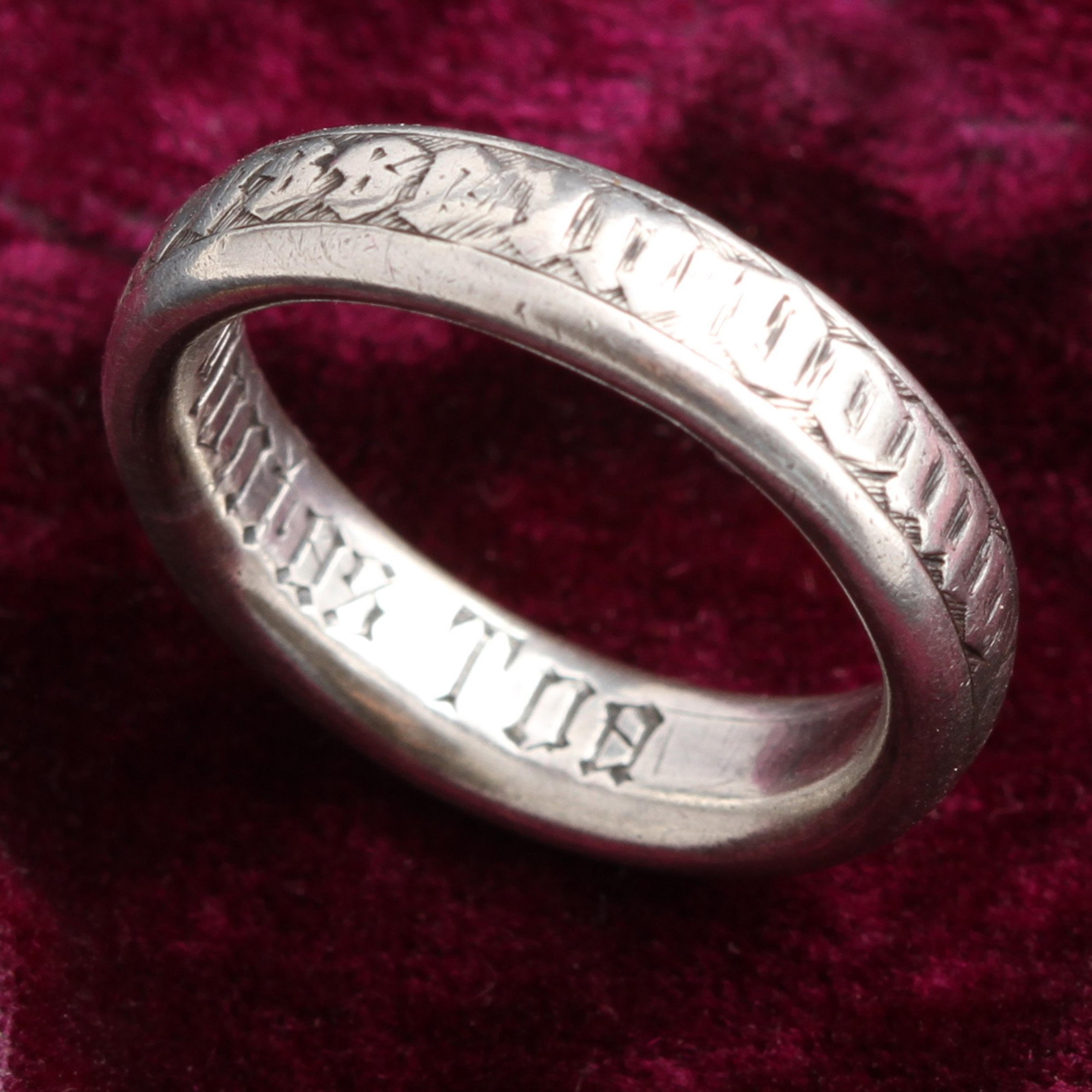 This rare silver ring belonged to an 18th century nun. She would have been given this ring when she took her vows and became a "Bride of Christ." Apparently, there was often an actual wedding ceremony that took place in which the nun-to-be donned bridal clothes including a white veil and was then given a wedding band such as this one. Ceremony complete, she would exchange her white veil for a black one and commence her new life of religious devotion. The exterior of the ring features a psalm in Latin rendered in Gothic lettering. It translates to "I have chosen to be neglected in the house of my God". The interior is engraved "Fiat Voluntas Tua" or "Thy will be done." The exterior is worn and the interior very crisp suggesting that this ring was probably never taken off.