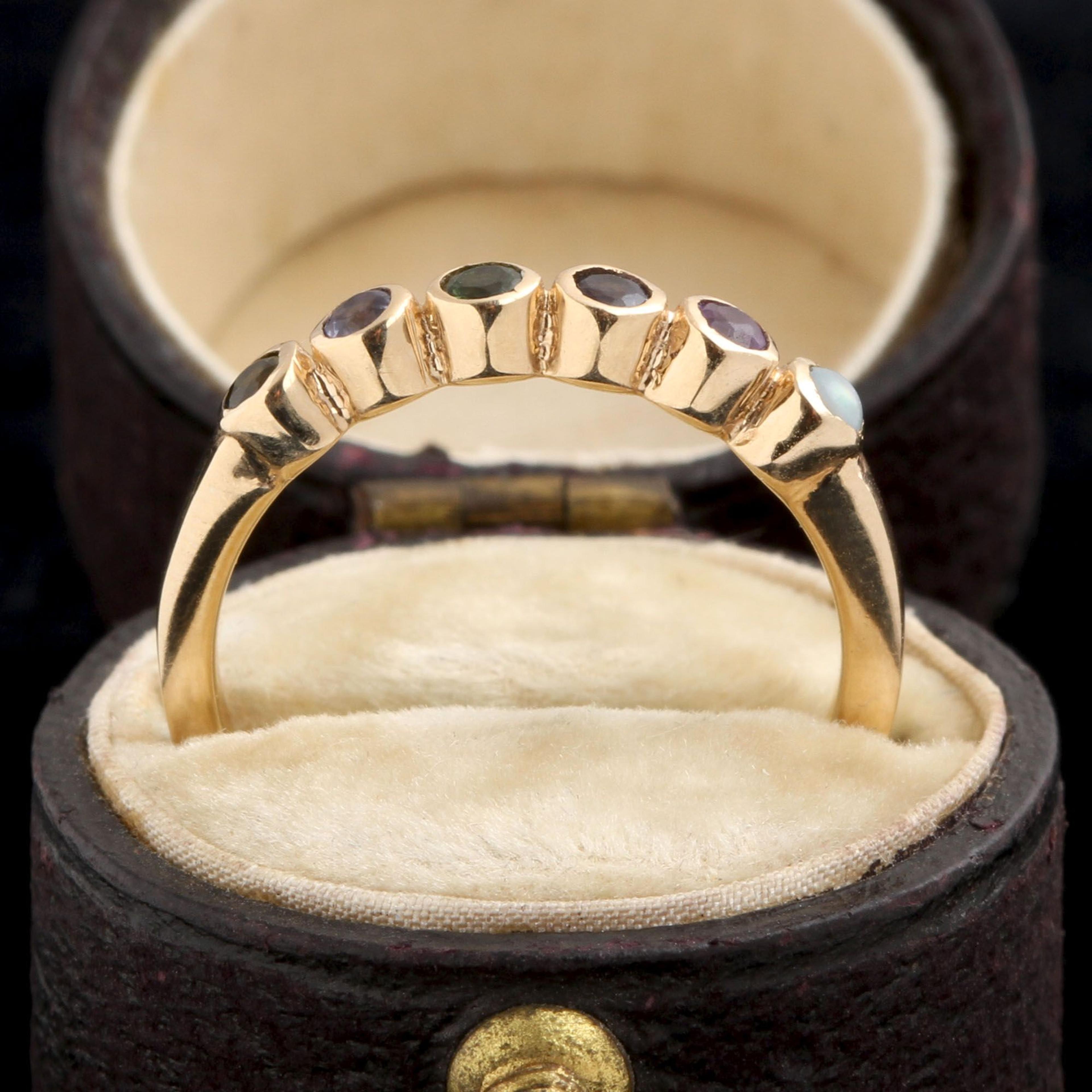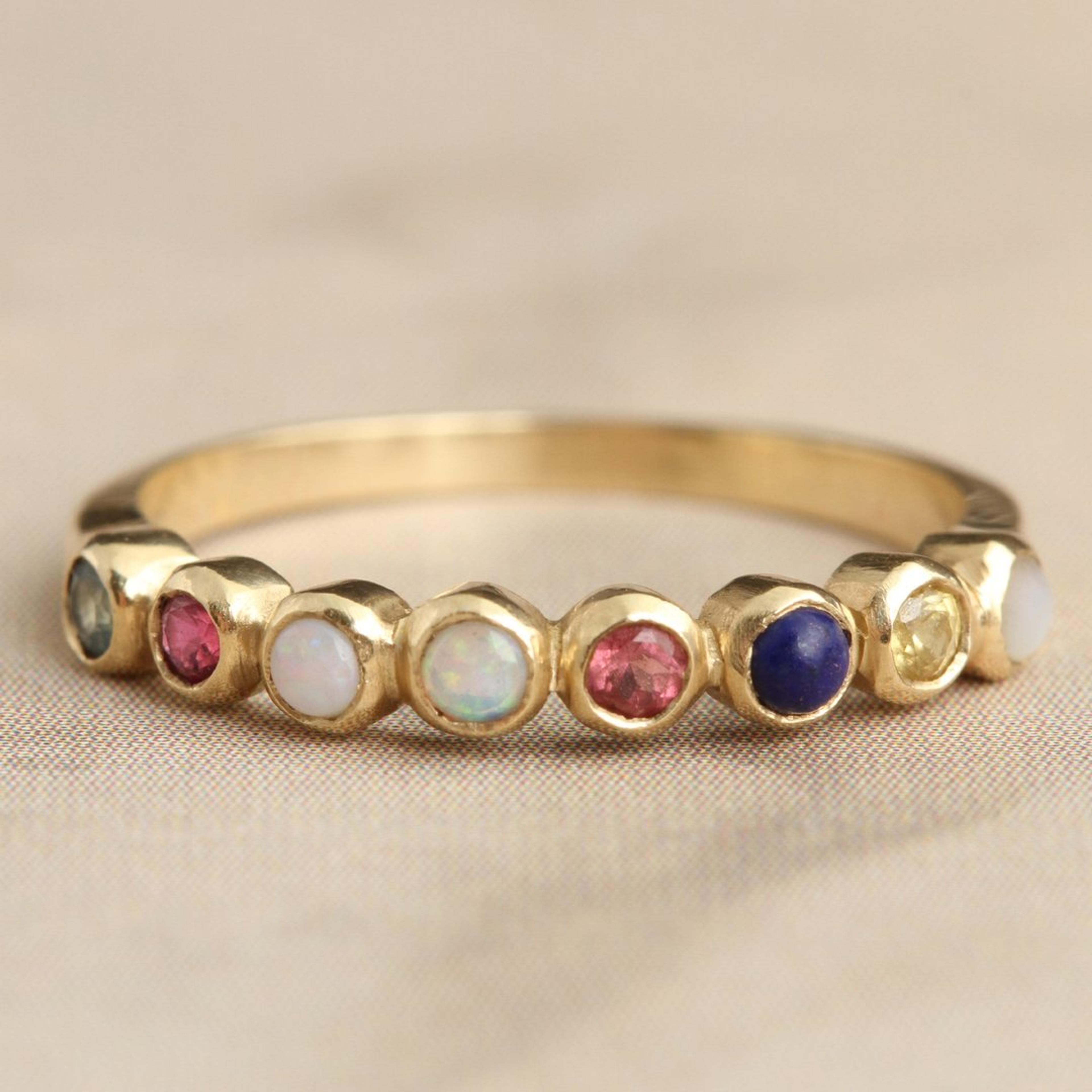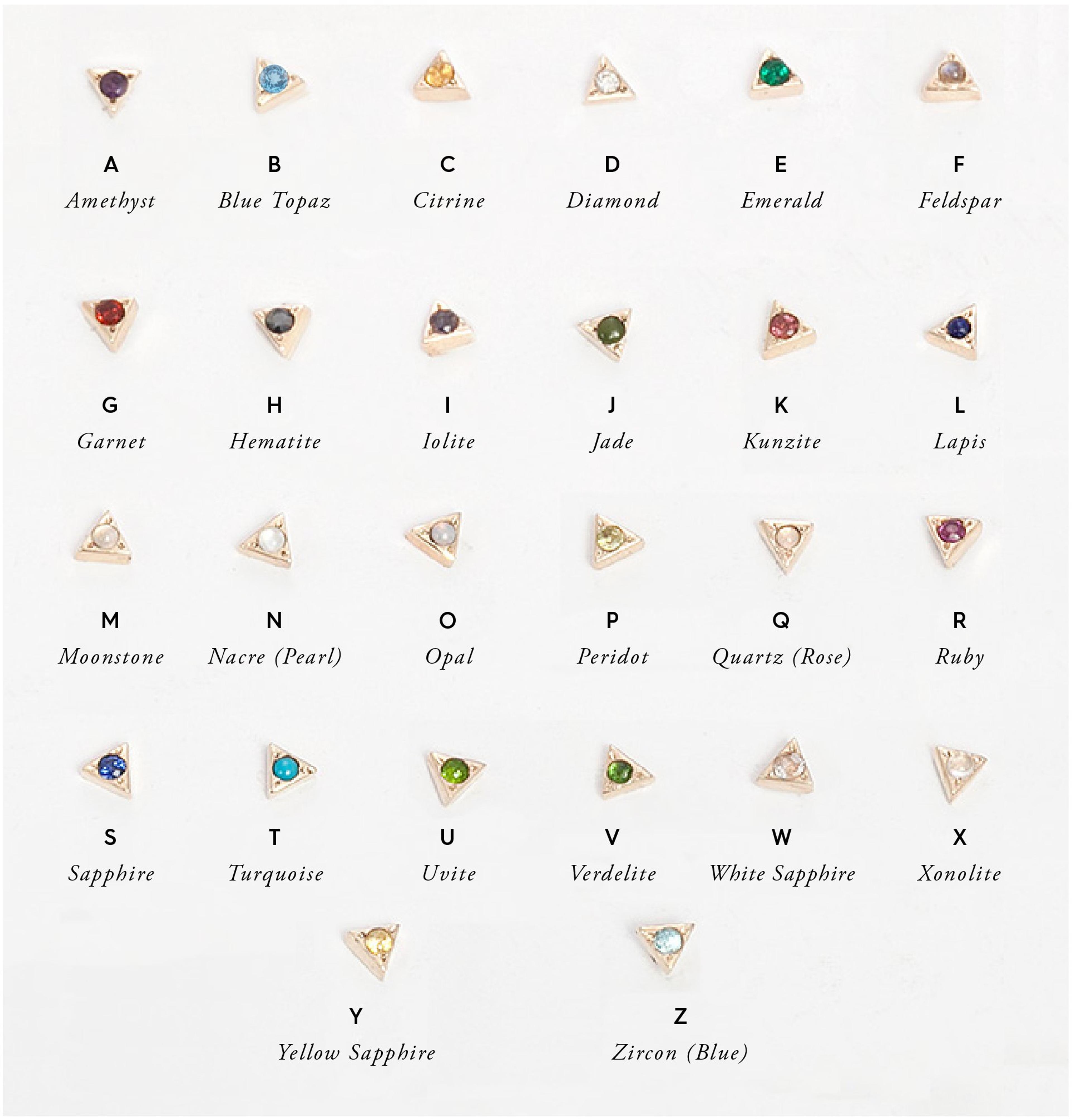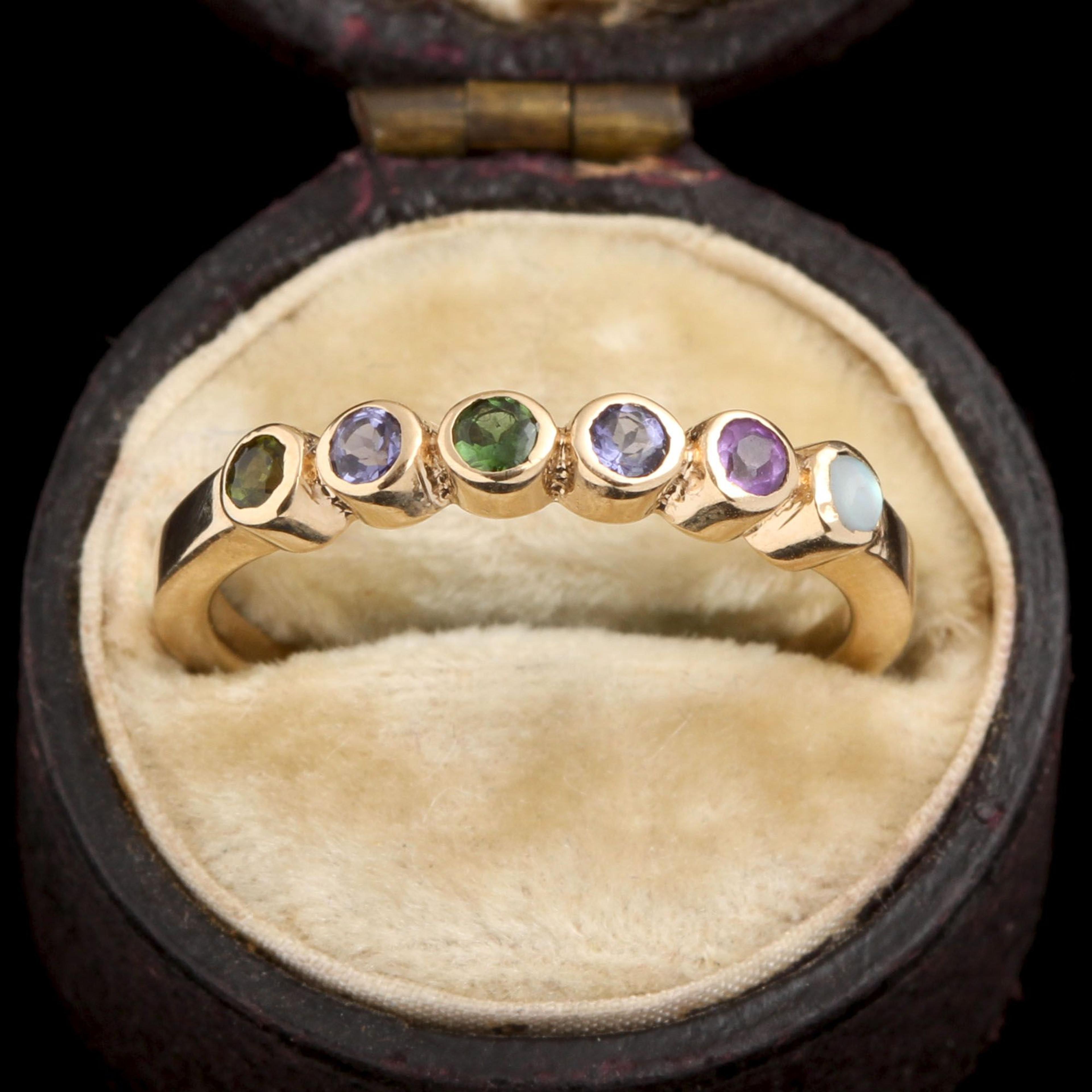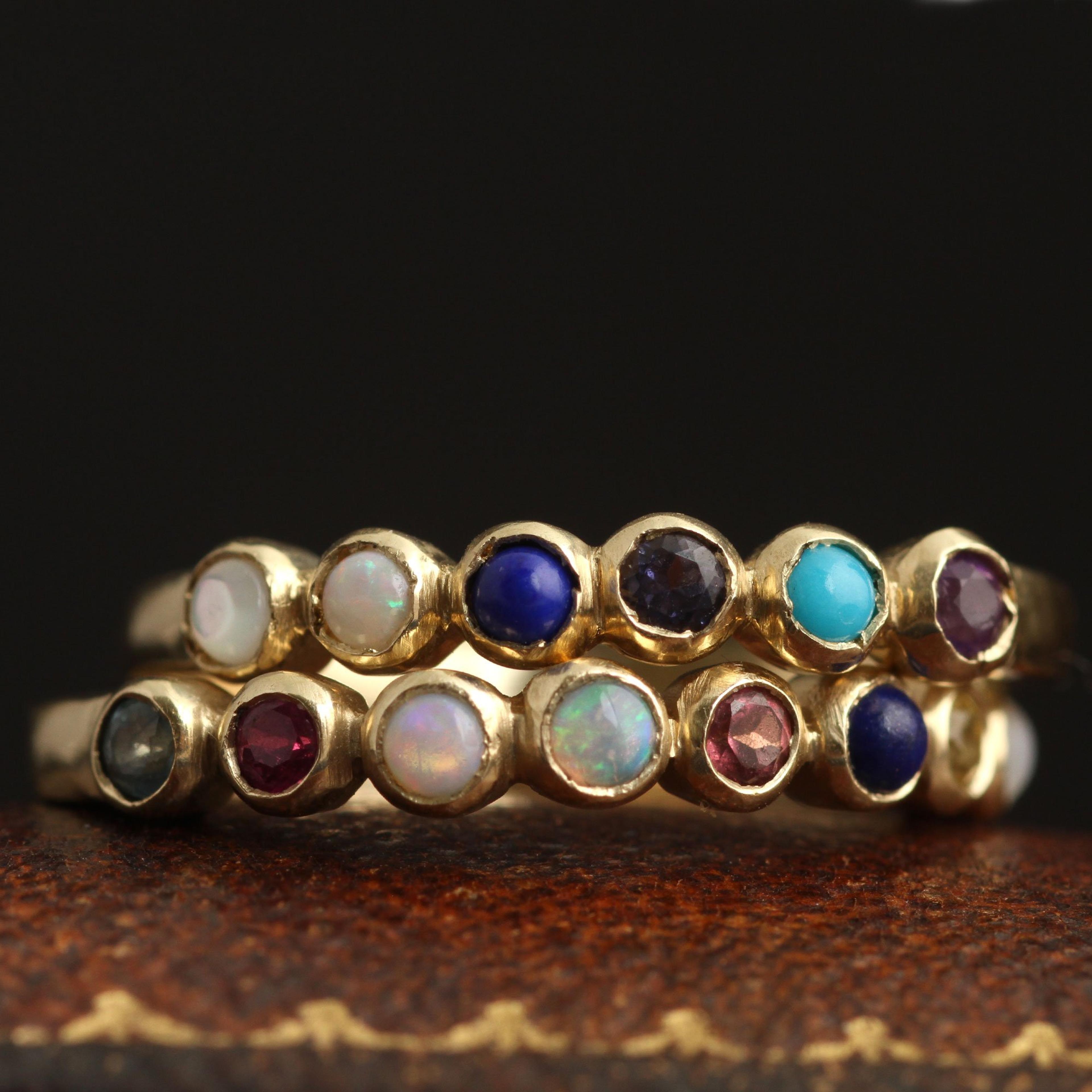 Please allow a full 6 weeks to make your ring. Now available in white, rose, or yellow gold! Intimate, colorful, and encoded acrostic jewelry first appeared in the early 1800's. Each letter of the alphabet was made to correspond with a different precious gemstone, and the so-called "secret language of gems" was born. For example, a Victorian favorite combo, "DEAREST", would be "spelled" this way: Diamond, Emerald, Amethyst, Ruby, Emerald, Sapphire, Turquoise. Get it? Our acrostic ring is a completely personal way to celebrate an important event, express a sentiment, or wear a loved one's name. Customize yours using our interactive stone-picker - we won't tell a soul what it says.