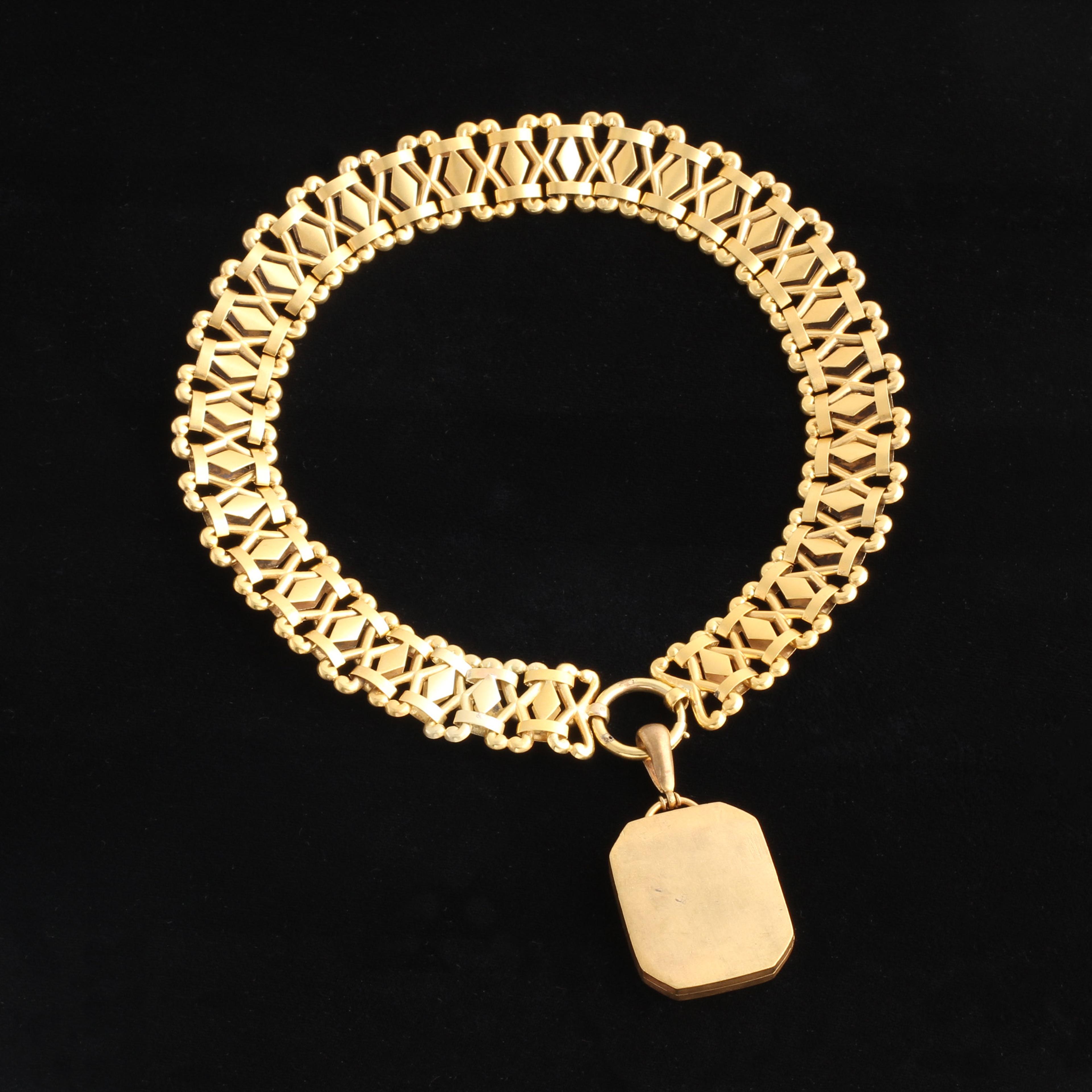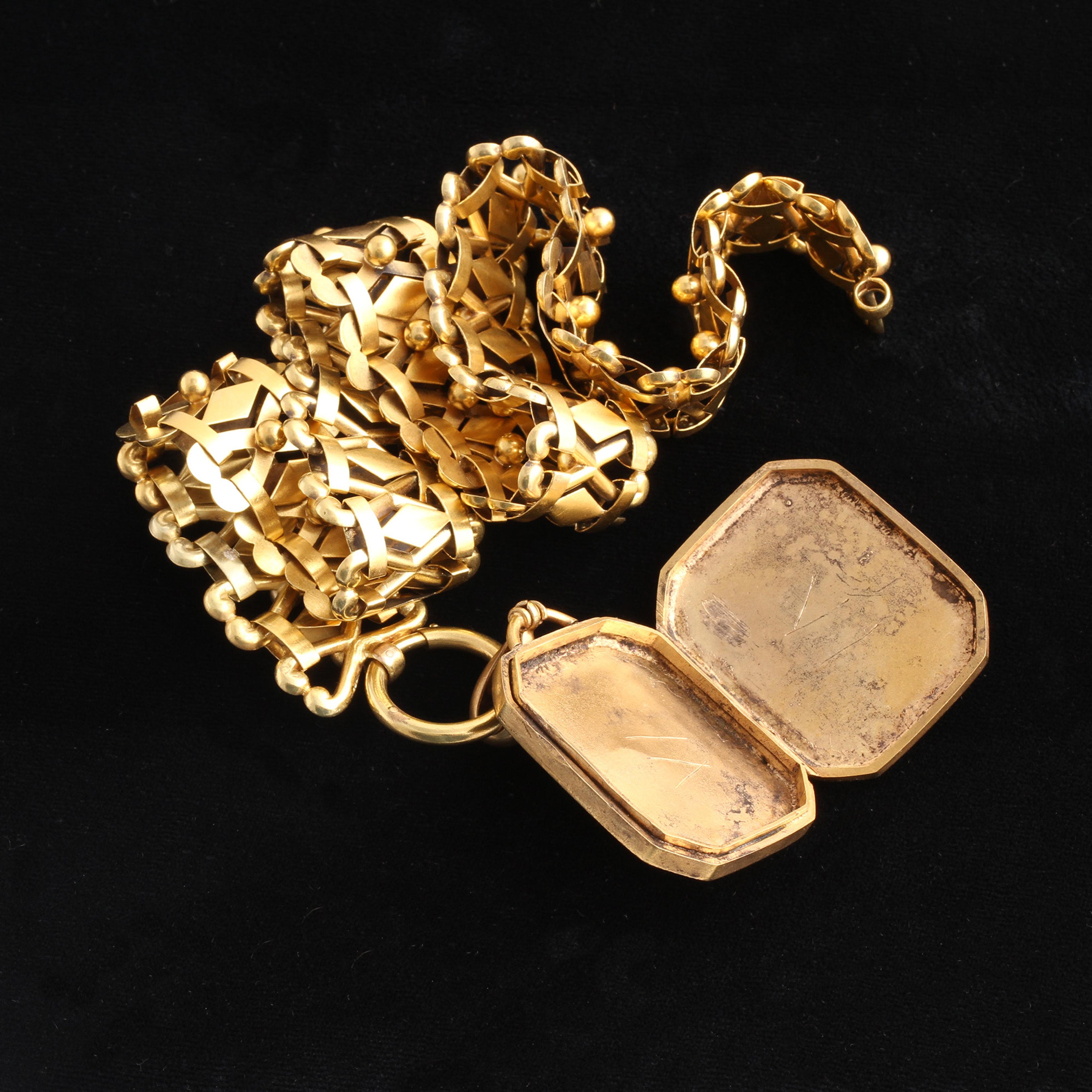 Collar necklaces such as this one were at the height of fashion toward the end of the Victorian era. This c. 1880 necklace is a product of the Victorian era's Aesthetic Movement, a period known for its whimsical designs and minimal renderings of Far Eastern nature scenes. Fashioned in pinchbeck (highly unusual as this style is nearly always seen in silver), the collar is a fancy heavy link chain with scalloped edges. The large octagonal locket features a naturalistic tranche de vie depicting an exquisitely rendered heron at the edge of a pond.