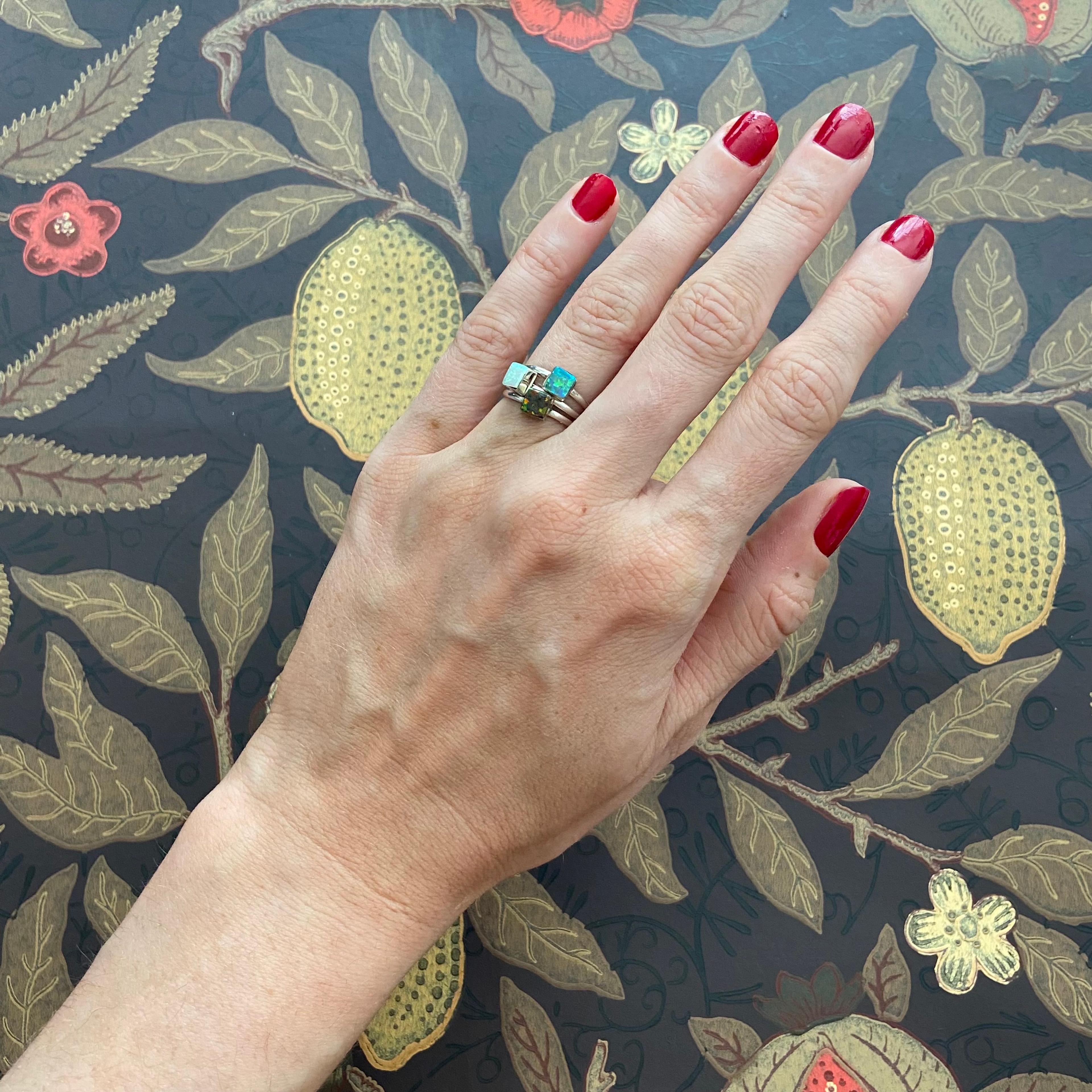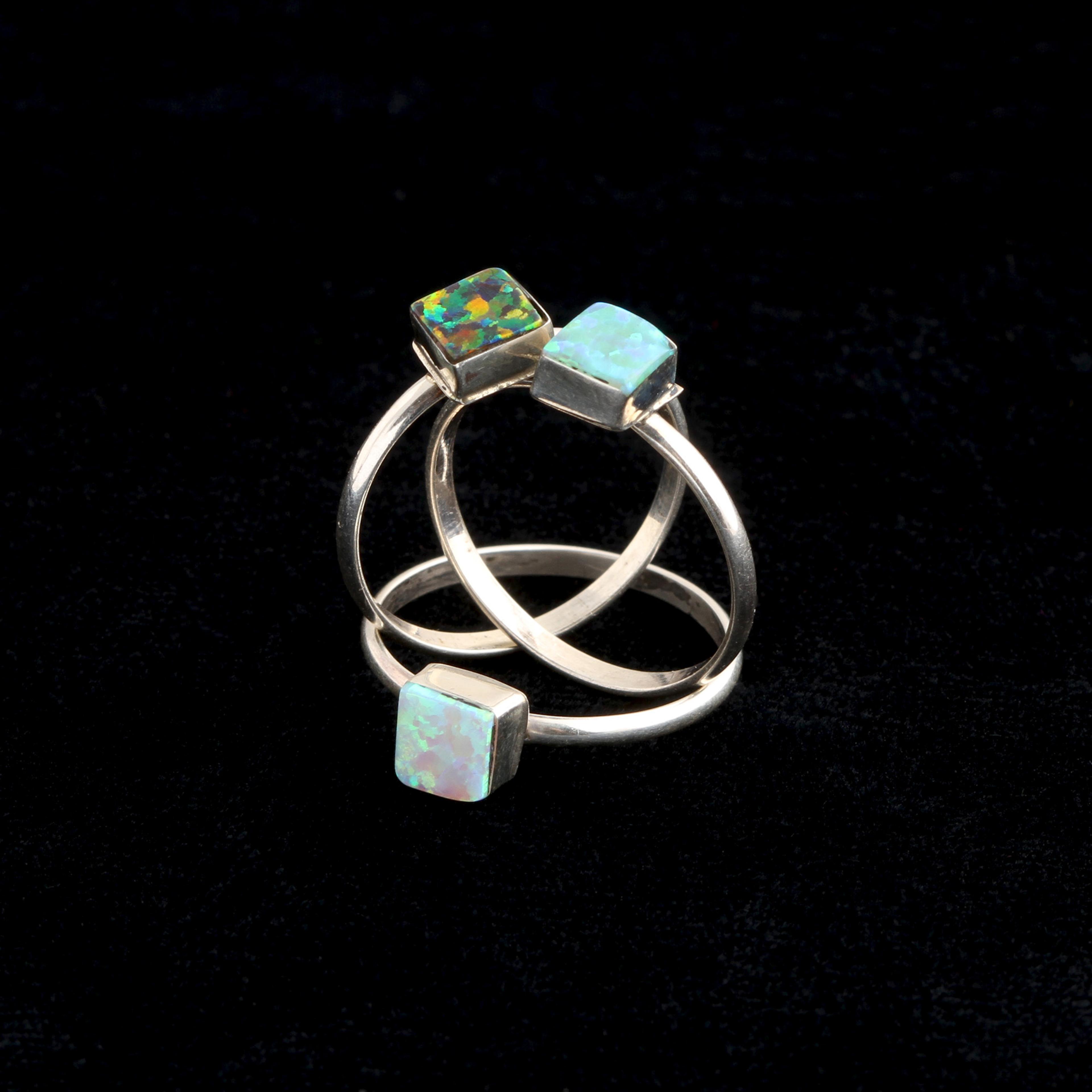 In addition to being gorgeous, opals are reputed to have healing properties and the ability to stimulate the creative imagination. These silver rings boast glittering rainbow stones and an easy-to-wear flat profile. We designed them as a variation on our isosceles opal studs, which are our most popular earrings of all time. Pick your color and size above - the price is for one ring, but as you can see, they look great stacked.