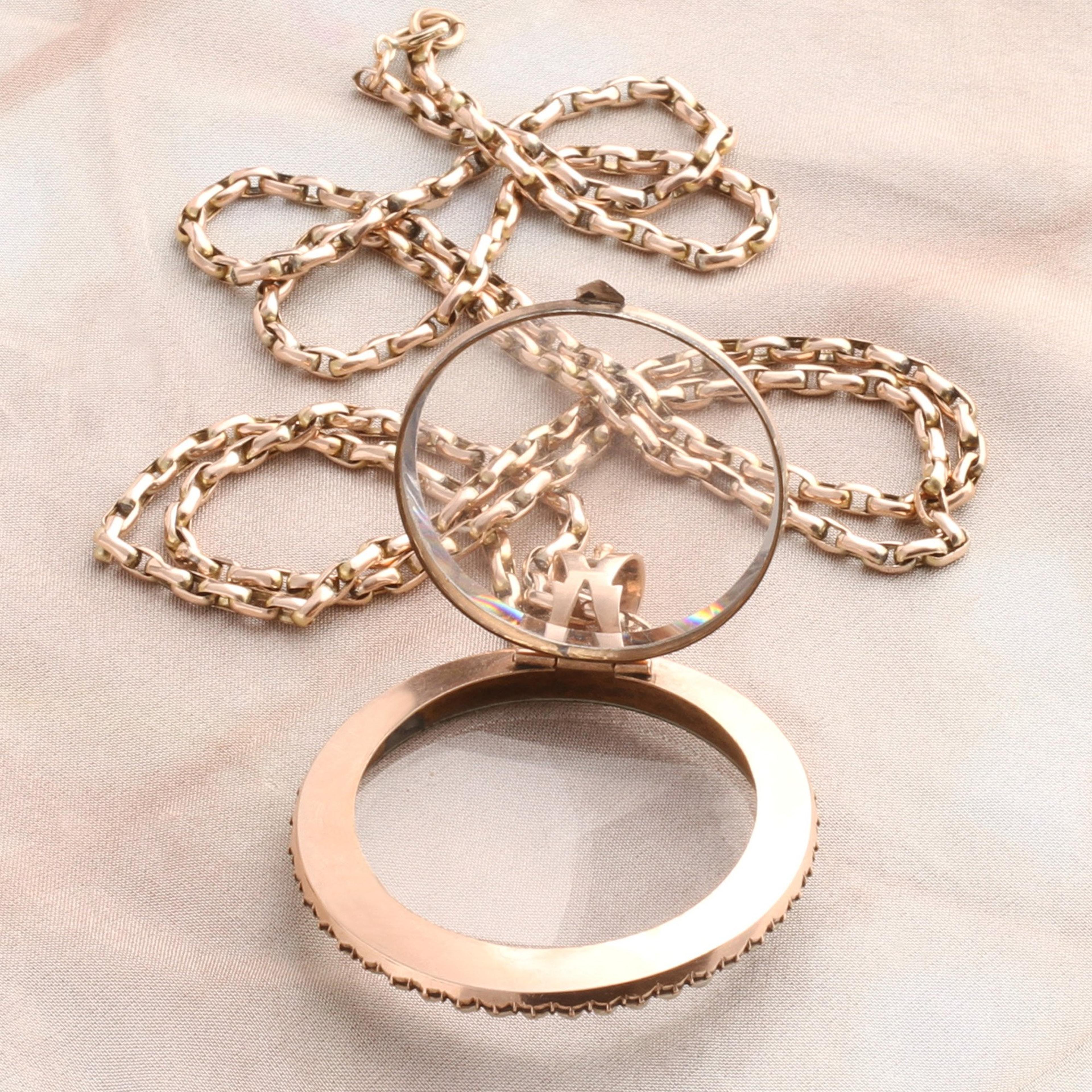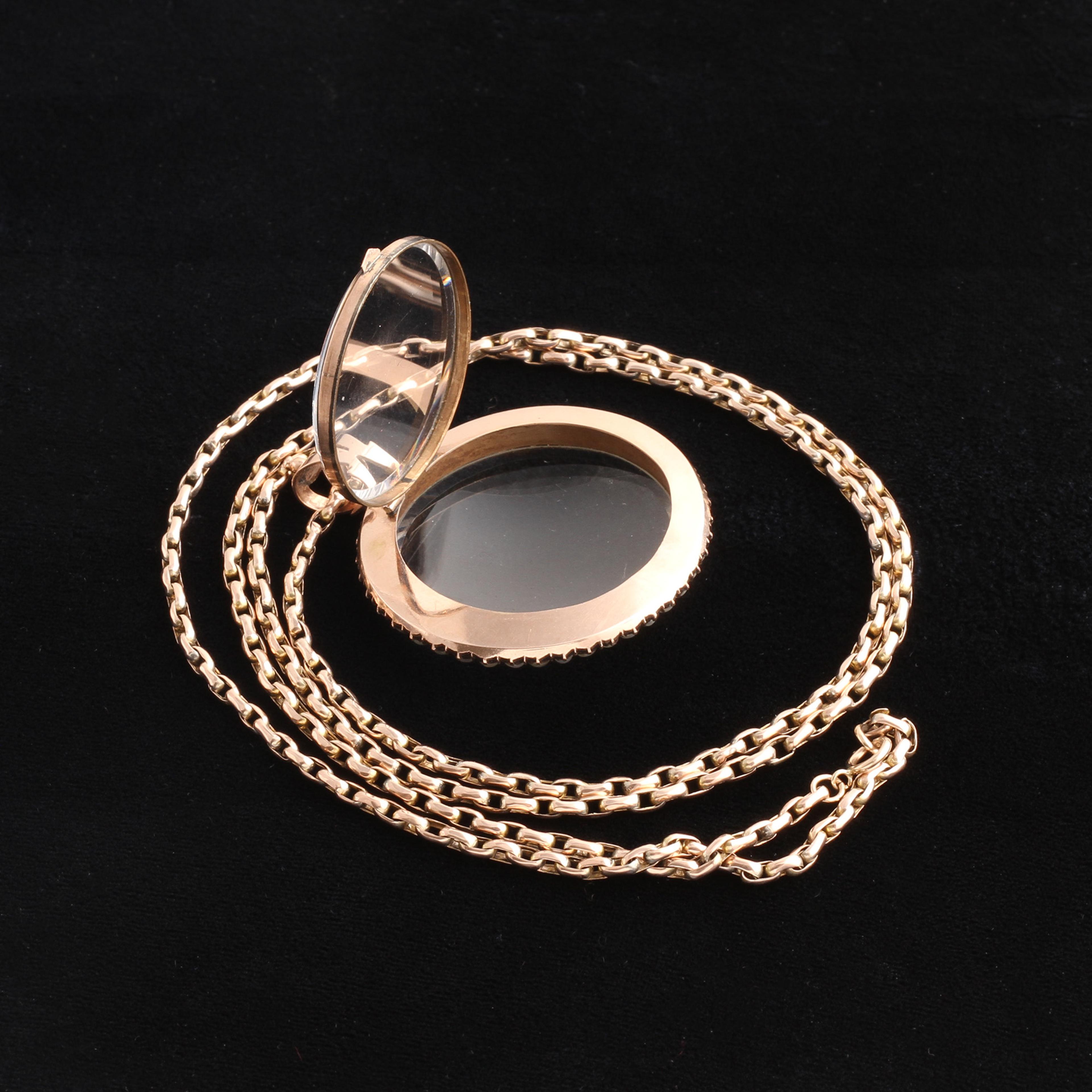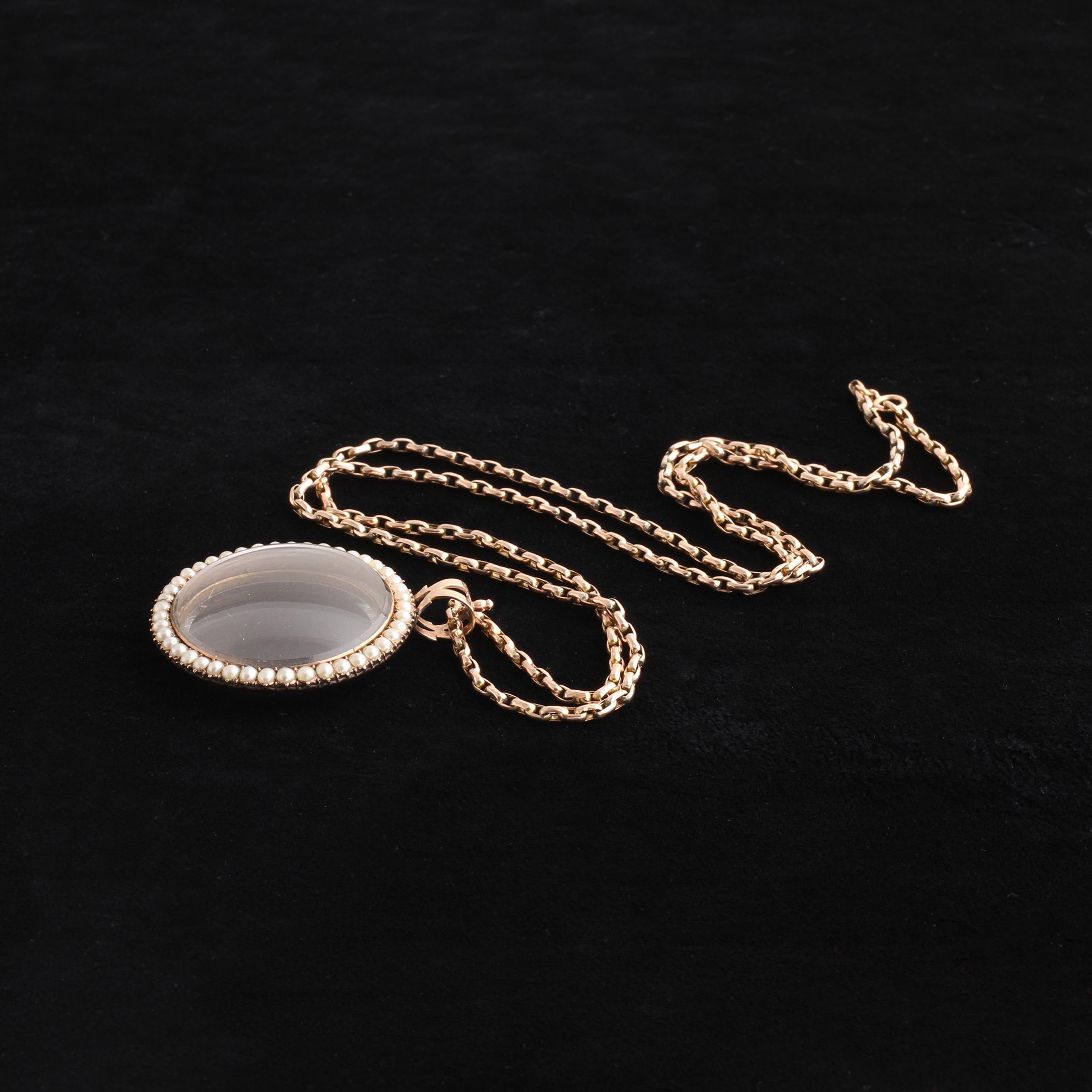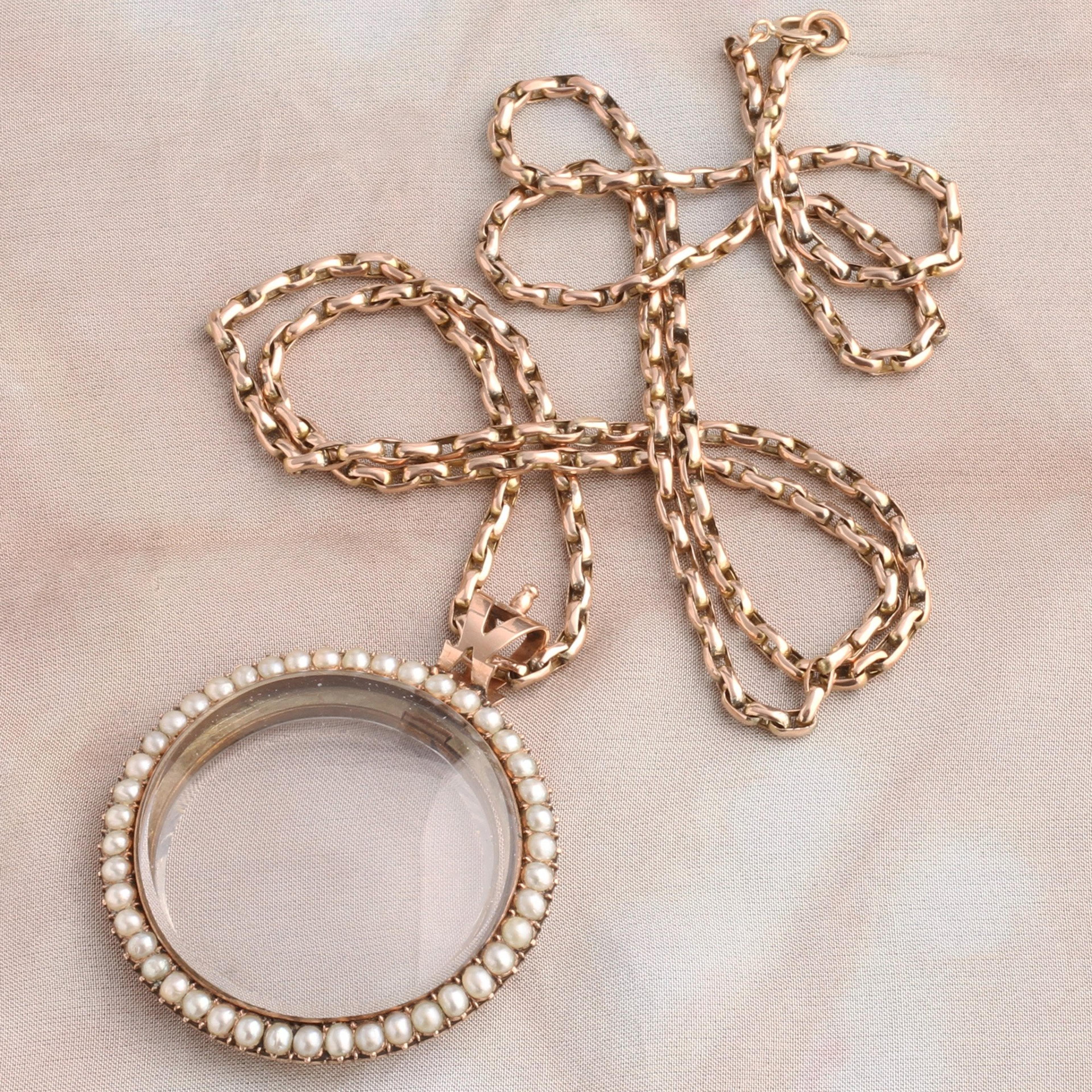 This gorgeous large-scale locket is fashioned in subtle rose gold with an ornate bale and lustrous seed pearl frame. The face of the locket is set with a beveled glass lens, and the reverse features a hinged glass locket panel. We've added a heavy, long Victorian rose gold cable chain to complete the period look.