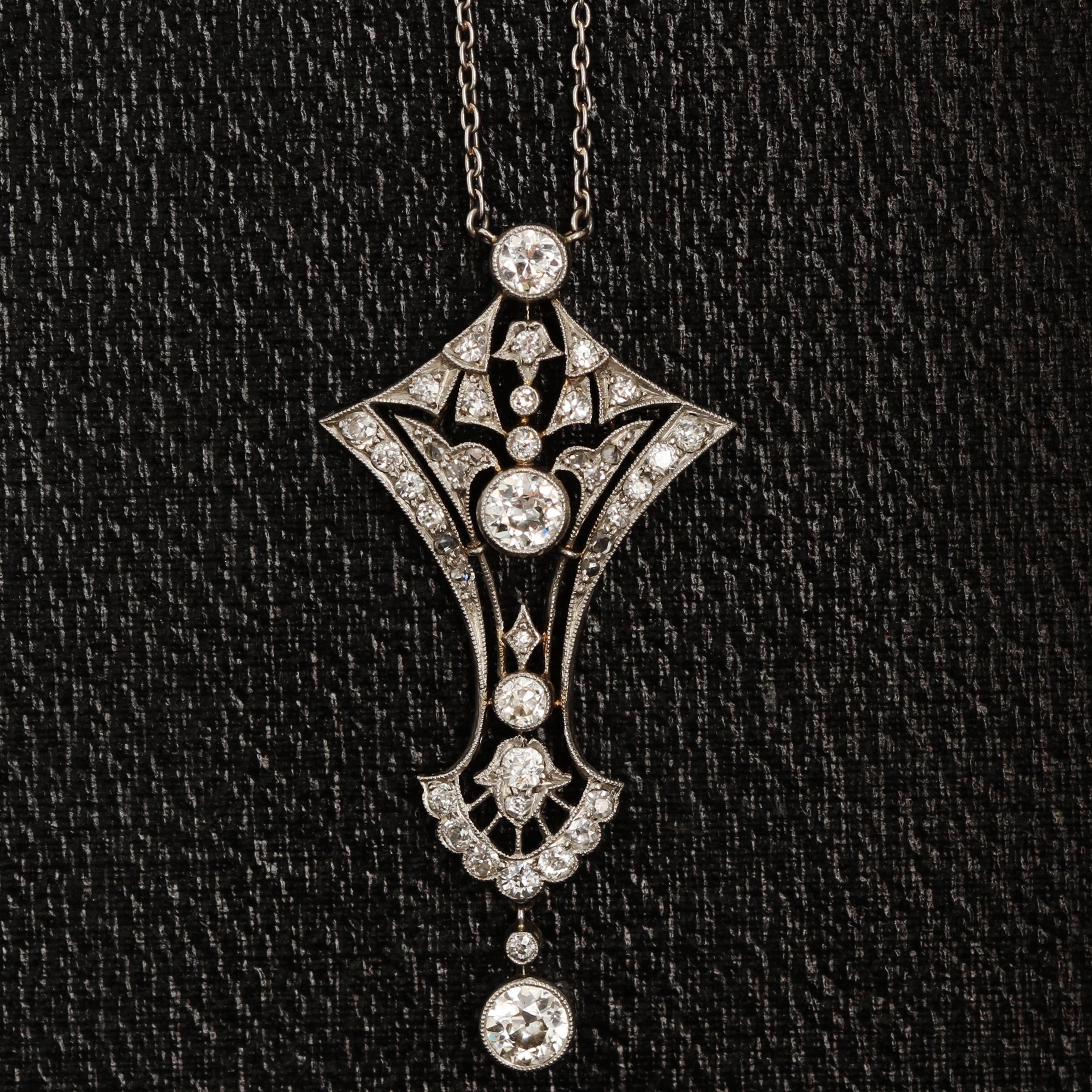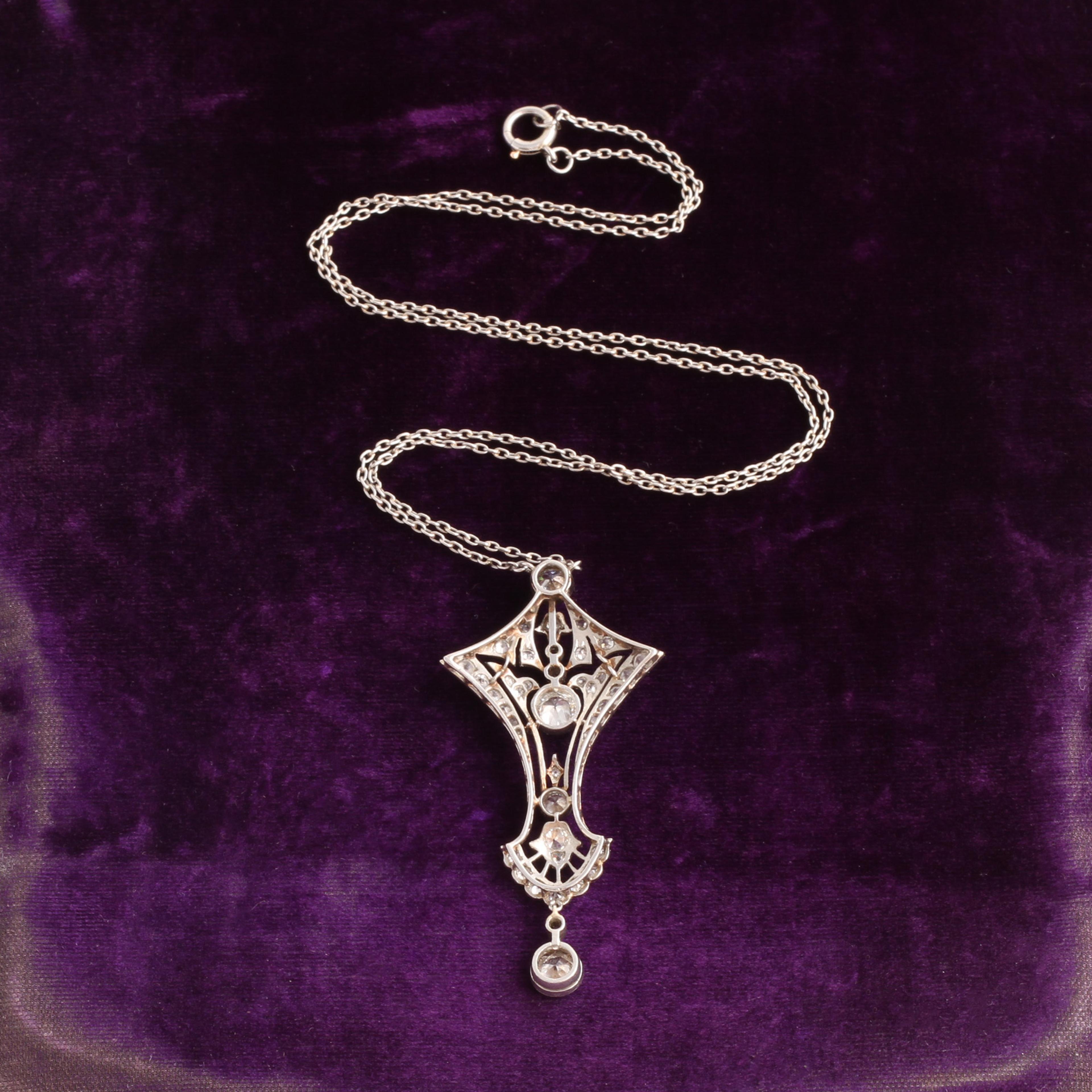 Platinum, approximately 2ctw diamonds (old Euros largest from top: .17ct, .29ct, .10ct, .33ct; 8 x .04ct, 21 x .03ct; 8 x 1mm rose cut diamonds).