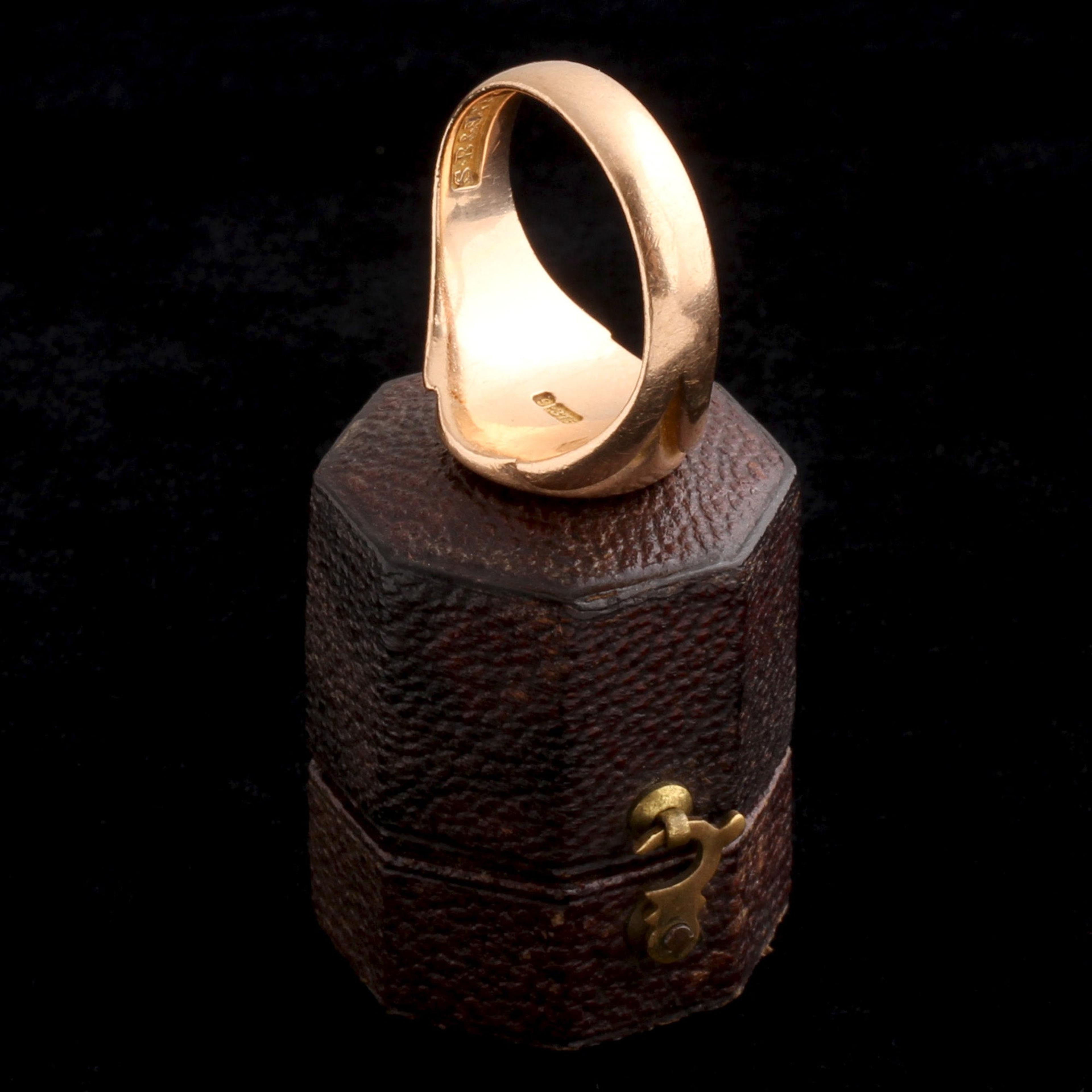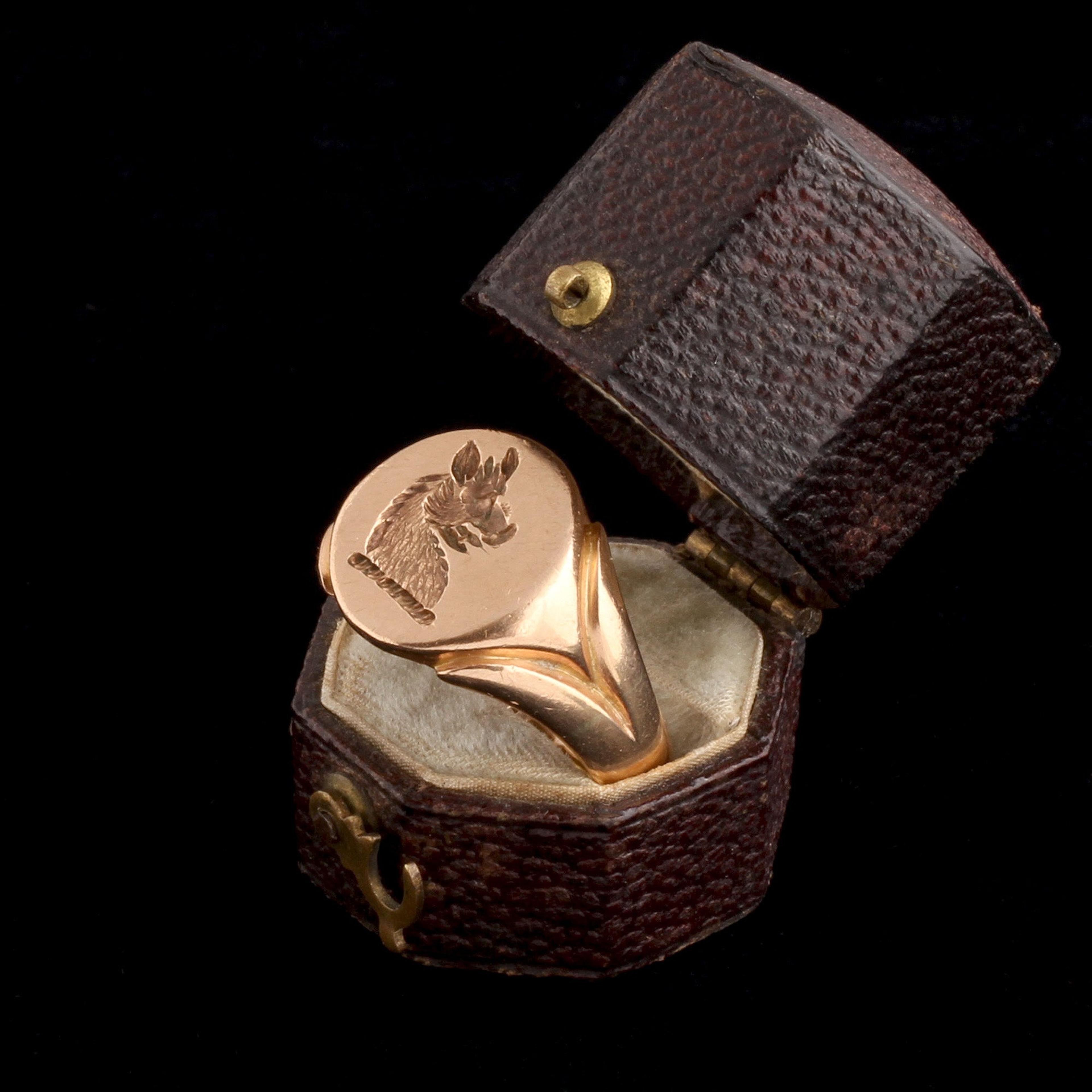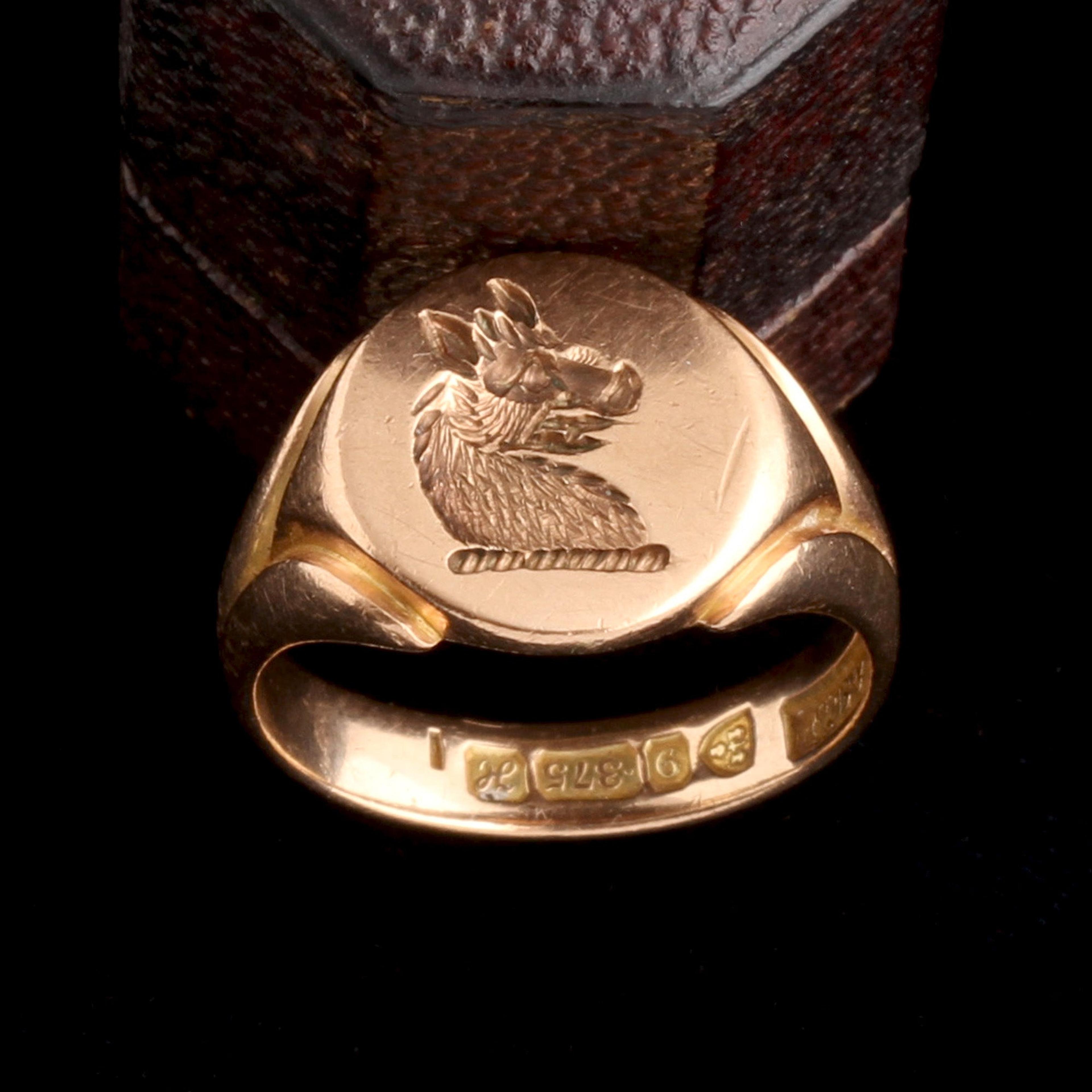 Signet derives from the Latin word “signum” translating to “sign” (as in signature). The oldest signet rings were carved with a distinctive emblem that was used as a signature on documents and letters. Until the invention of the mail system and the stamp, signet rings incised with a family crest, initials or other image were still used to form wax seals on correspondence. This Edwardian signet ring is made in 9k gold and features a heraldic boar (a beast that features in the crests of so many families that it's hard to say for certain who it belongs to). British hallmarks.