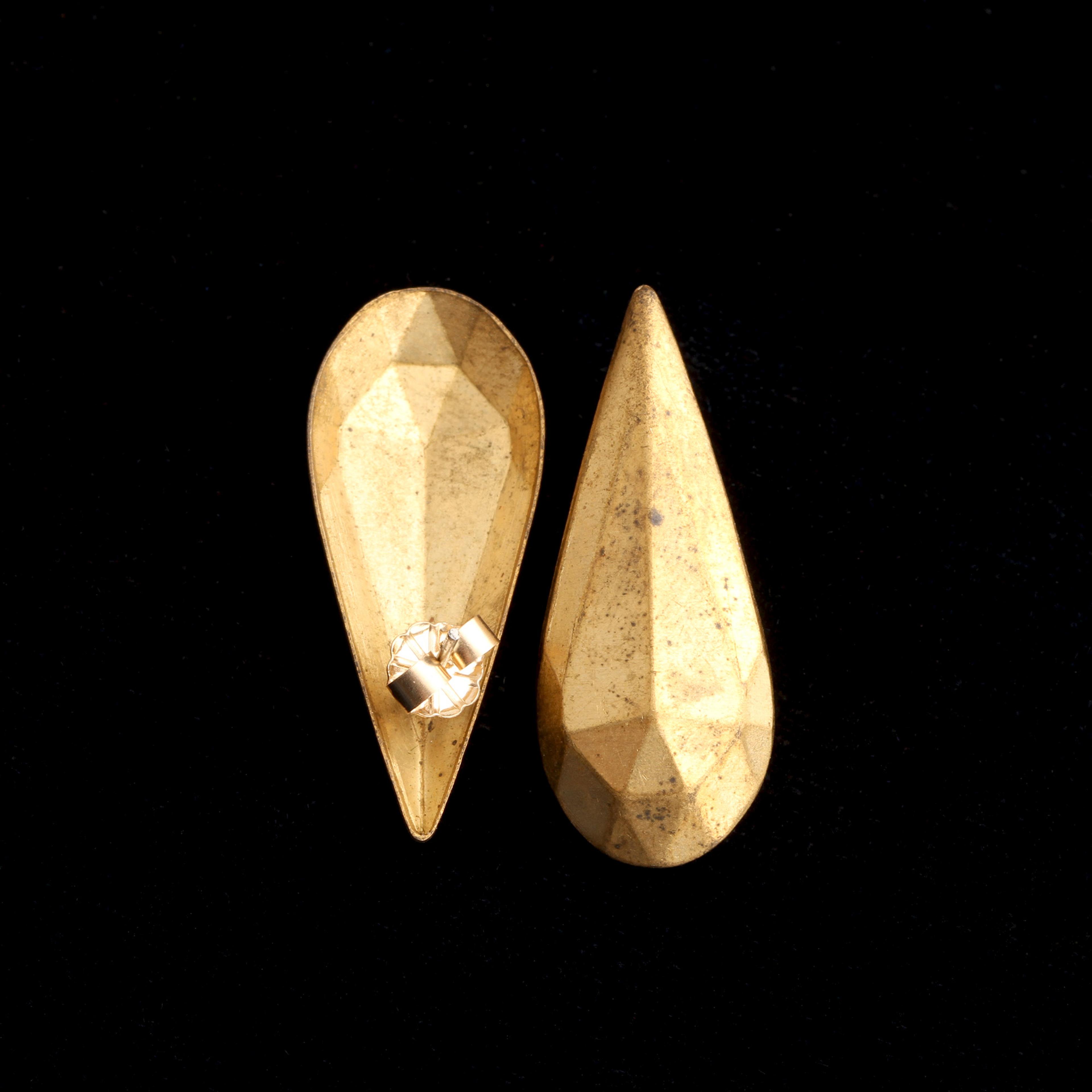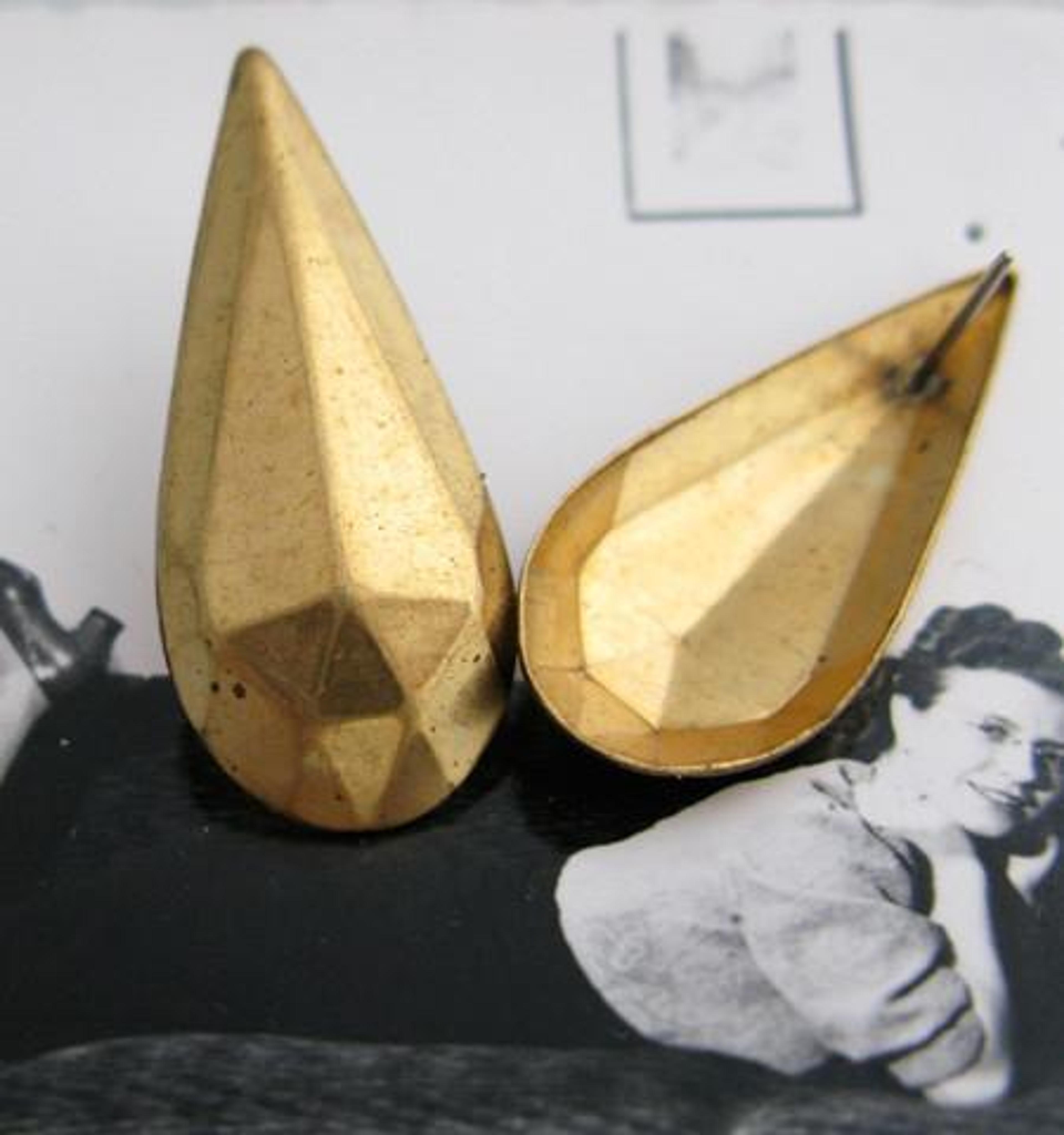 These domed teardrops are lightweight but oversized. Their brass surfaces were probably glamorously shiny once, but they've been allowed to oxidize naturally over the years. Tiny blemishes, dull spots, and other irregularities should be considered part of your earrings' unique character. Since they're 1960's-era vintage, we can't be sure what type of metal the posts are, but our hunch is that they're stainless or surgical steel. They have been carefully cleaned and new 14K gold-plated backs have been added.