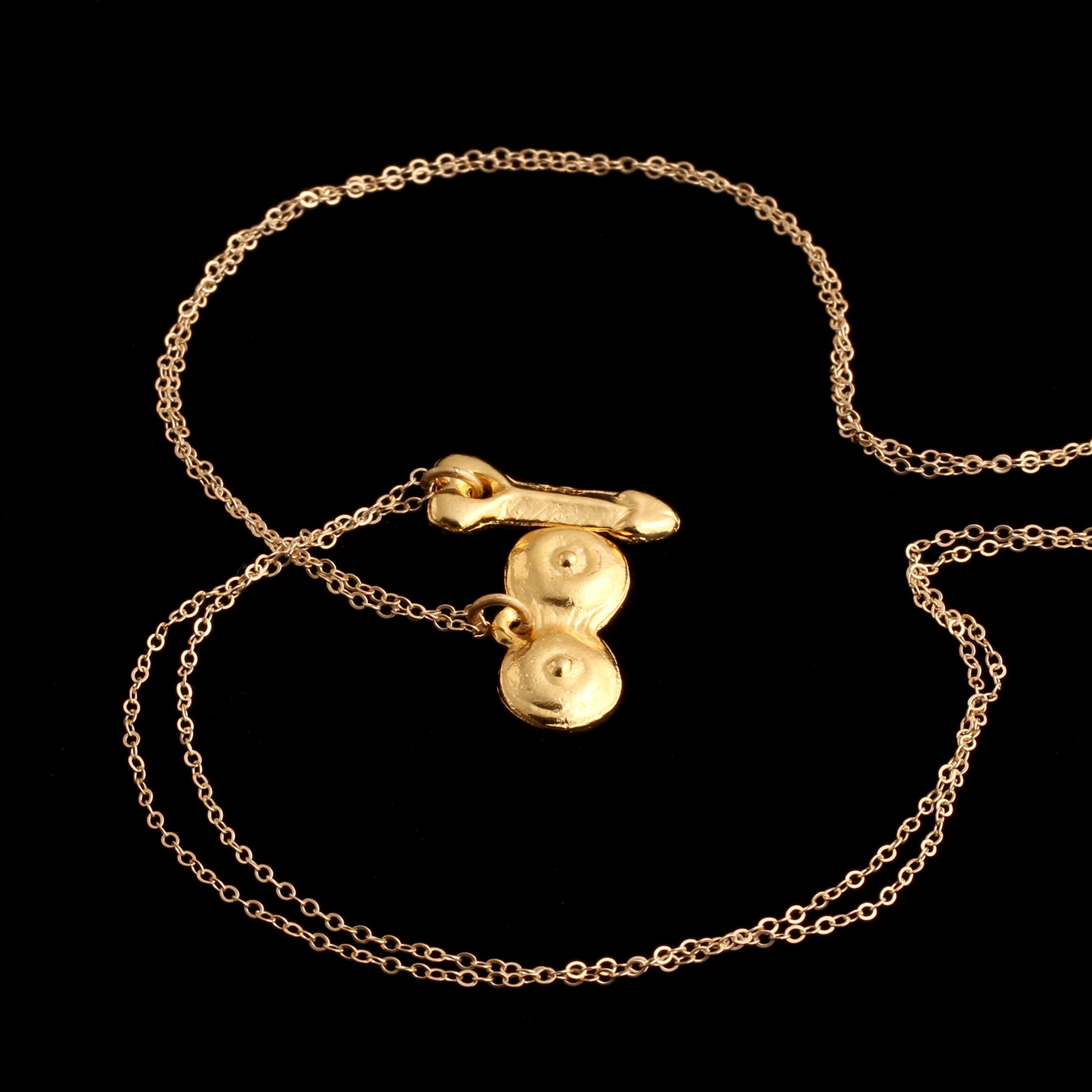 Hand-carved in wax here in our studio, then cast in aluminum and dipped in 14k gold, these amulets will serve you well if you are in pursuit of love, sex, sexual health, fertility, dicks, boobs, or compliments. The design is inspired by milagros (or "ex-votos"), religious folk charms used for prayer in Mexico and Latin America. The little sculptures often represent a body part - for example, a leg - which could be used as a plea to a saint for the improvement of an injured leg. But the leg could refer to something more abstract, like the concept of travel. Just as a heart-shaped milagro could represent a cardiac condition or a romance, these male and female talismans will no doubt hold their own powerful meanings for you.