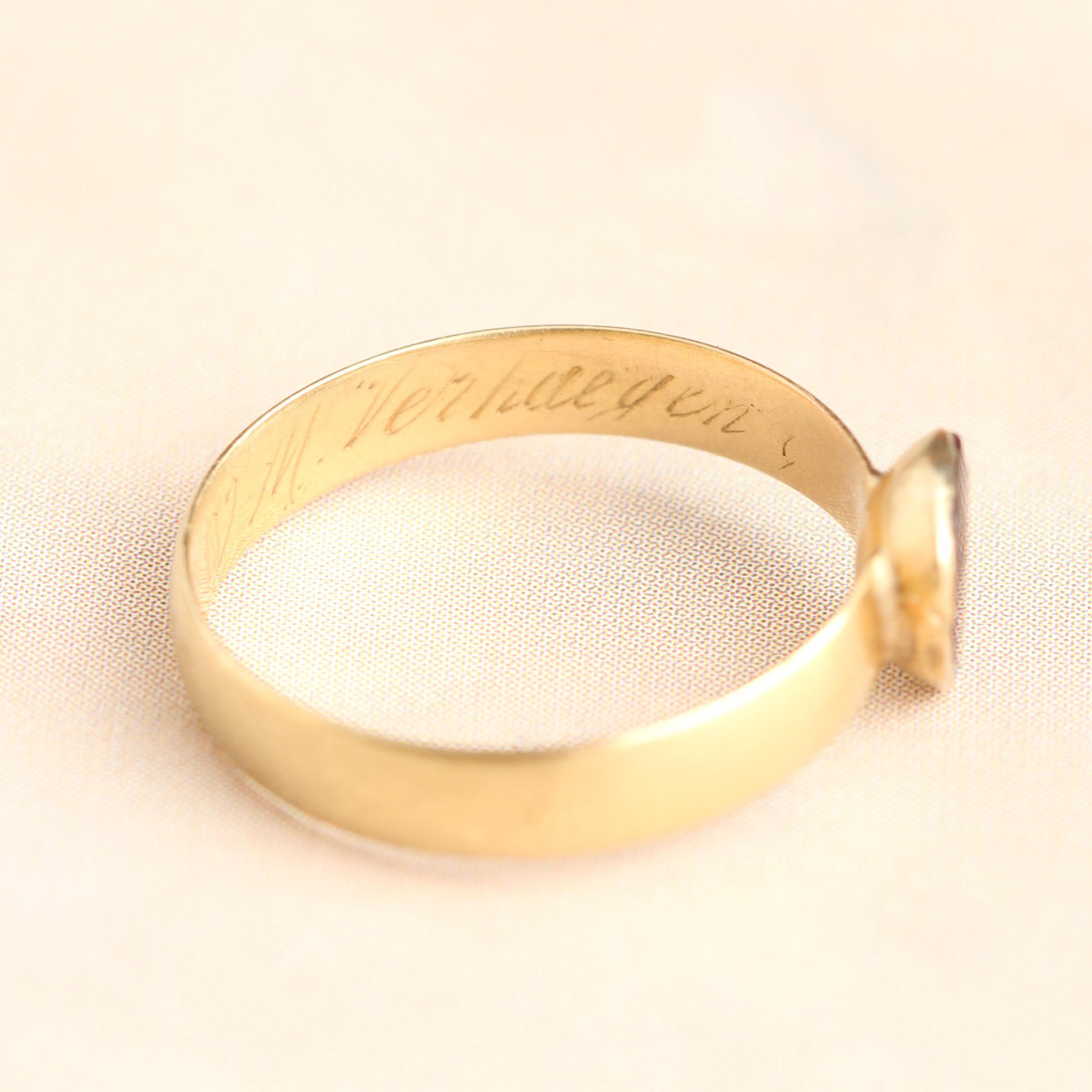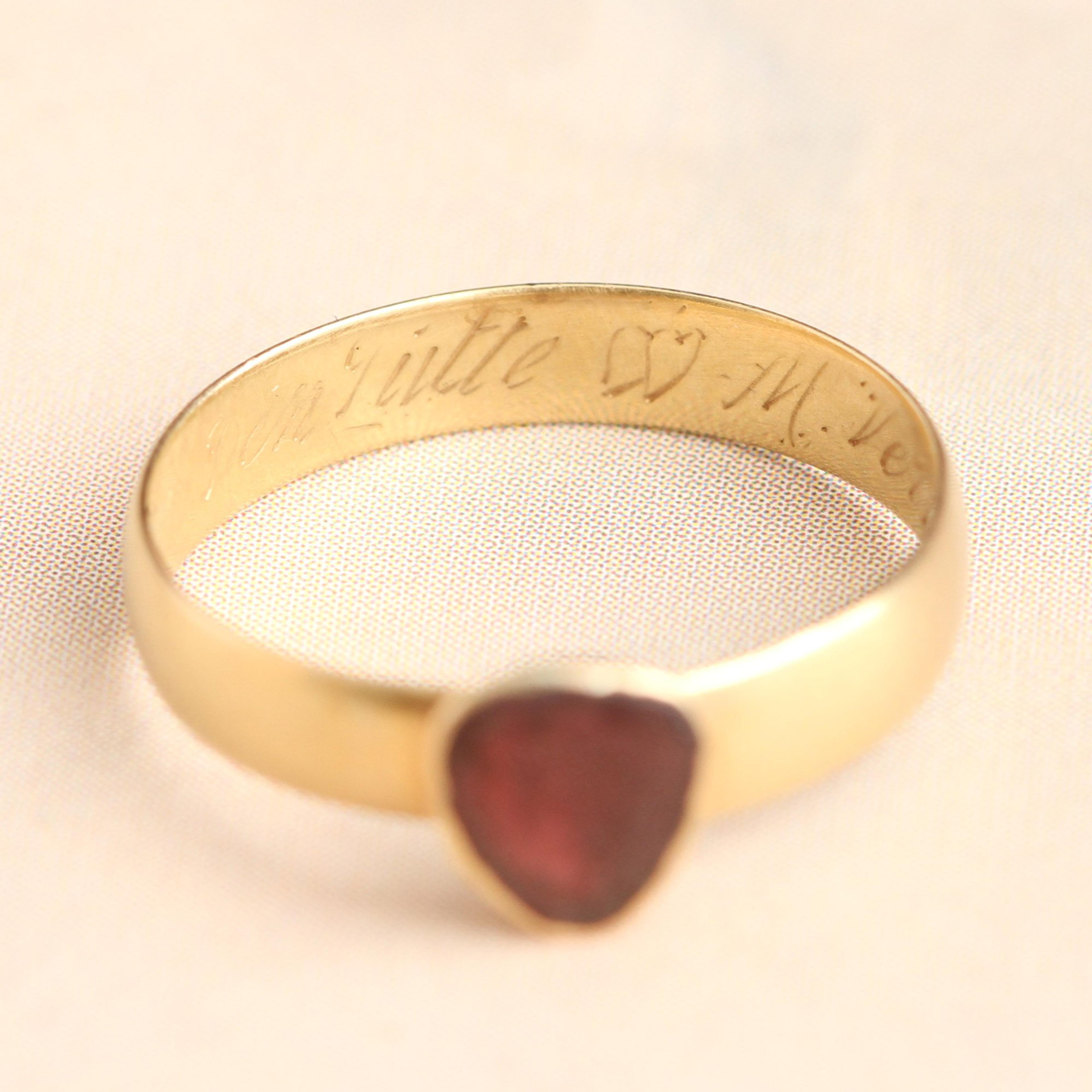This 19th century betrothal ring is fashioned 18k gold with a garnet heart in a closed back setting. The pear-shaped cut of this crimson gem was used��to represent the heart for more than a century before it was eclipsed by the cleft heart we use today. The style of this Belgian (technically Flemmish) ring looks early 19th century, but if our research is accurate, it was actually made in (or around) the year 1847. How do we know this lovely garnet heart engagement ring comes from Belgium? Well, the interior is engraved with "Mgr [Monseigneur] Van Den Putte <3<3 (two overlapping hearts) M. Verhaegen." We were able to trace these Flemmish surnames to Felix Van Den Putte and Anna Maria Verhaegen who were married in Antwerp on February 3, 1847. This very special ring is a size 6 and cannot be resized without marring the engraving.