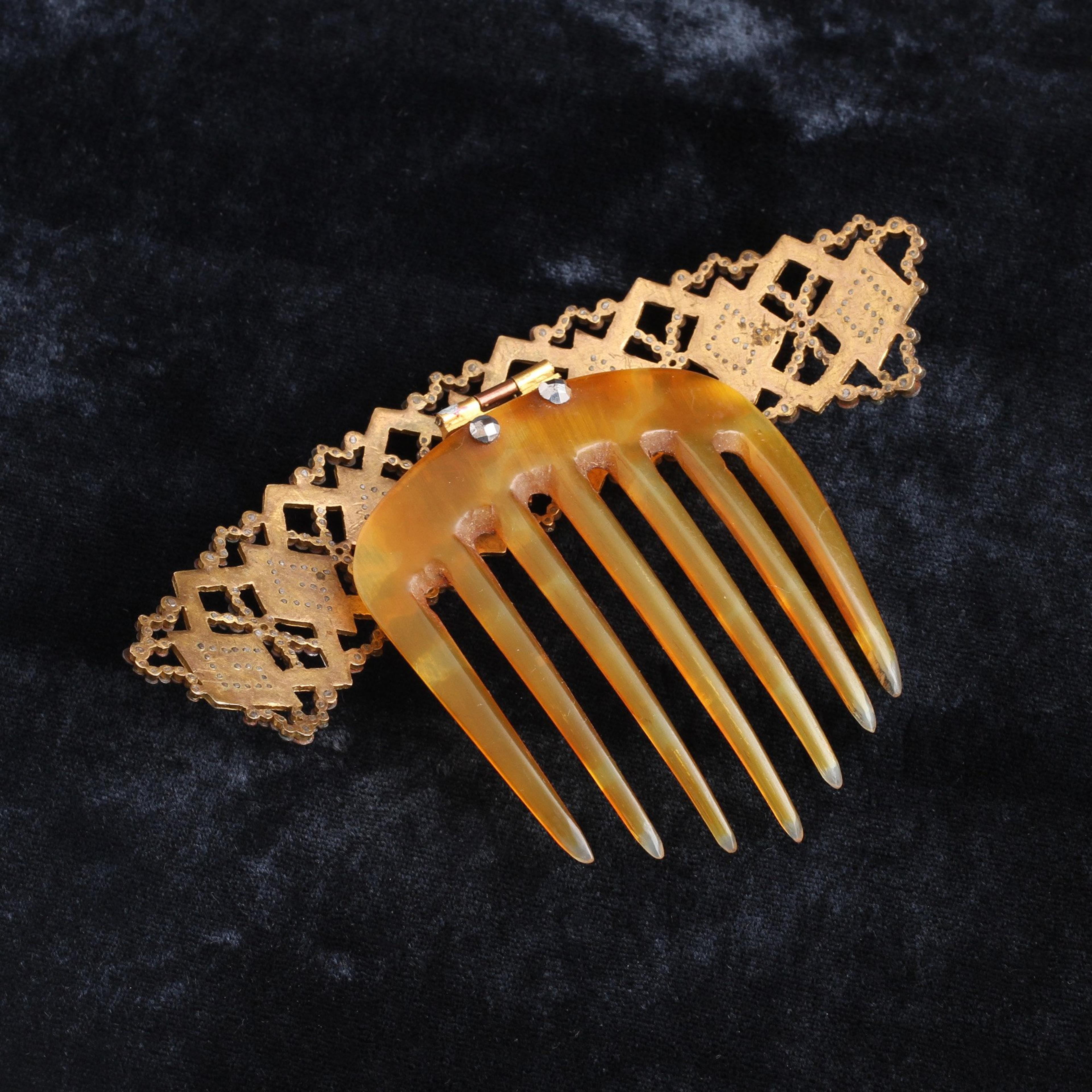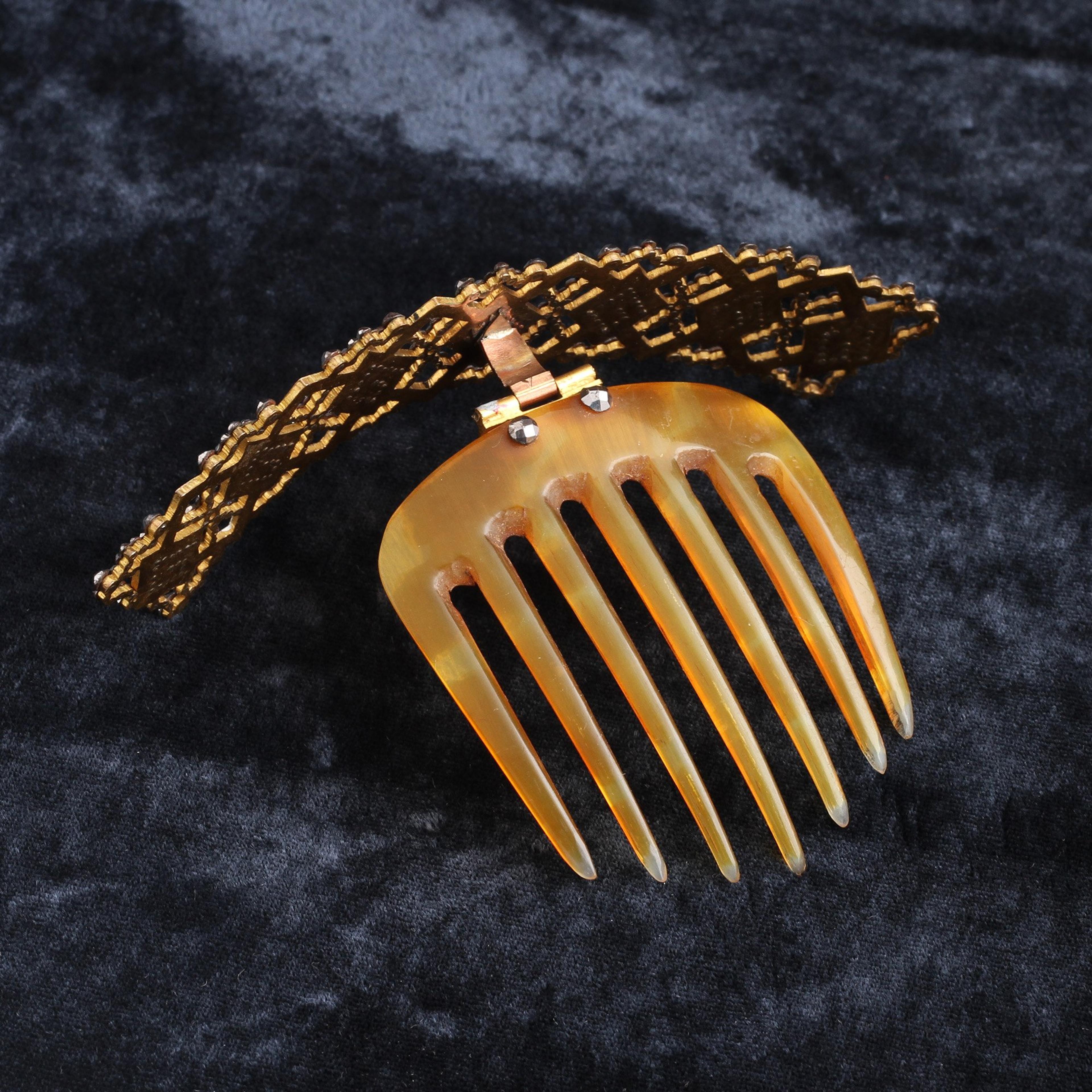 This magnificent Georgian hair ornament is fashioned in cut steel, brass and enamel with a horn comb. Cut steel was used as early as the Elizabethan period, but truly hit it's stride in the early Georgian period and remained popular into the the 19th century. Cutting steel was an involved process that required faceting and riveting each steel stub to a larger base plate. The steel "stones" provided a glittering and affordable alternative to diamonds during a time when paste jewelry could command the same price as gemstones, and rhinestones did not yet exist. This gorgeous hair ornament features a Greek key motif amid a pattern of alternating diamond and "x" shapes. The arced ornament is affixed to the comb with exquisite faceted steel rivets and swivels on a hinge to accommodate the shape of any up do.