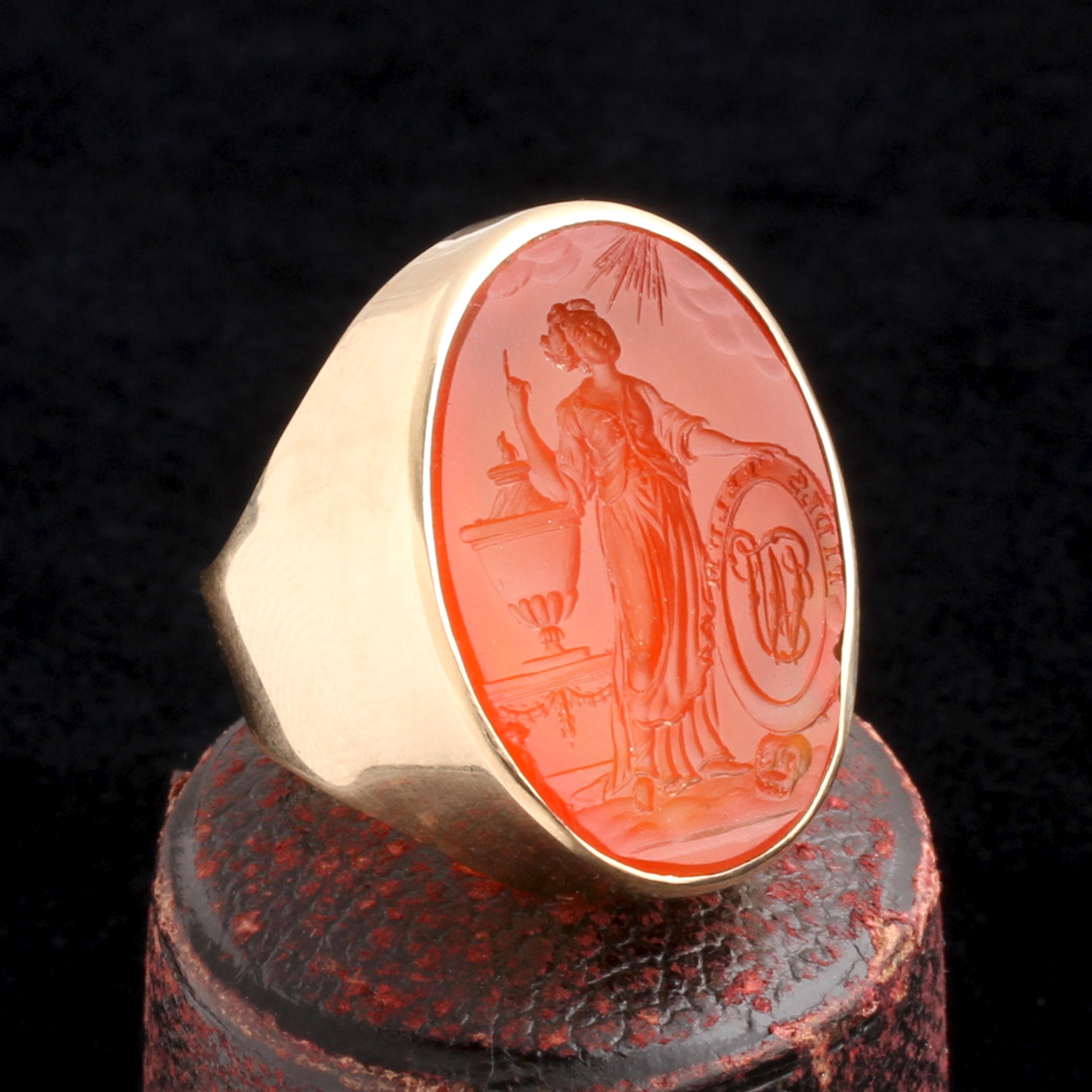In carnelian, an intaglio wax seal depicting a scene of a woman in bodice and drapery looking up and pointing toward the heavens with God’s rays shining down. She stands beside an urn and plinth, her hand rests on a large oval personal insignia with the initials WT (or TW) and the motto “Fides Telum,” or, “The impelling power of faith.” Beneath the insignia, a memento mori skull. An exquisite carving that was likely housed in a fob and later remounted as a ring.