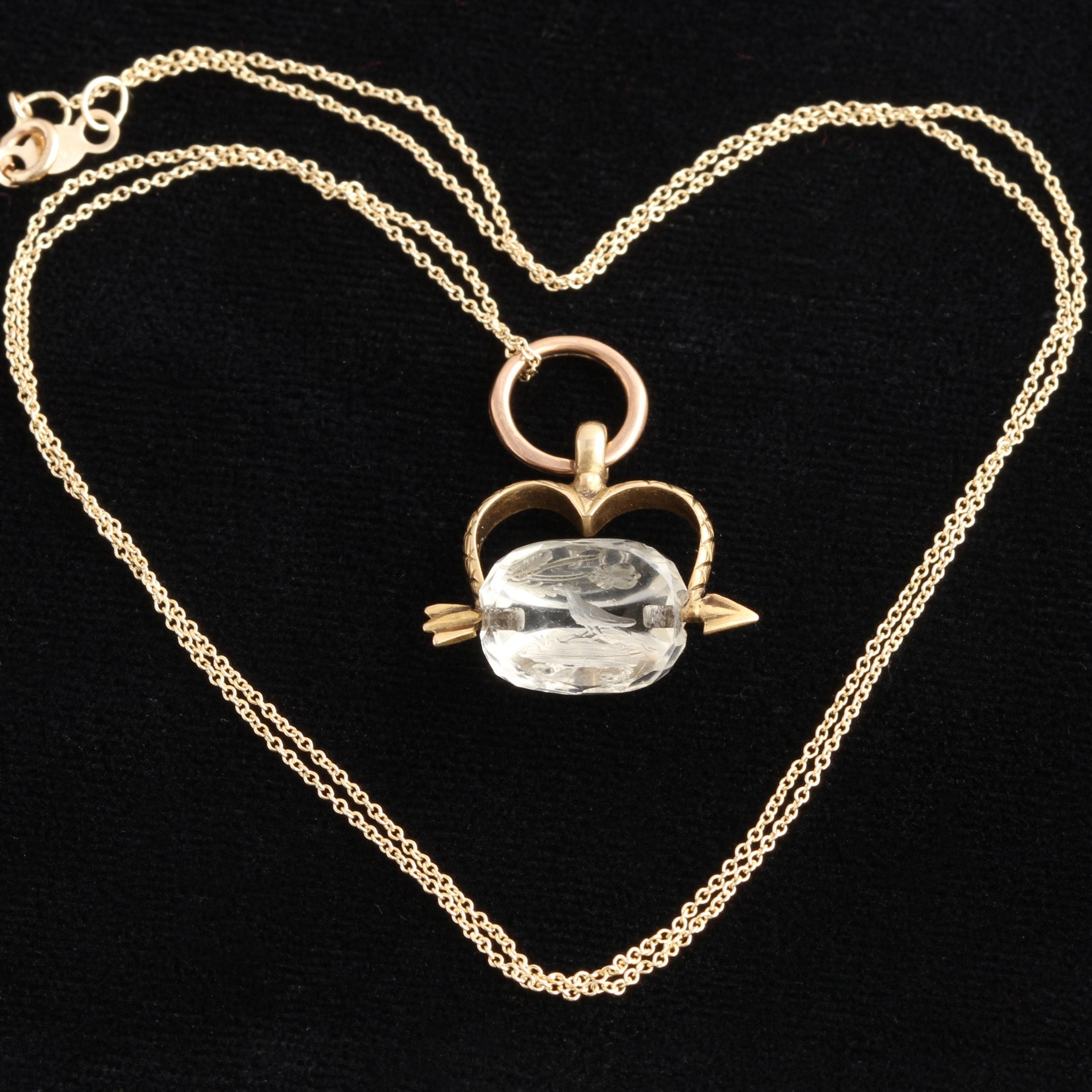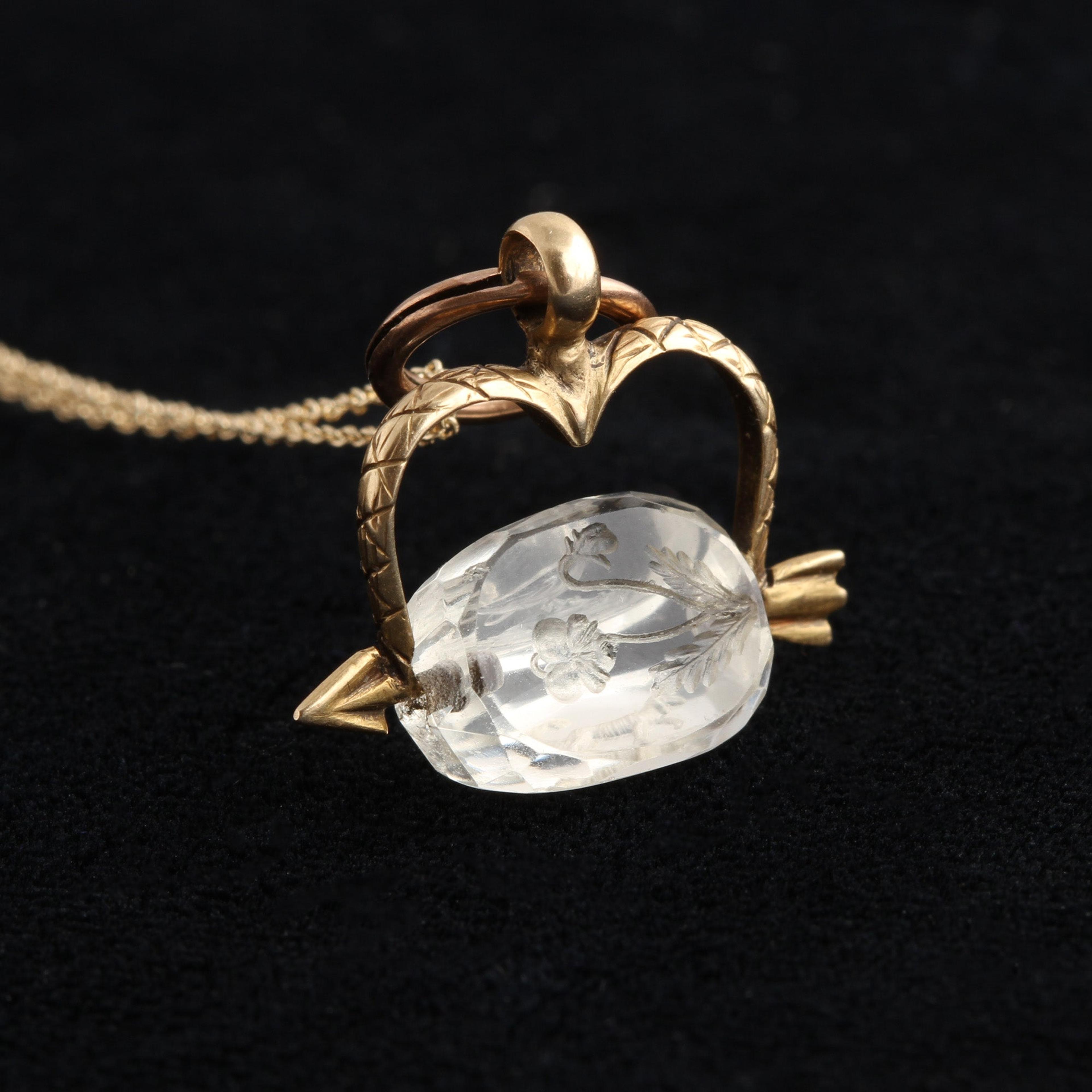 A remarkable Georgian god spinner seal fob with a heart-shaped mount and an arrow pin. The three-sided rock crystal seal features a pansy, a dog and a hawk.
