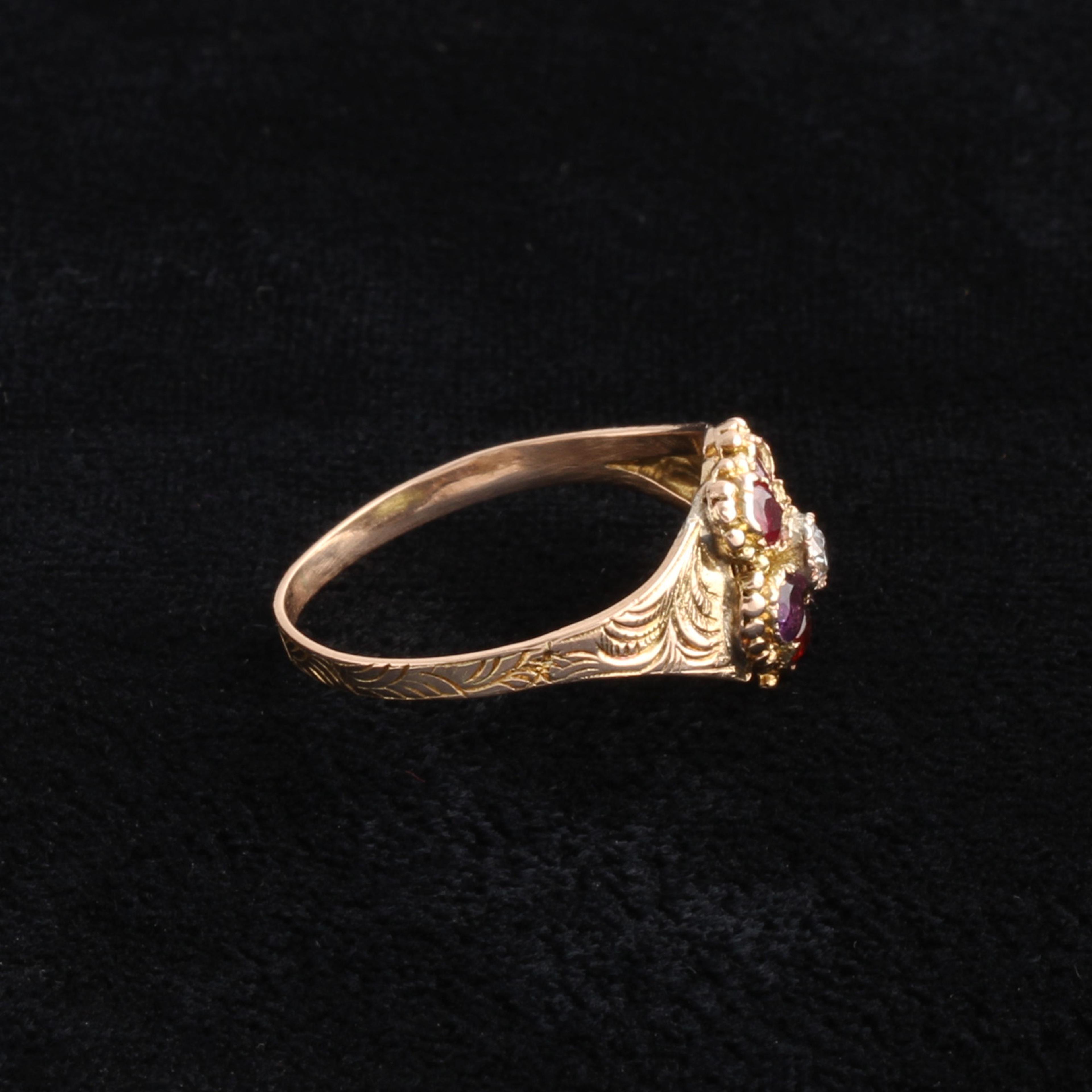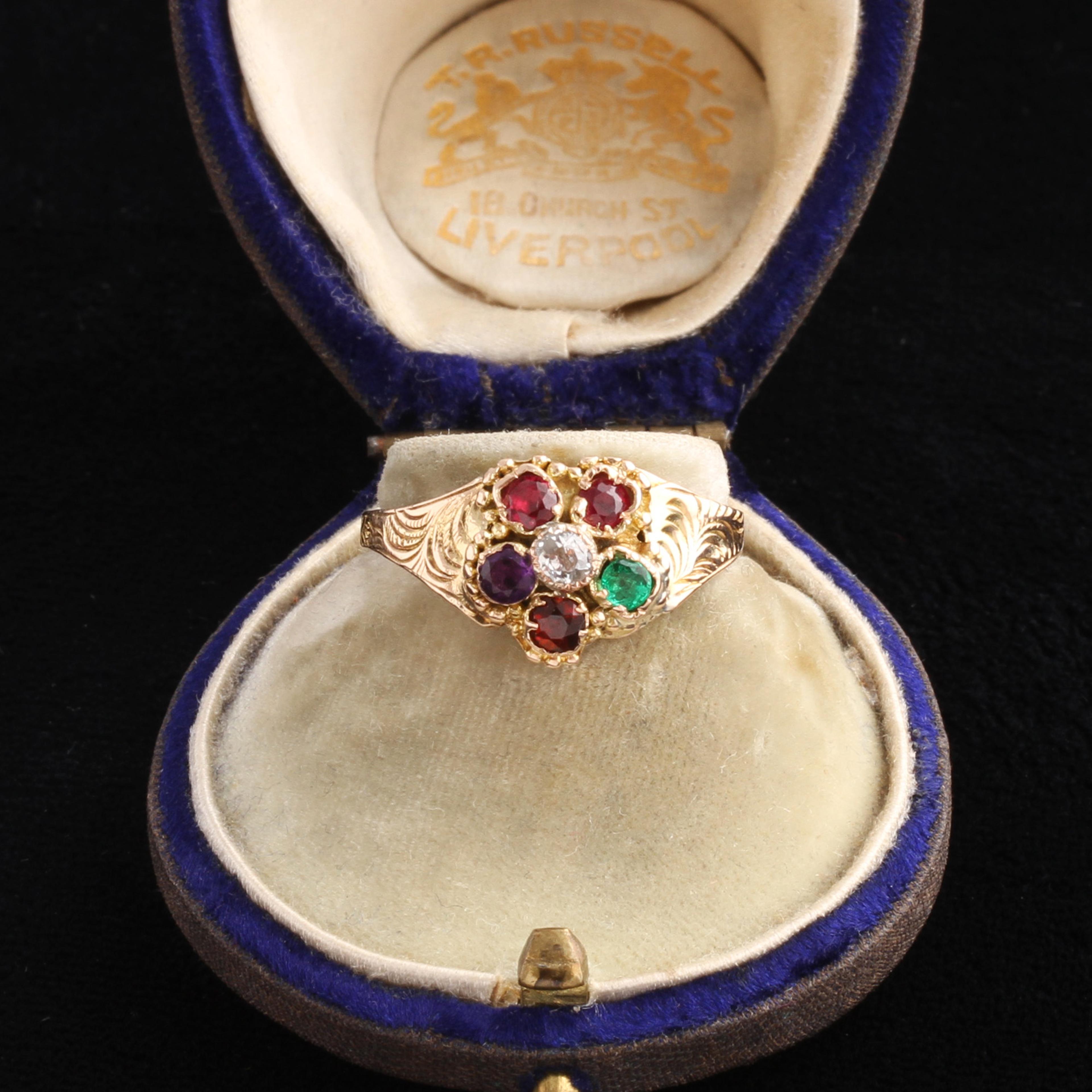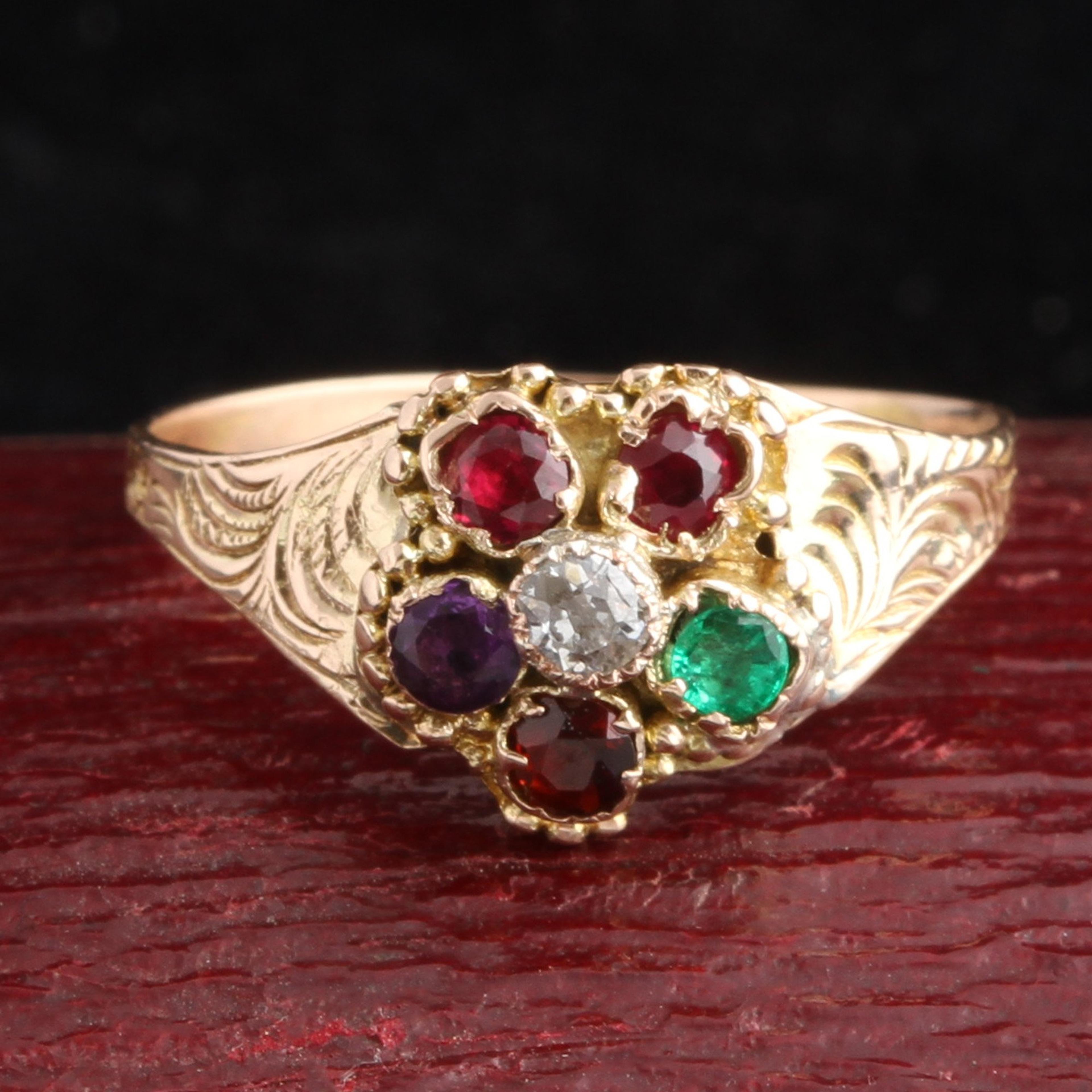Acrostic rings like this one were beloved by the private and sentimental Victorians. The style first appeared in the early 19th century, and remained popular through the end of the Victorian period. Using precious gems, jewelers spelled out names and sweet nothings like LOVE, ADORE, or the rather stiff, but very popular, REGARD as seen in this lovely late Georgian ring. Doubling down on the sentimentality, the ruby, emerald, garnet, amethyst, ruby, diamond of this acrostic ring are arranged in the shape of a pansy, which in the language of flowers meant “think of me.”