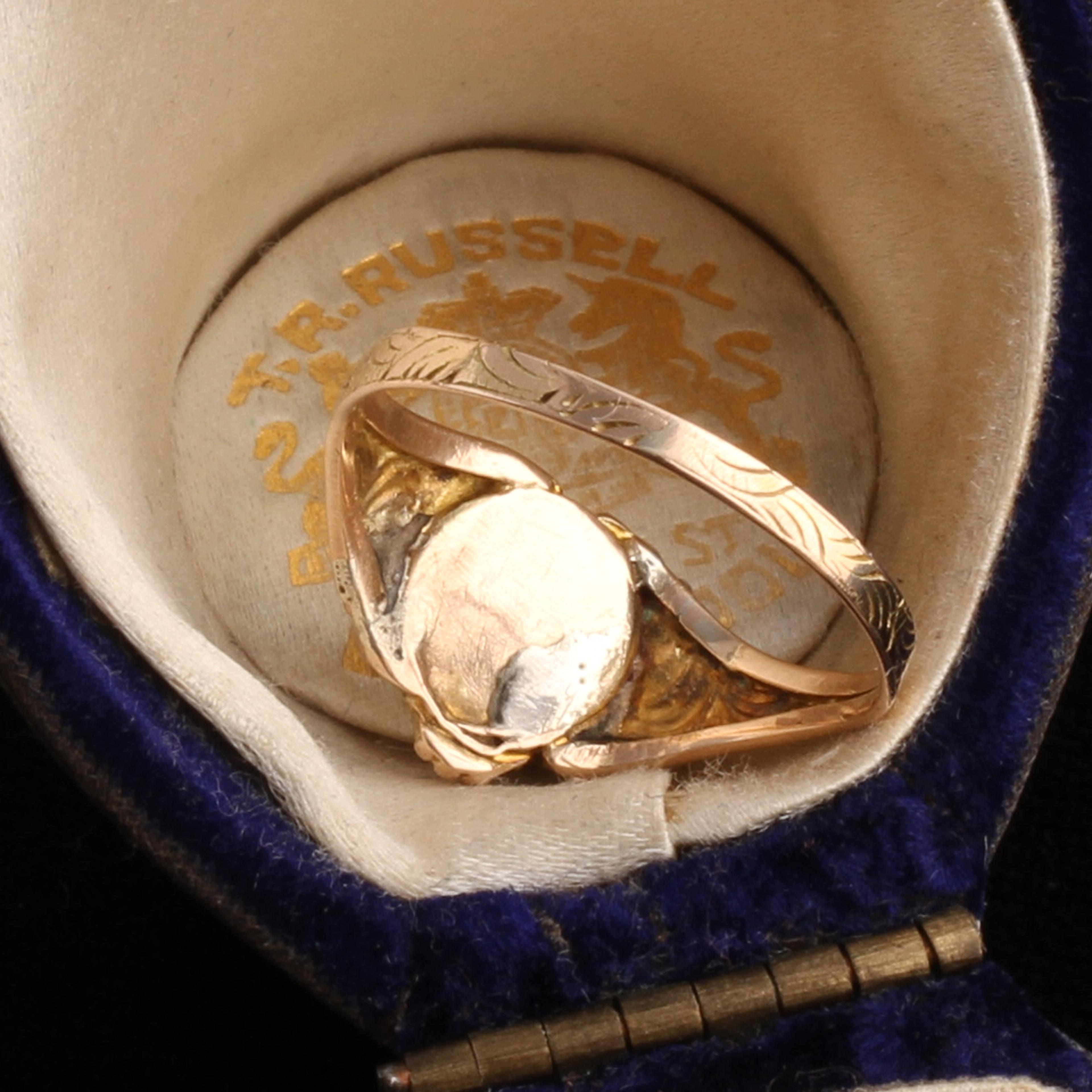 The boat-shaped marquise diamond cut was developed around this time, supposedly to imitate the smile of Louis XV’s mistress, the marquise de Pompadour. Paste — an imitation gemstone made from leaded glass — was newly developed in the 18th century, and set into jewelry with the same creativity and care as its more precious counterparts. Real and imitation gems were almost always set in closed-backed settings, lined on the underside with thin sheets of foil to enhance the color of the stone and highlight it's sparkle. This makes Georgian rings tough for modern women to wear, especially on an everyday basis: genteel, jewelry-owning ladies of the 18th century were not famous for working with their hands like we are. Nor did they wash their hands as much as we do. Water will virtually ruin a foiled setting, so take special care with your Georgian ring. Very little jewelry from this period is still in circulation, and it's very difficult to repair.