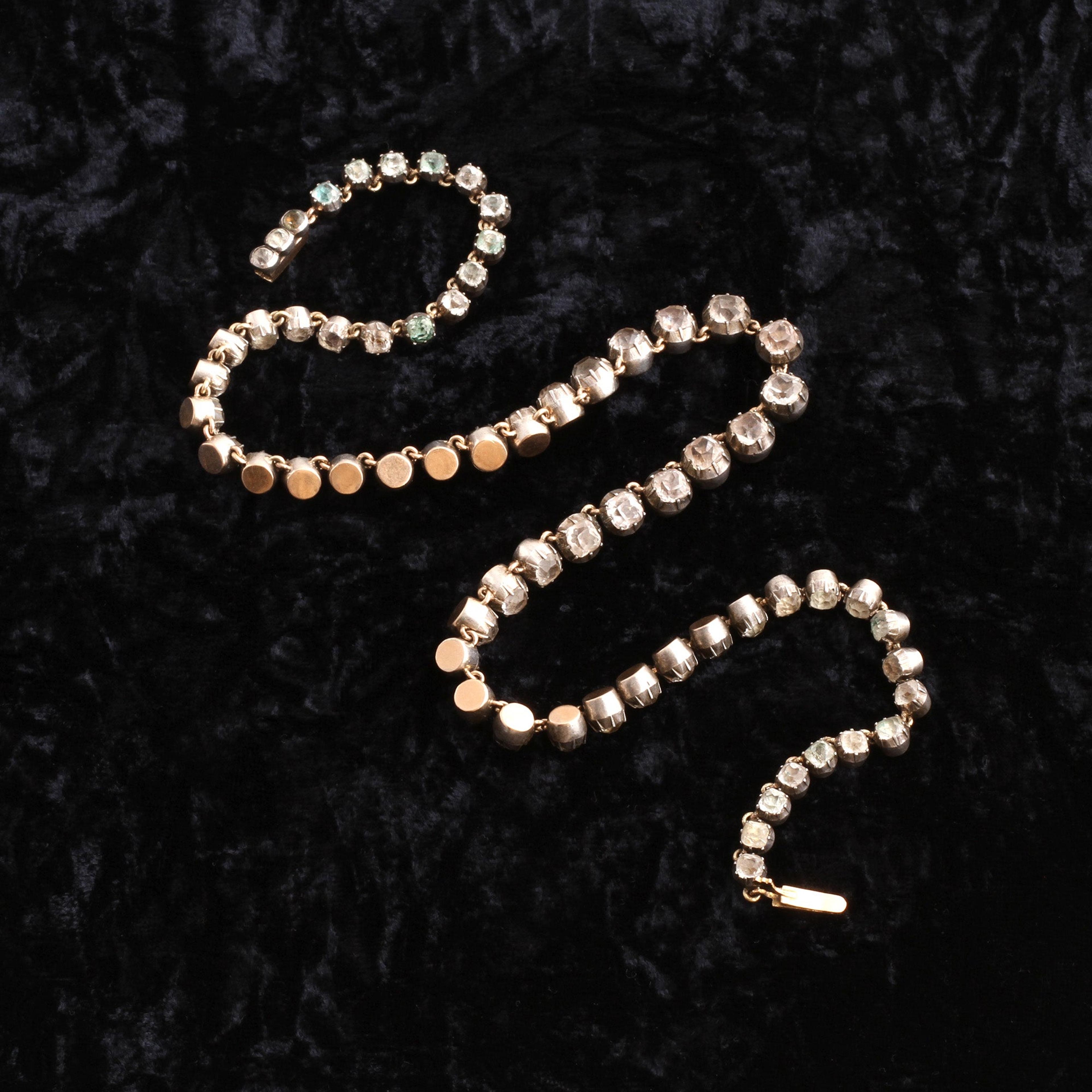 Very good - The foil backings of a few stones on and near the clasp have discolored, probably from exposure to perfume or hairspray