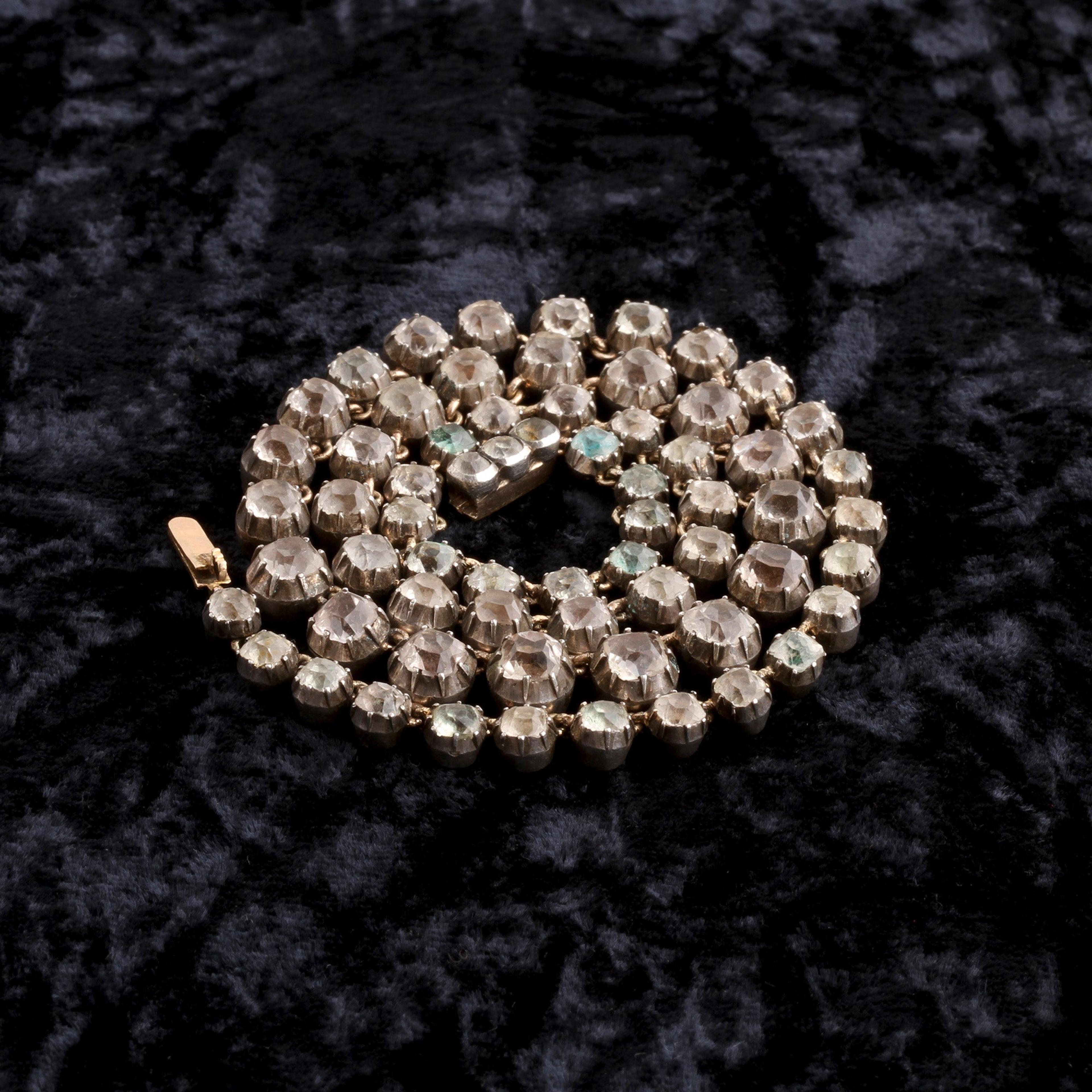 This elegant Georgian rivière dates to the early 19th century. The riviére, an endless collar of gems fastened with a concealed clasp, was at the height of fashion in the mid to late Georgian period. The necklace is composed of foiled cushion cut rock crystals in closed back crimped silver settings. The obverse is finished with an immaculate gold wash.