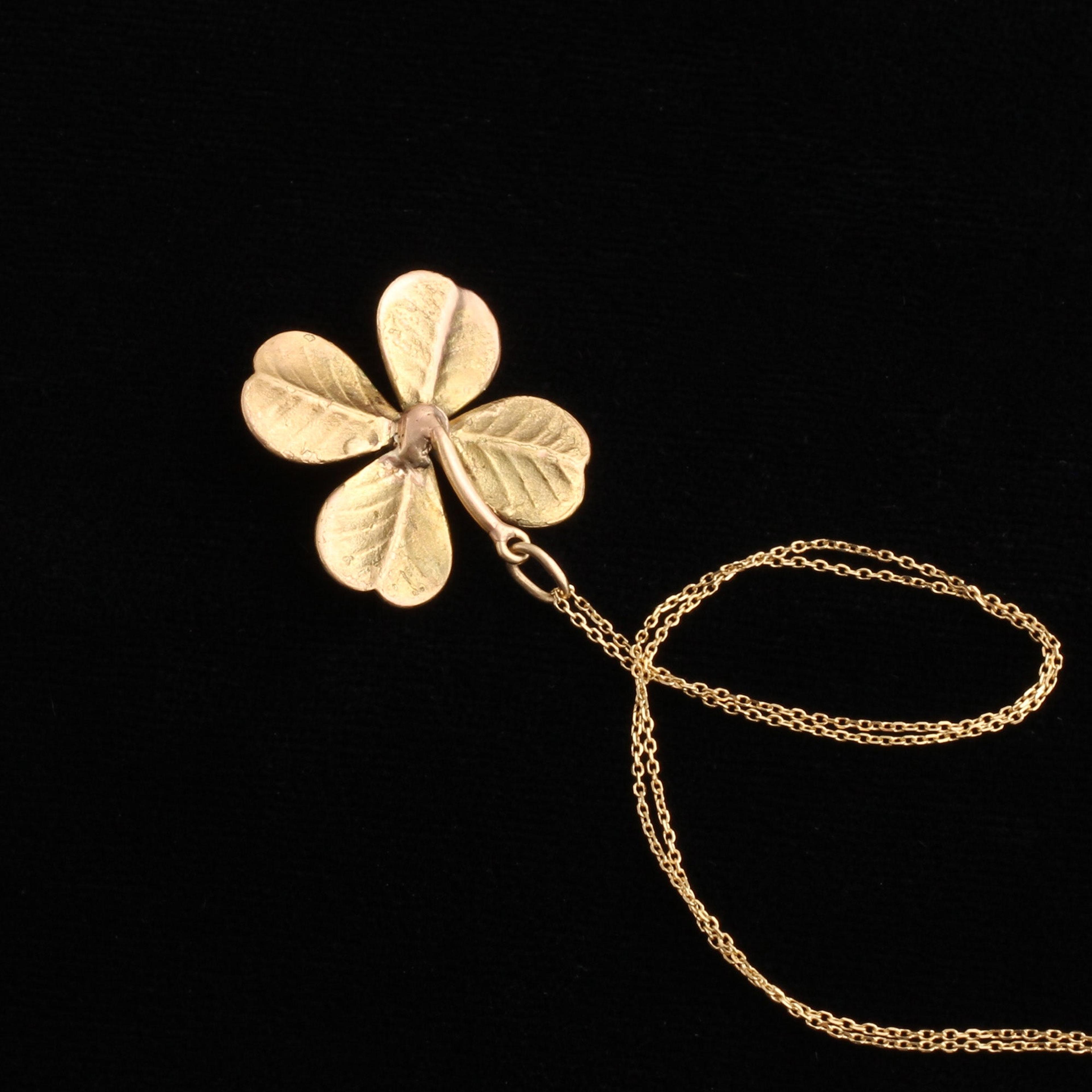 A four leaf clover pendant dating to the tail end of the Victorian era. Fashioned in green and rose gold, this lucky charm also features a chunky old cut diamond at its center. Note the lovely detailing of the veins of each leaf on both the front and back sides of the pendant.