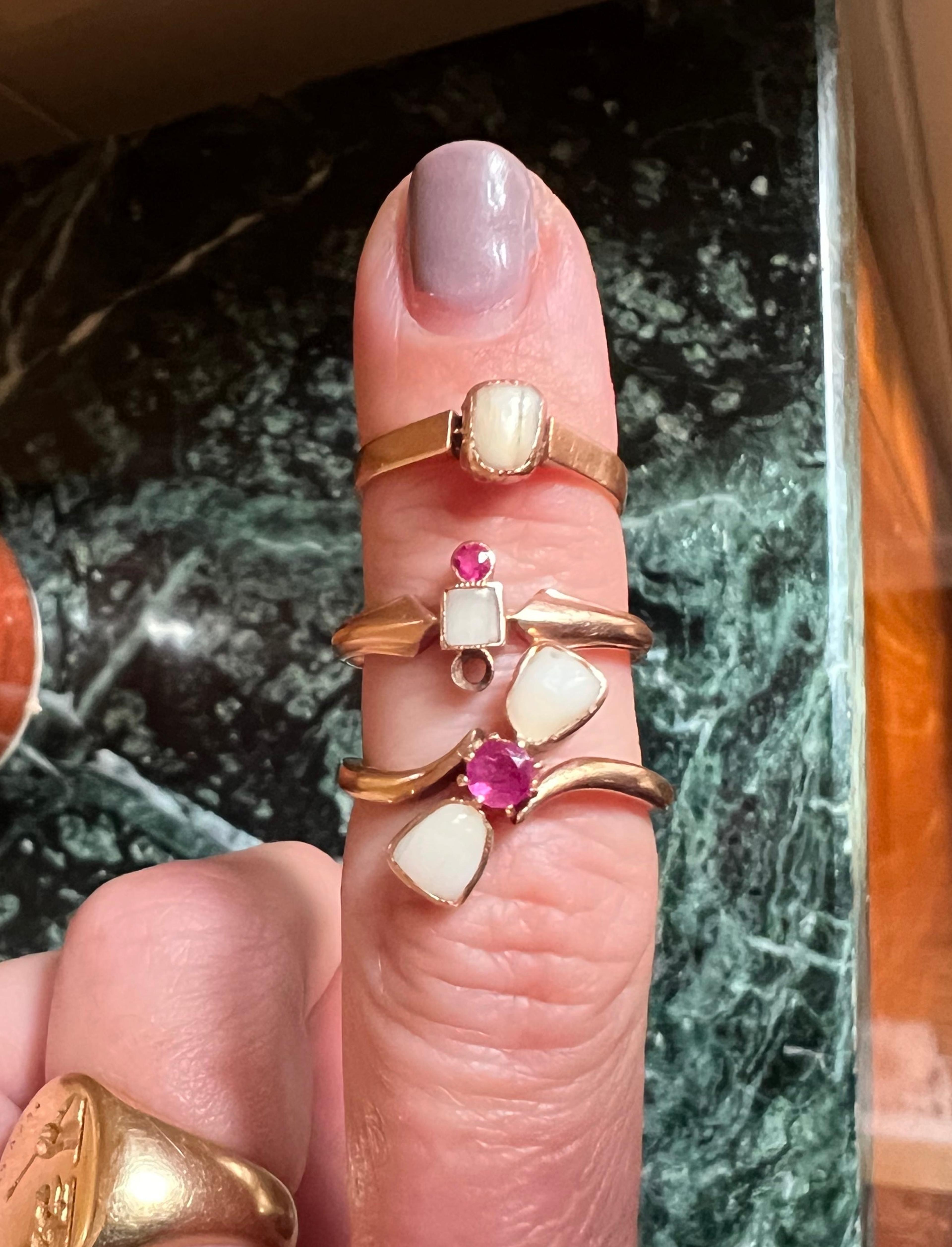 The use of baby teeth (or "milk teeth") in jewelry has nothing to do with mourning. Quite the opposite - during the 19th century it was well worth celebrating if your child survived long enough to lose their first teeth. Thus, the Victorians (a sentimental and not-too-squeamish bunch) commissioned jewelry made from these tiny treasures. This lovely version of the style, pictured at the very bottom of this stack, features a crossover design with two milk teeth and a 4mm ruby. 14k gold. Size 6.5.