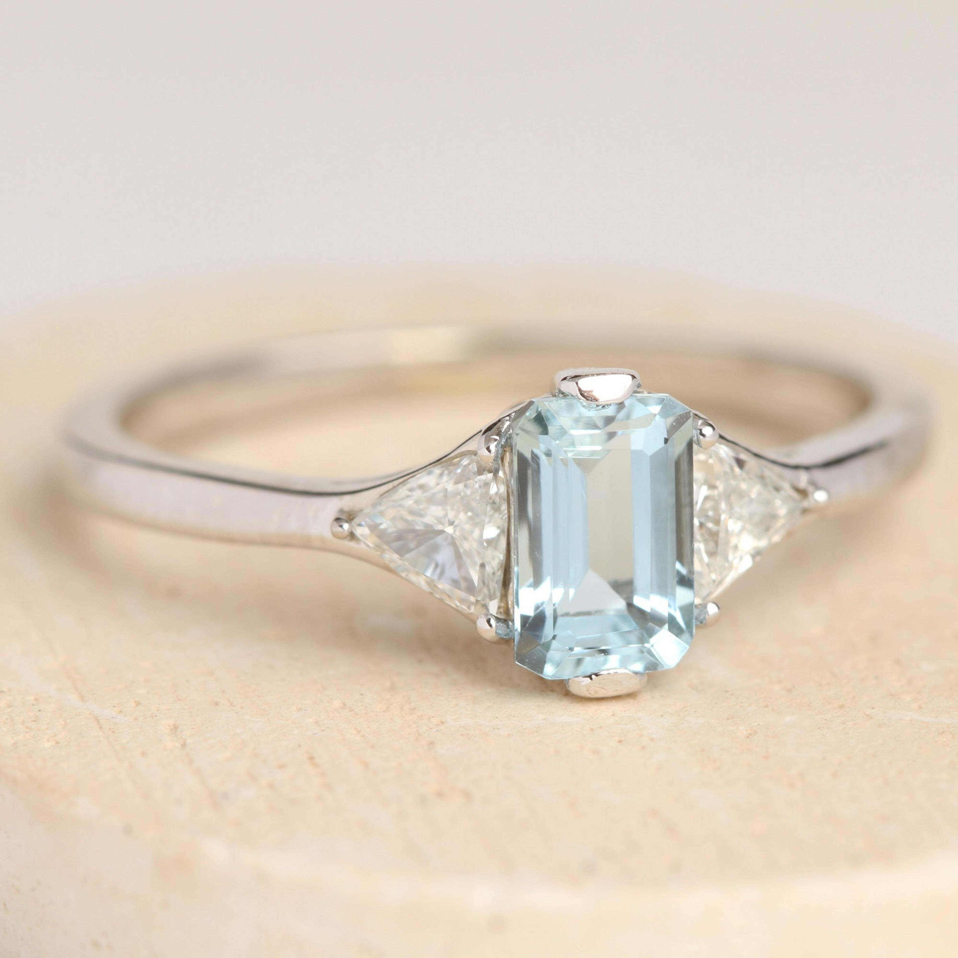 It's hard to not fall in love with aquamarine, a stone that's named after the ocean (from the Latin aqua marinus, meaning "sea water".) In Ancient Greece, the stone was aligned with the god of the sea, Poseidon. We combined this noble gem with diamond trilliants on both sides. It's an Art Deco-inspired ring with petite proportions, a flat profile, and a dreamy color scheme.
