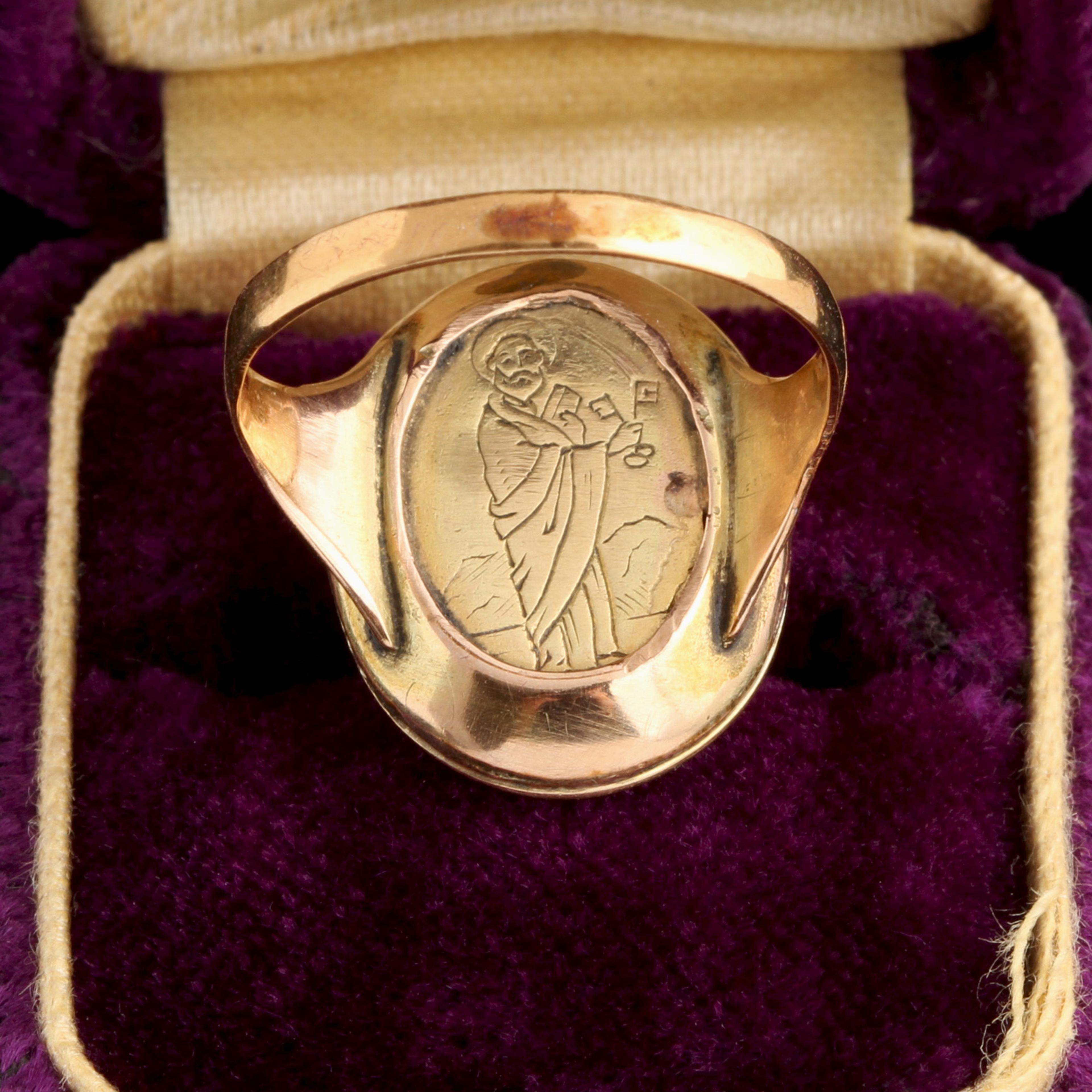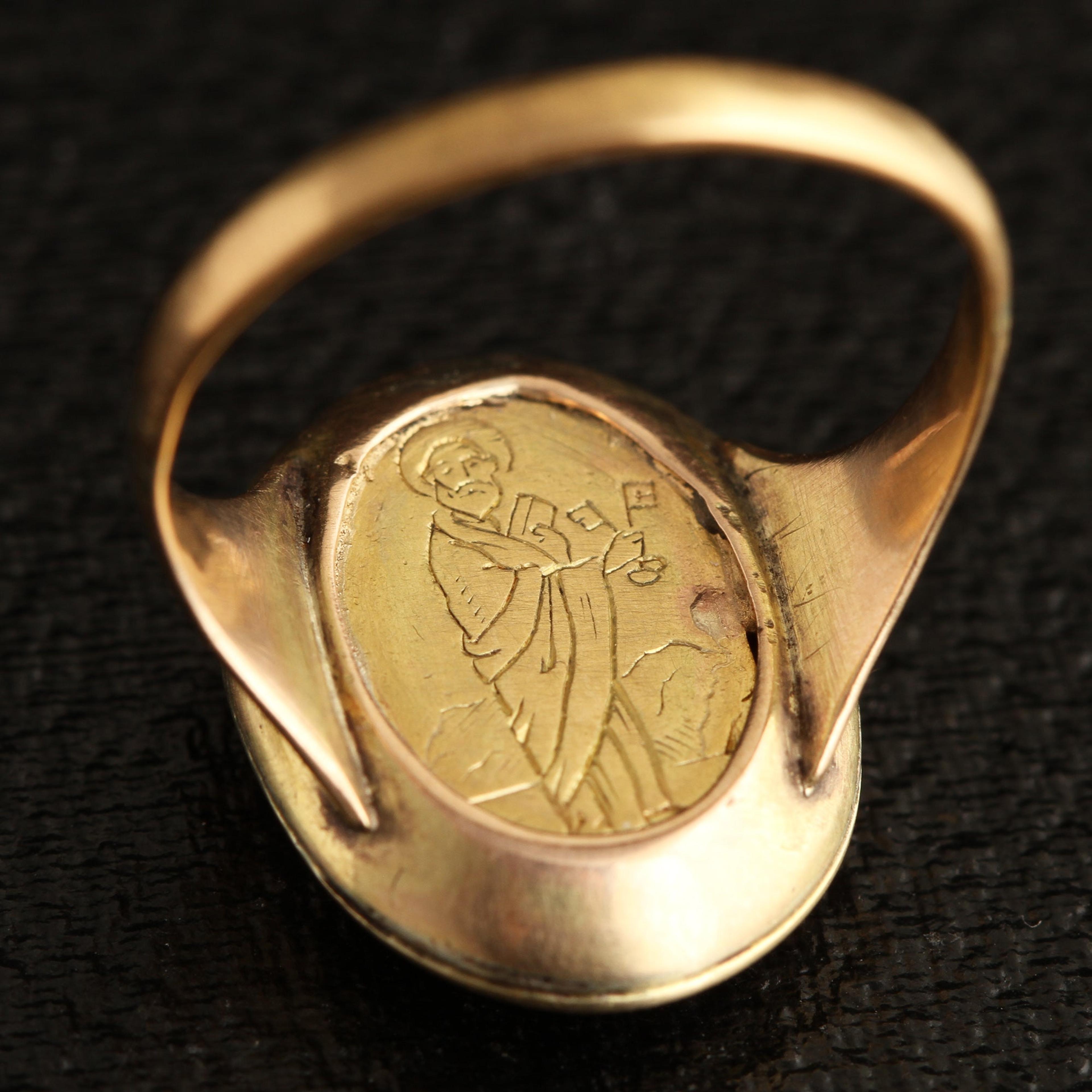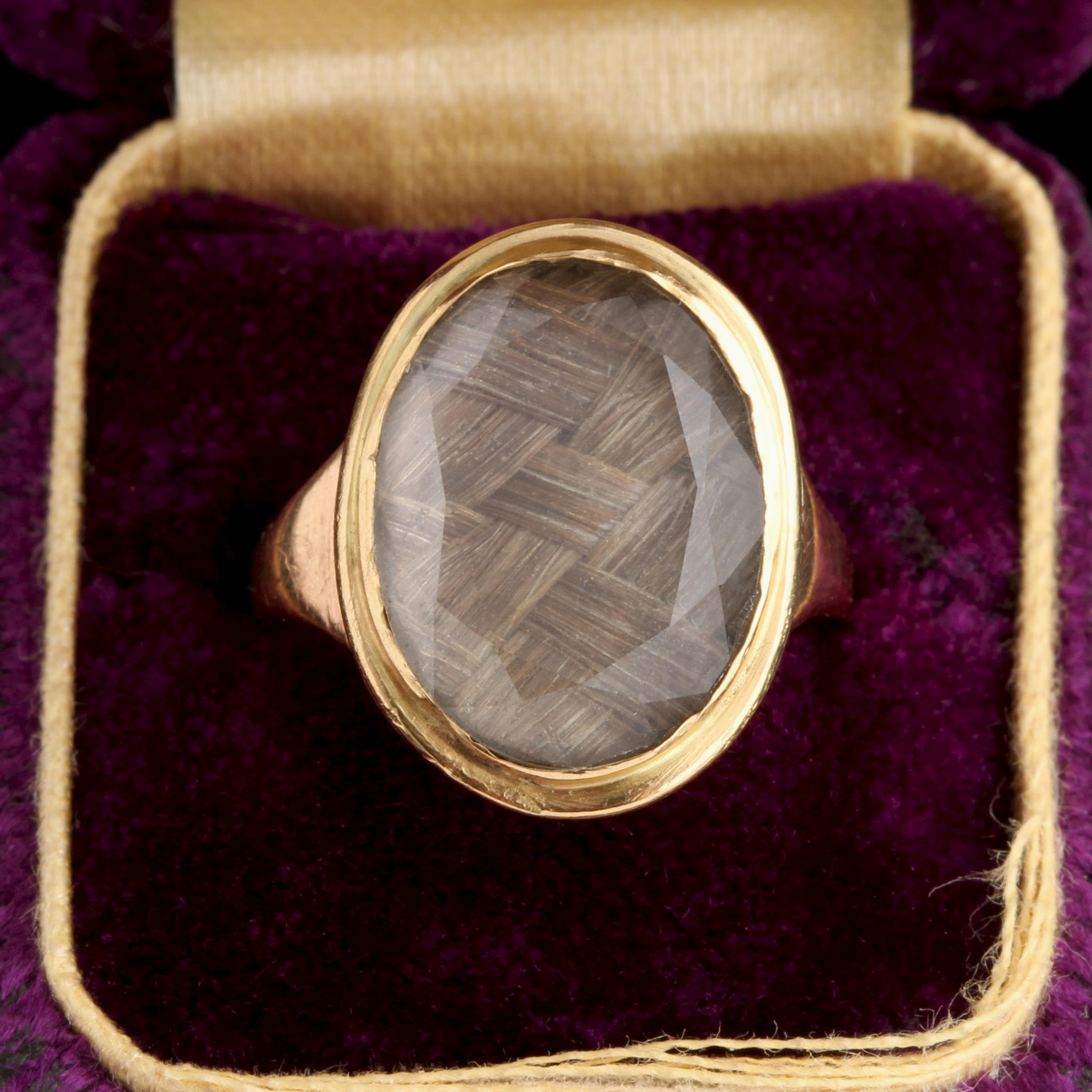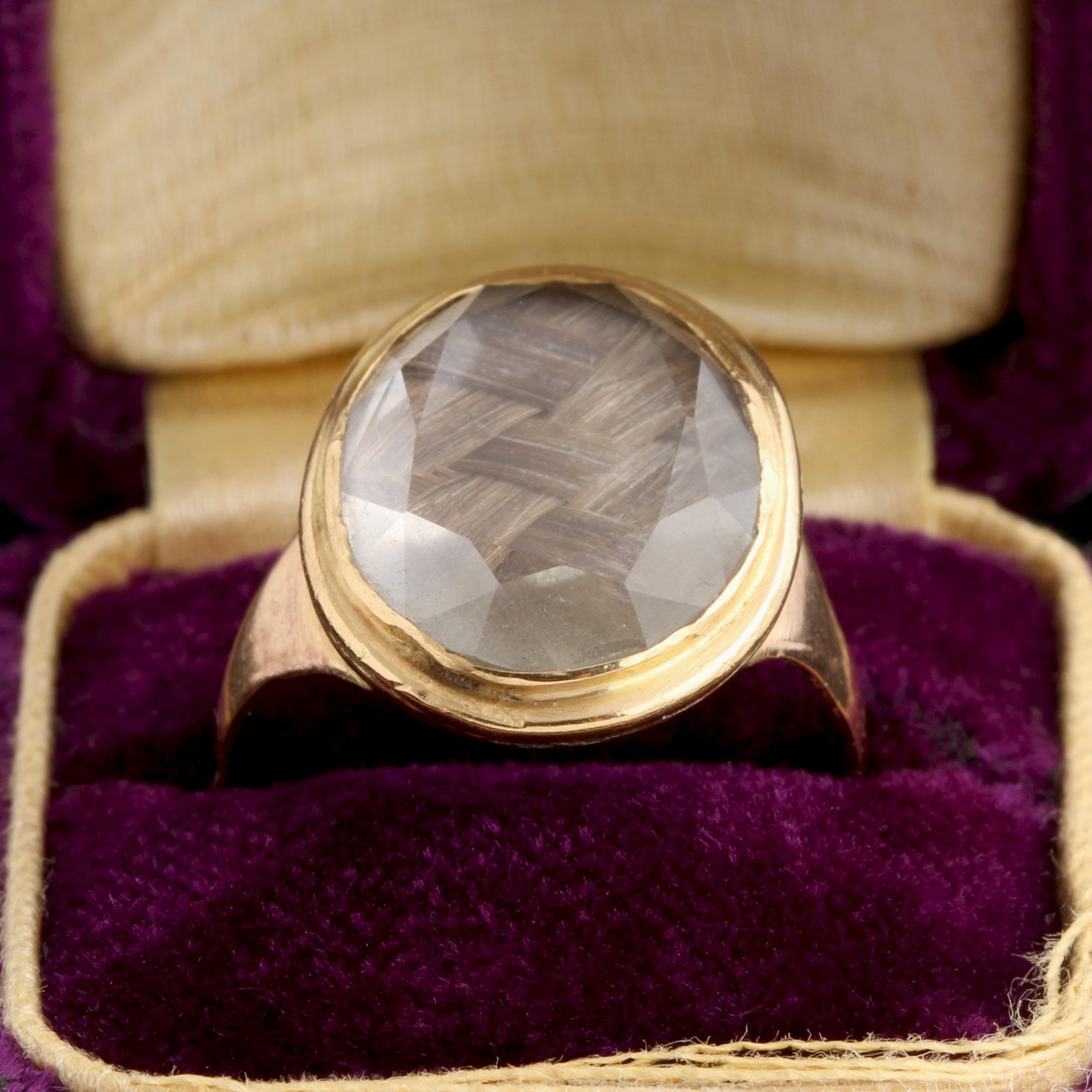 Written at the same time this striking mourning ring was made, this quote from Godey’s Lady's Book beautifully describes the Victorian sentiment when it came to hair jewelry: “Hair is at once the most delicate and lasting of our materials and survives us like love. It is so light, so gentle, so escaping from the idea of death, that, with a lock of hair belonging to a child or friend, we may almost look to heaven and compare notes with angelic nature, may almost say: 'I have a piece of thee here, not unworthy of thy being now.'” With its large oval head and crisp rock crystal face encasing woven hair, this ring is arresting in its simplicity. Turn it over to discover what elevates it to the realm of the spectacular: an engraving of St Peter holding the keys to the gates of heaven.