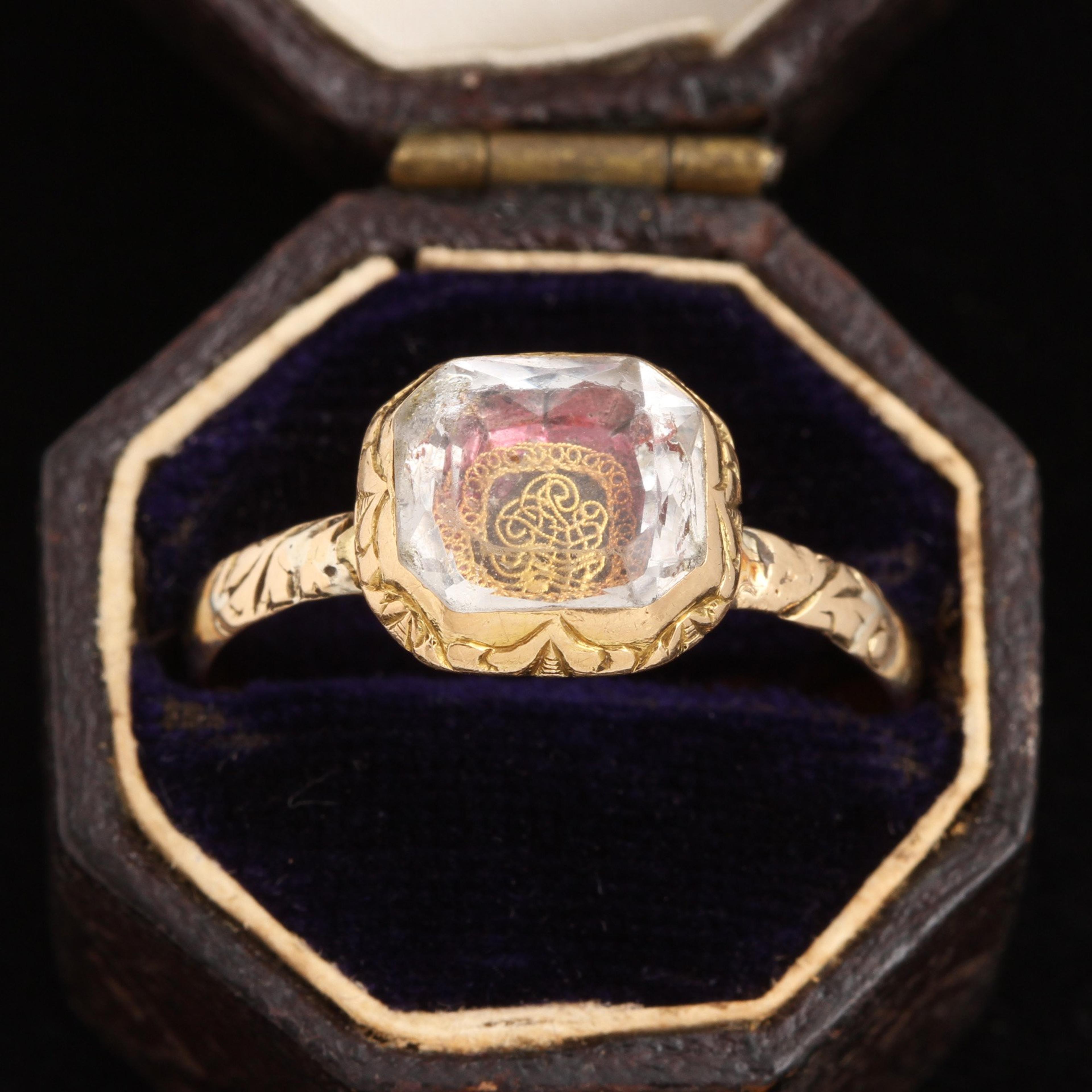 Stuart crystals are faceted rock quartz crystal jewels which originated as a form of mourning (or protest) jewelry after the execution of King Charles I of the House of Stuart in 1649. The first Stuart crystals were pendants or rings and featured the initials of the king or a miniature portrait of him under a rock crystal top. Later variations included cufflinks, buttons, earrings, and slides in addition to the original pendants and rings. Some of these later versions, like this lovely ring, feature initials within a lacy frame of gold thread over a ground of fine hair work and foil. The underside of the head features the fluted detailing frequently seen in Stuart era jewelry and has retained most of its original enamel.