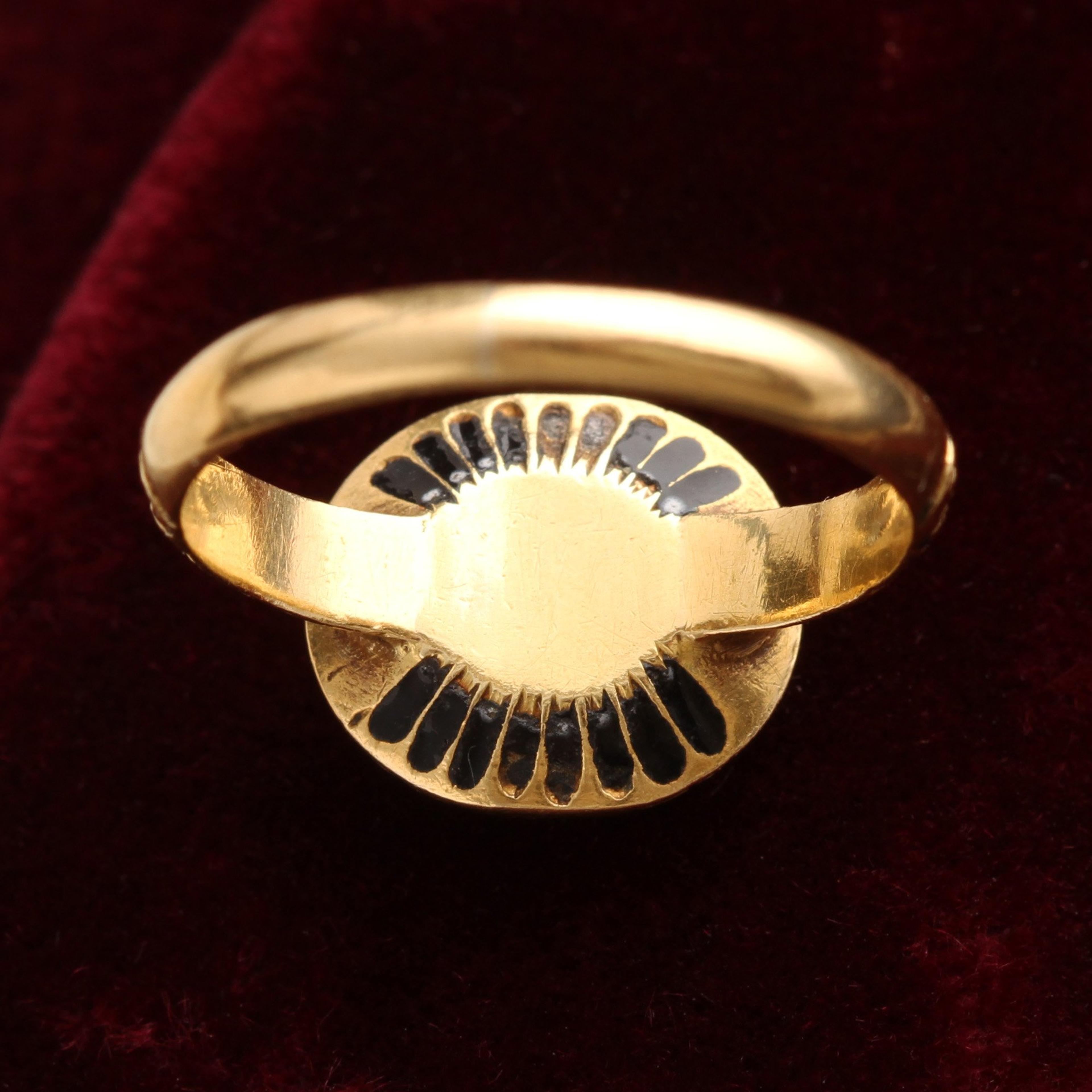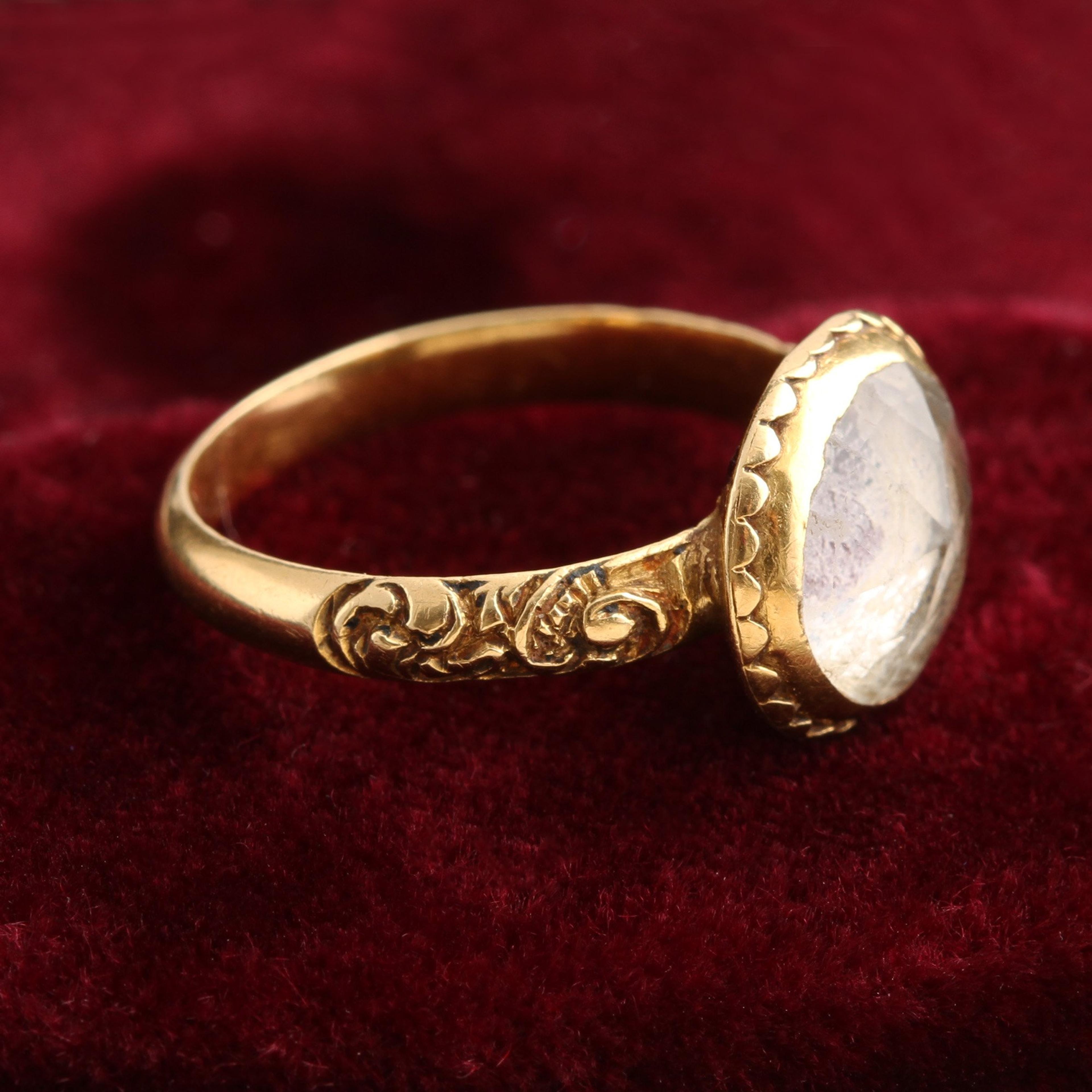 Stuart crystal takes it's name from the rock crystal jewelry worn by loyalists to the Stuart monarchy following the 1649 execution of King Charles I. Early Stuart crystal jewels typically feature a miniature of the King, or his cipher, under faceted rock crystal. These mourning pieces were worn discreetly (if not outright secretly) by supporters of the crown in the tumultuous years after his death. Later in the 17th century, Stuart crystal was made and worn for more personal (and less political) reasons, including in memory of lost loved ones. This rare c. 1680 Stuart crystal ring features skull and crossbones over a faint set initials. The ring features beautiful detailing at the shoulders with tiny fragments of enamel and classic Stuart enameled fluting on the underside of the head.