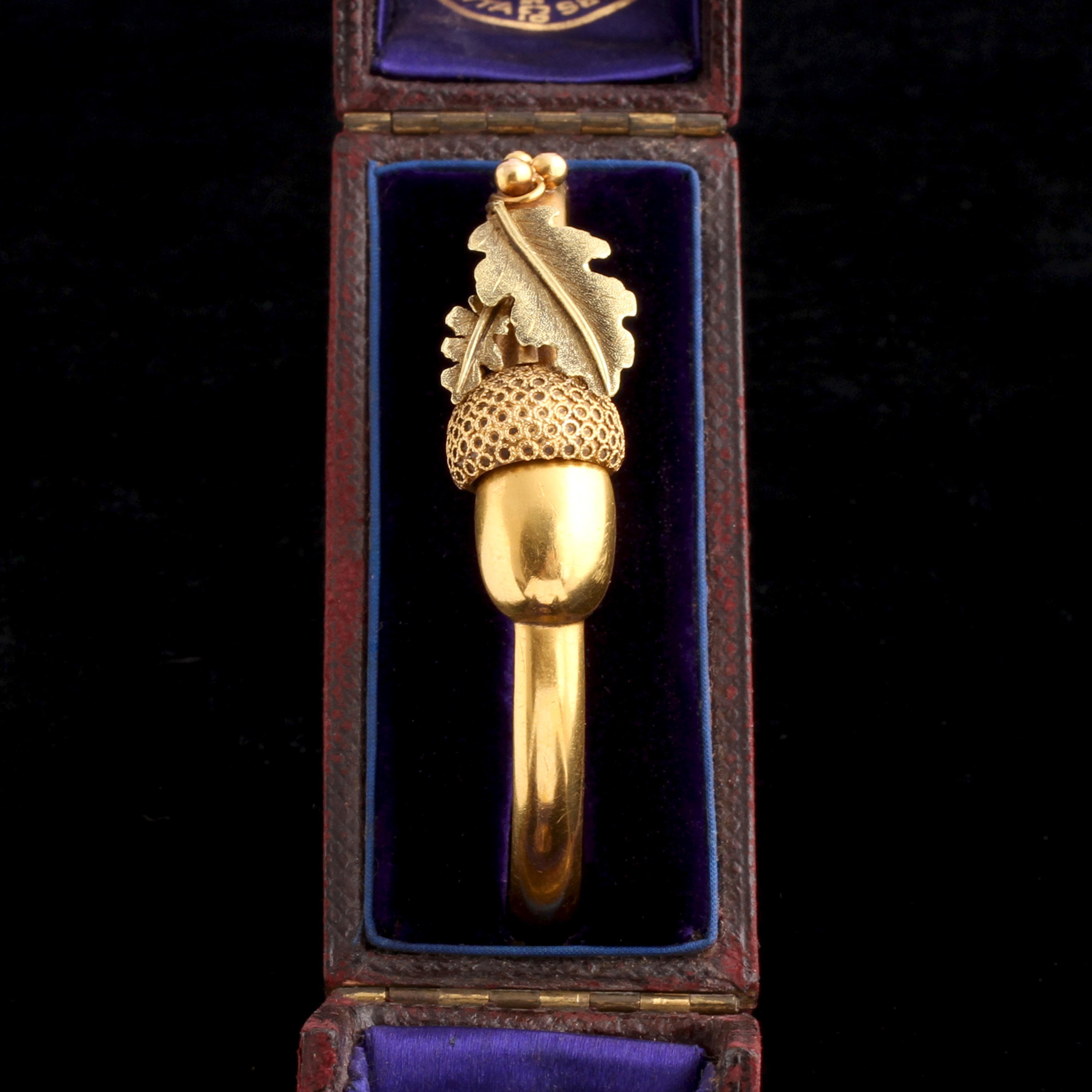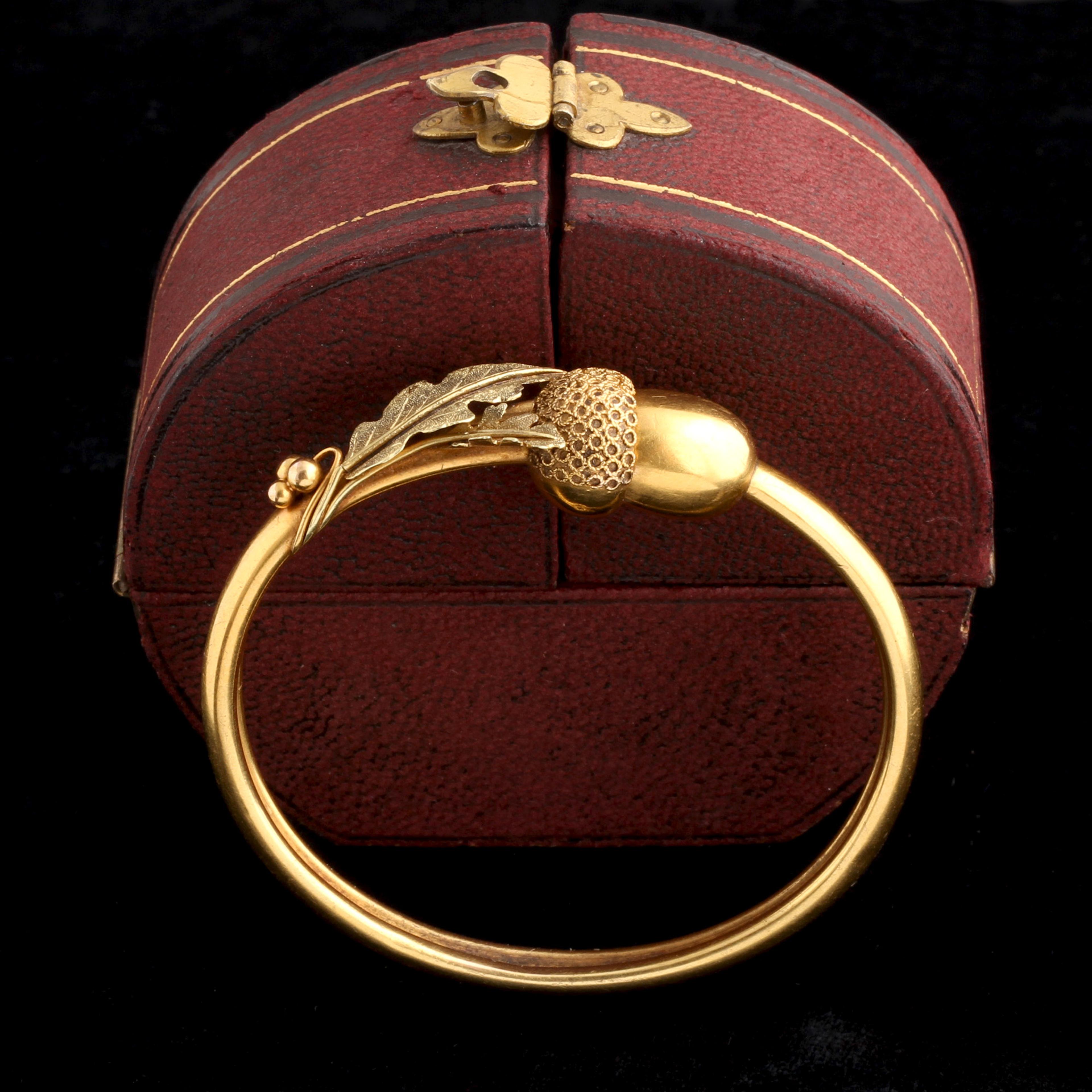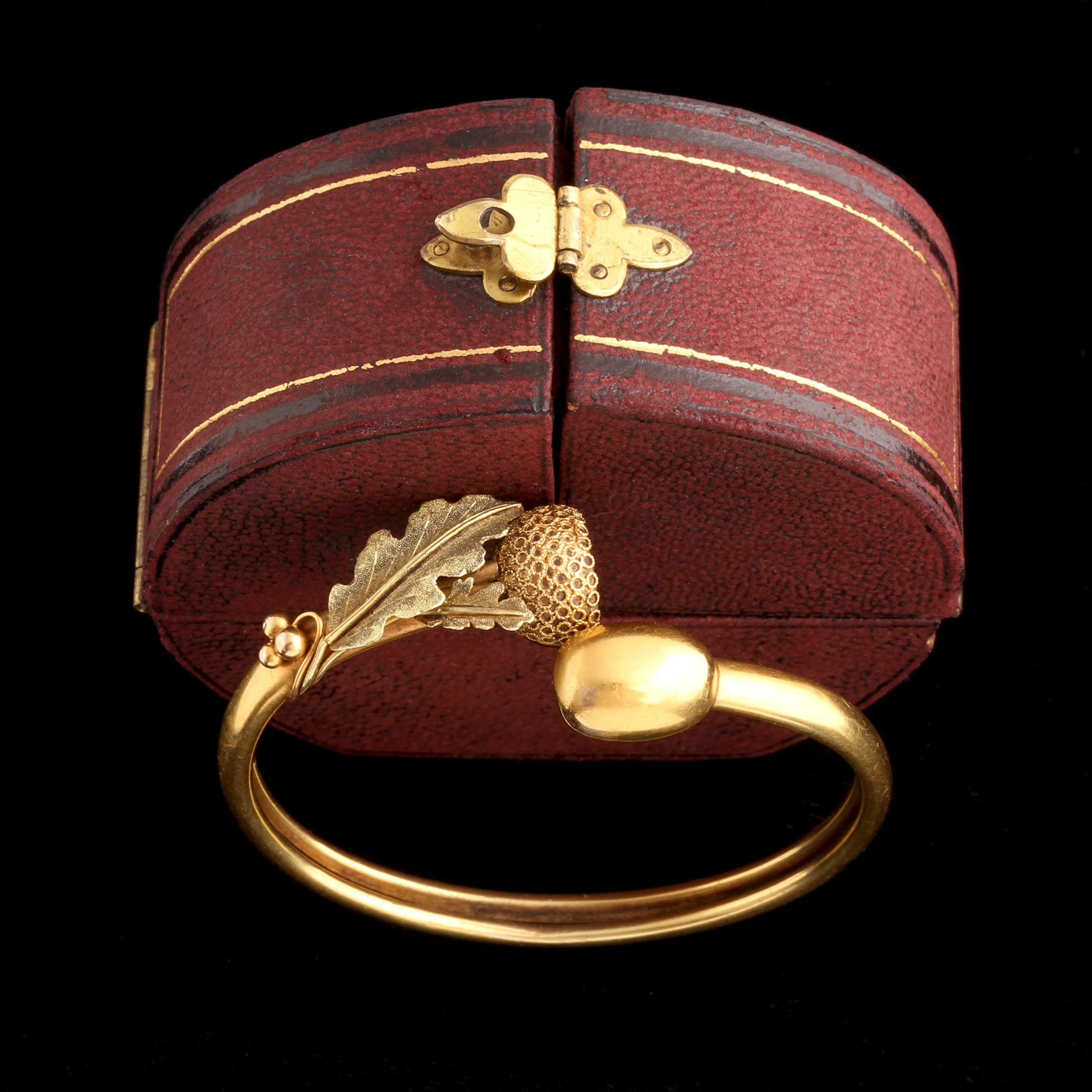 This tricolor bracelet looks to have been made in colonial British India - the original box (which comes with it) is marked "Hamilton & Co Jewellers Calcutta". Calcutta was the center of luxury European retailing in India during the 19th century. In 1880, when this bracelet was made, the British Raj was in full swing - this racist, exploitative project was one of the most destructive colonial endeavors in history. Incredible to think that this acorn jewel (acorns: a Victorian symbol of hope, beginnings, renewal and rebirth) was the product of such a time and place.