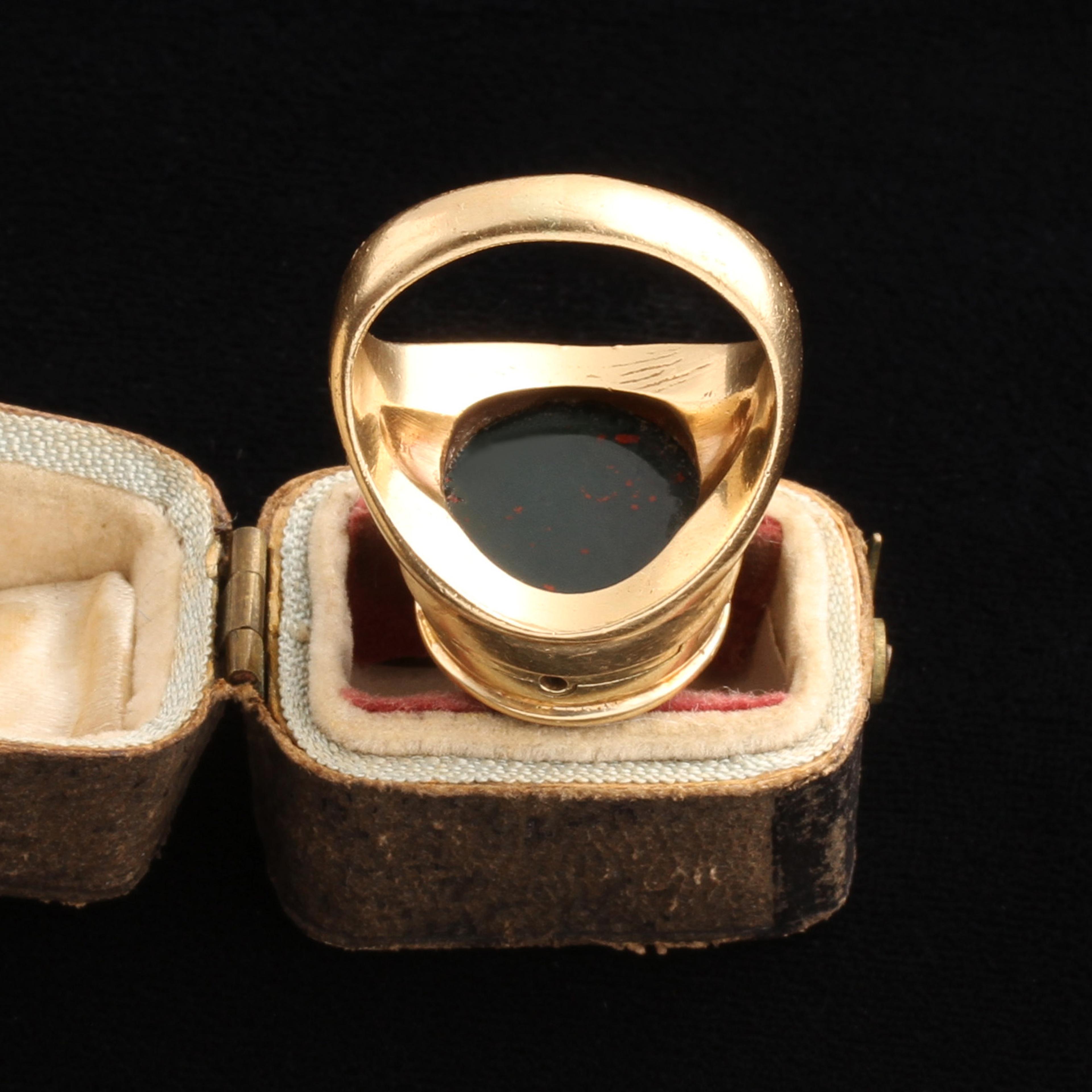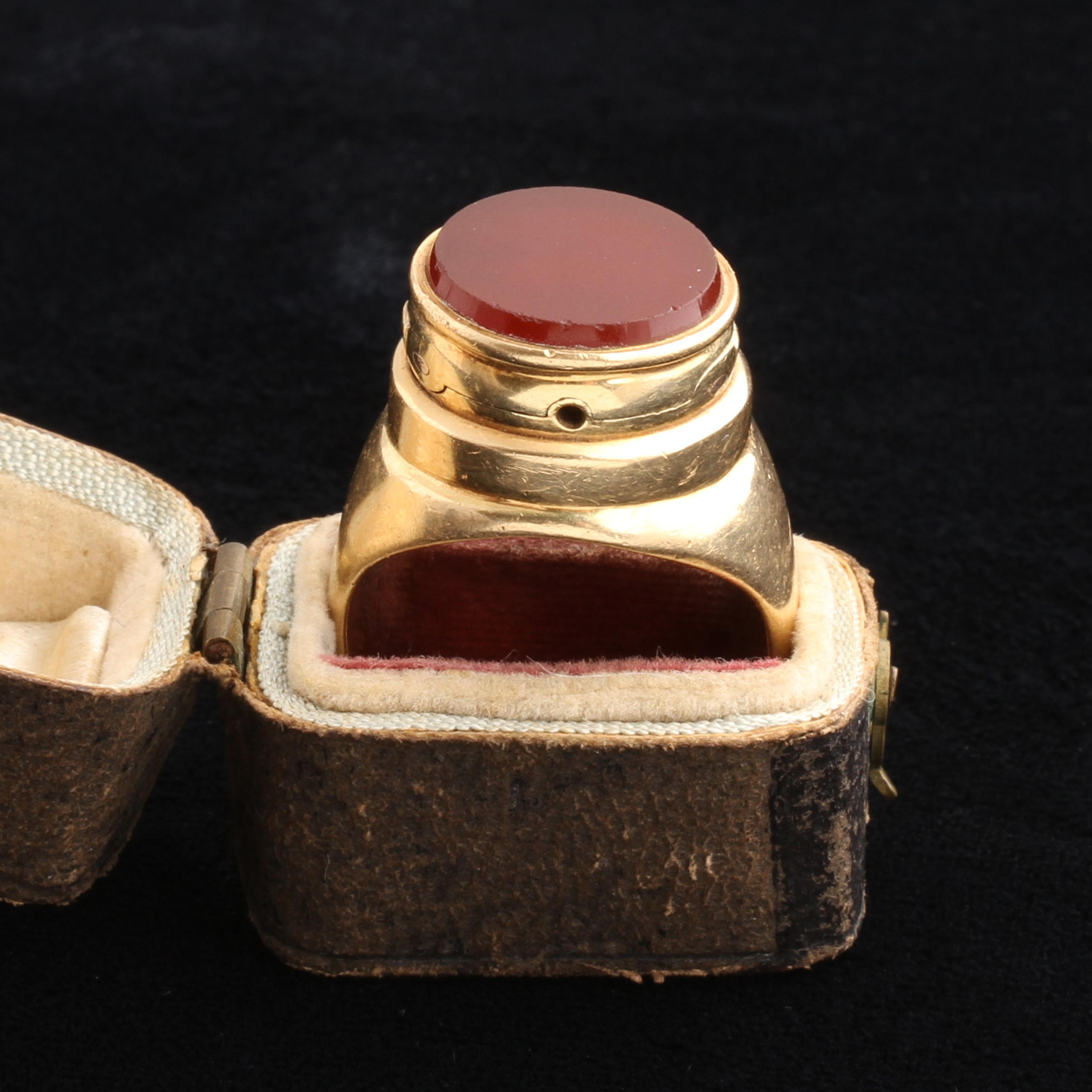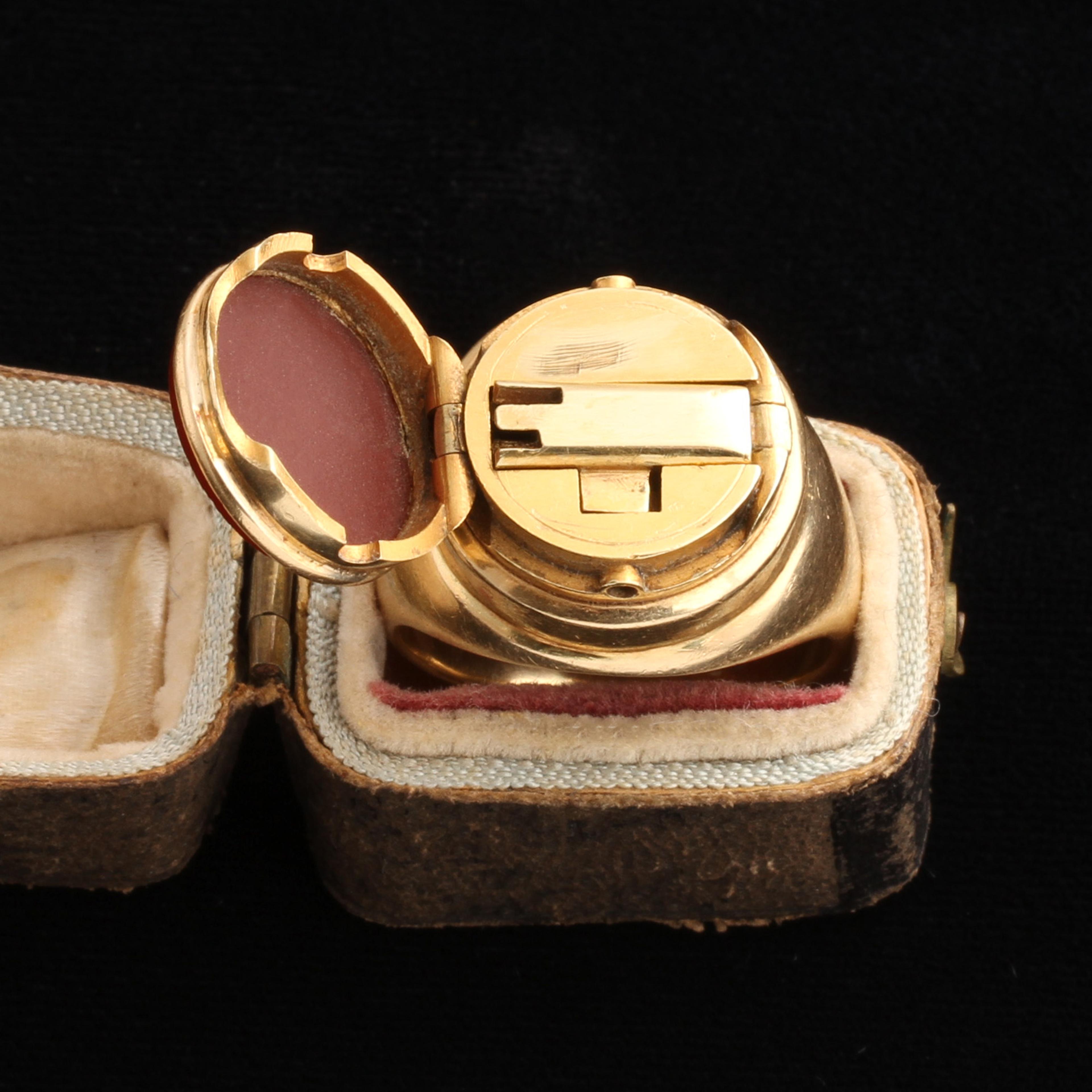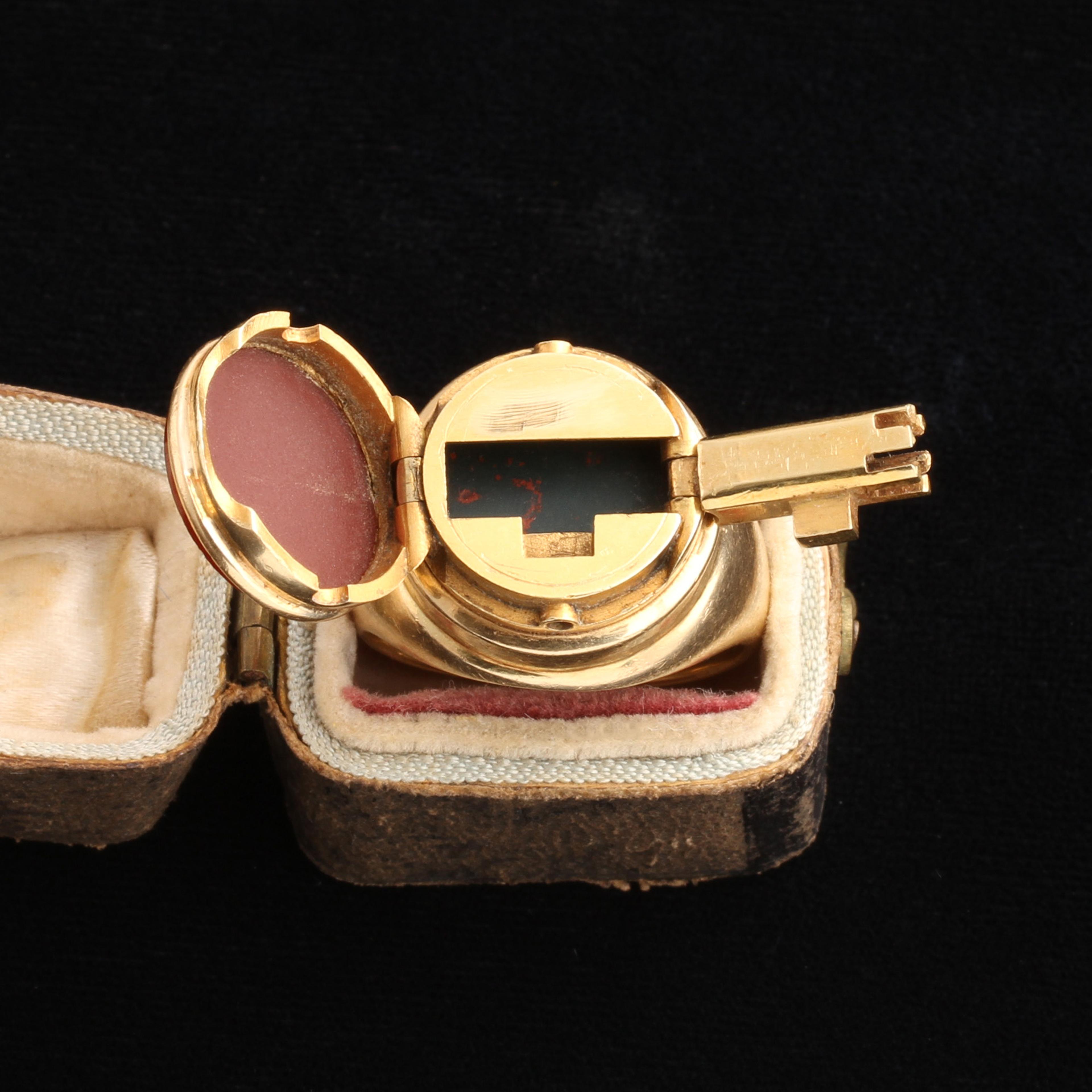 Since the days of Ancient Rome, rings have been adapted to be not just decorative objects, but also useful ones. Sometimes they are also lockets (to hold poison as well as mementos), or they are watches, or as in the case of this ring, they are also keys. This incredible and rare Victorian piece holds a key that discreetly tucks into the head of the ring and is concealed by a hinged round carnelian locket. Beneath the key almost entirely hidden from view is a bloodstone slab - a nice detail. The key would have opened a small box used to hold jewelry, money, or other valuables.