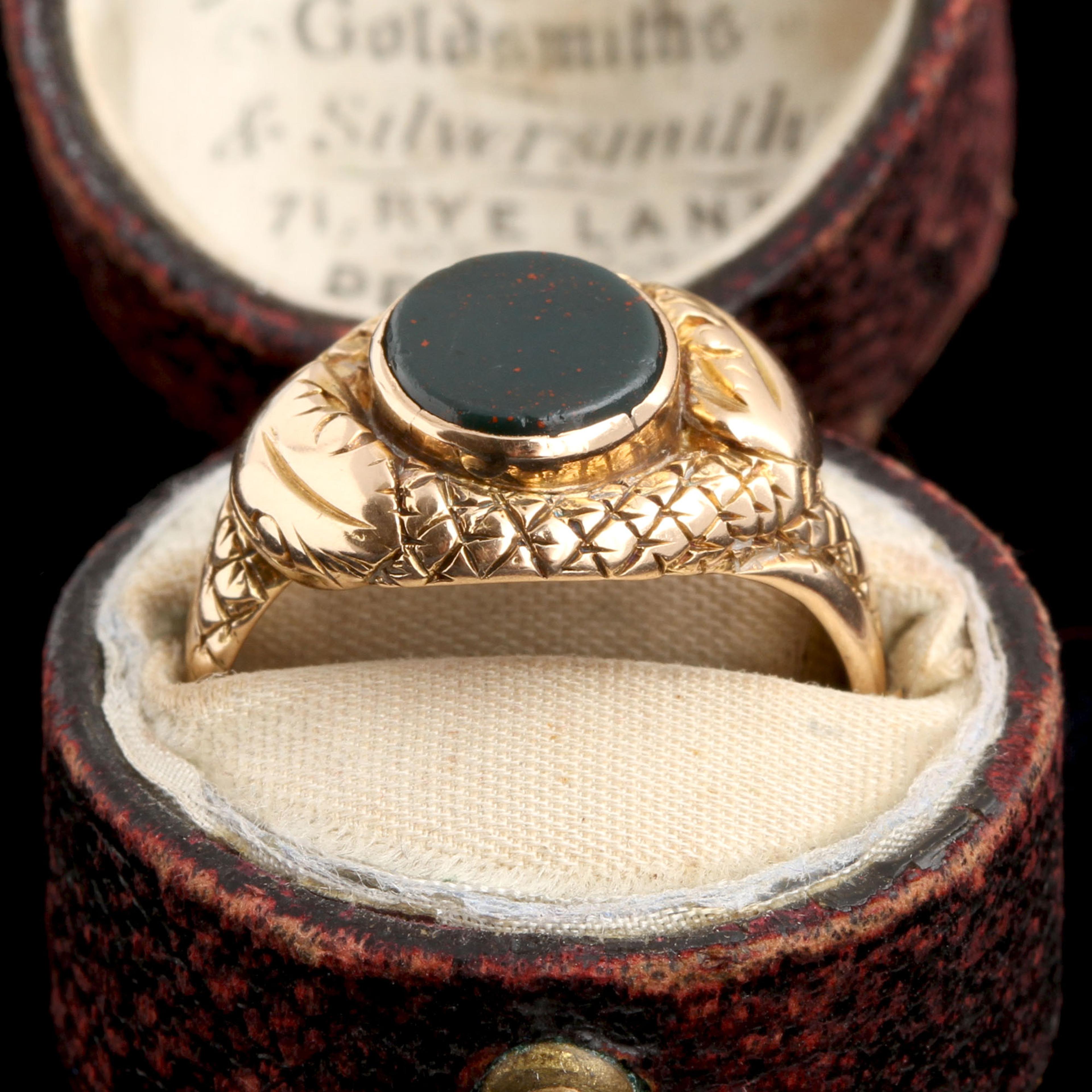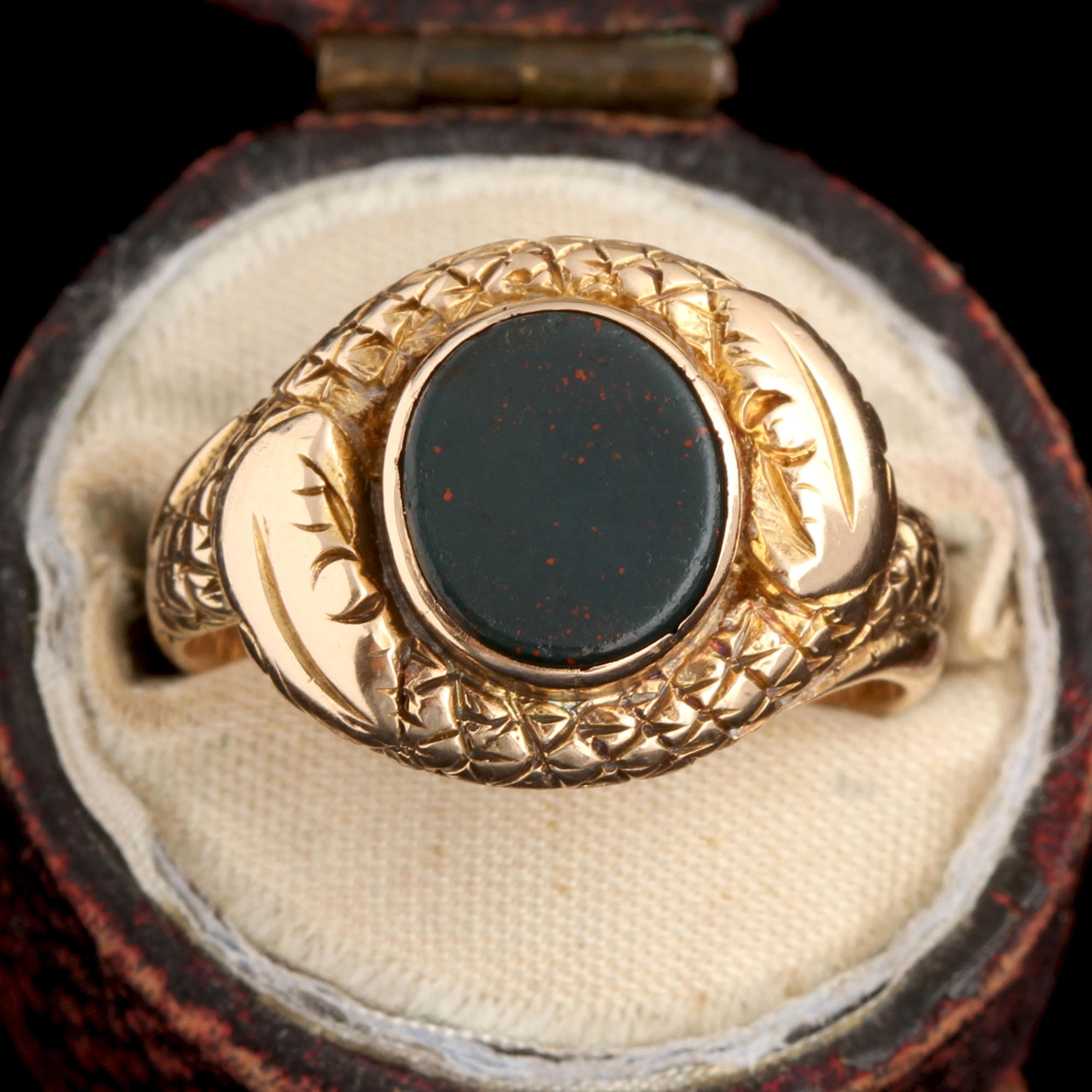 This ring’s hallmarks tell us it was made in 1878 in Birmingham, a hub of jewelry production and innovation in the Victorian era. The city supported over 700 workshops at that time which produced a LOT of on-trend accessories to the English middle and upper classes. Two serpents encircle a bloodstone oval; they have wonderfully carved scales and their heads are softly rubbed from years of loving wear.