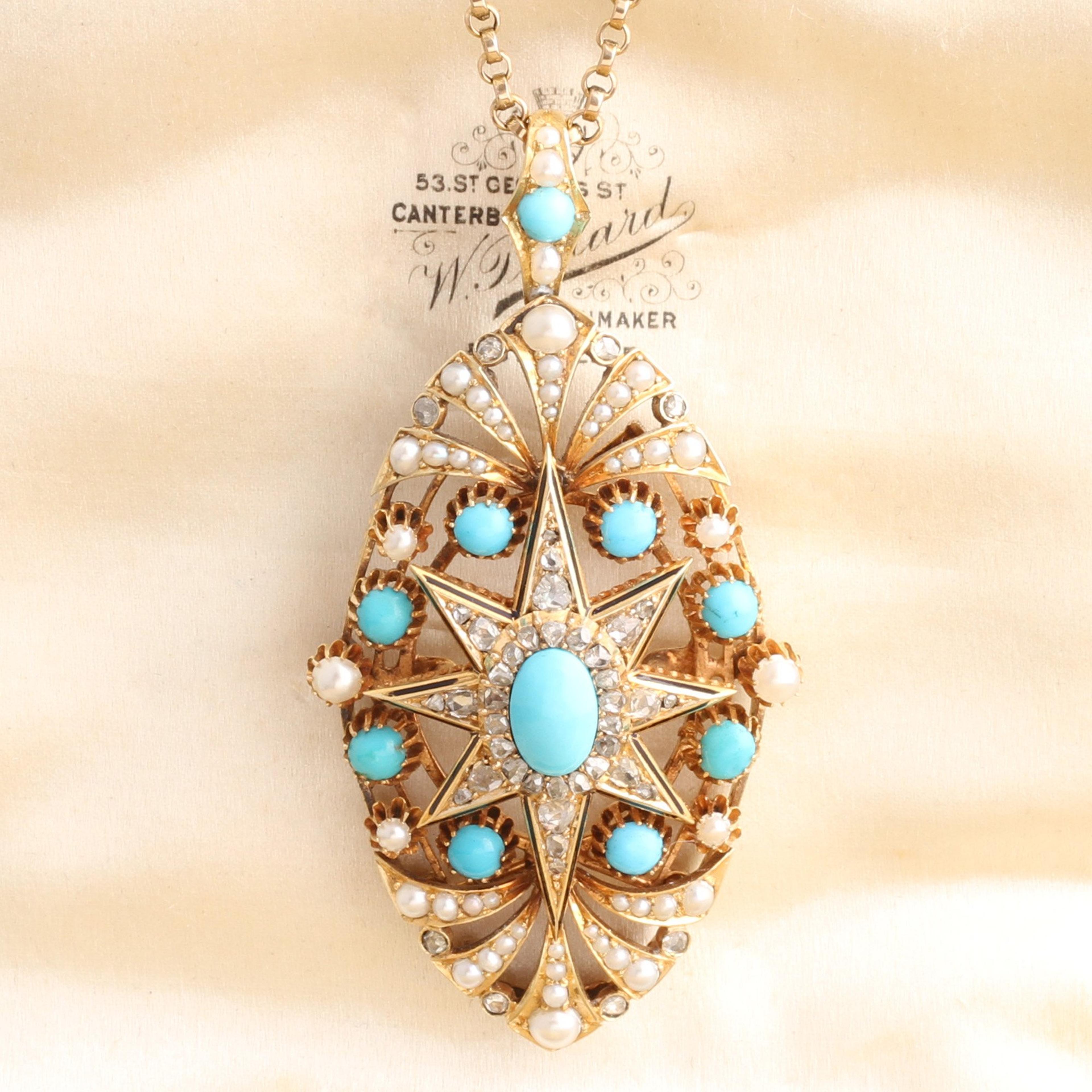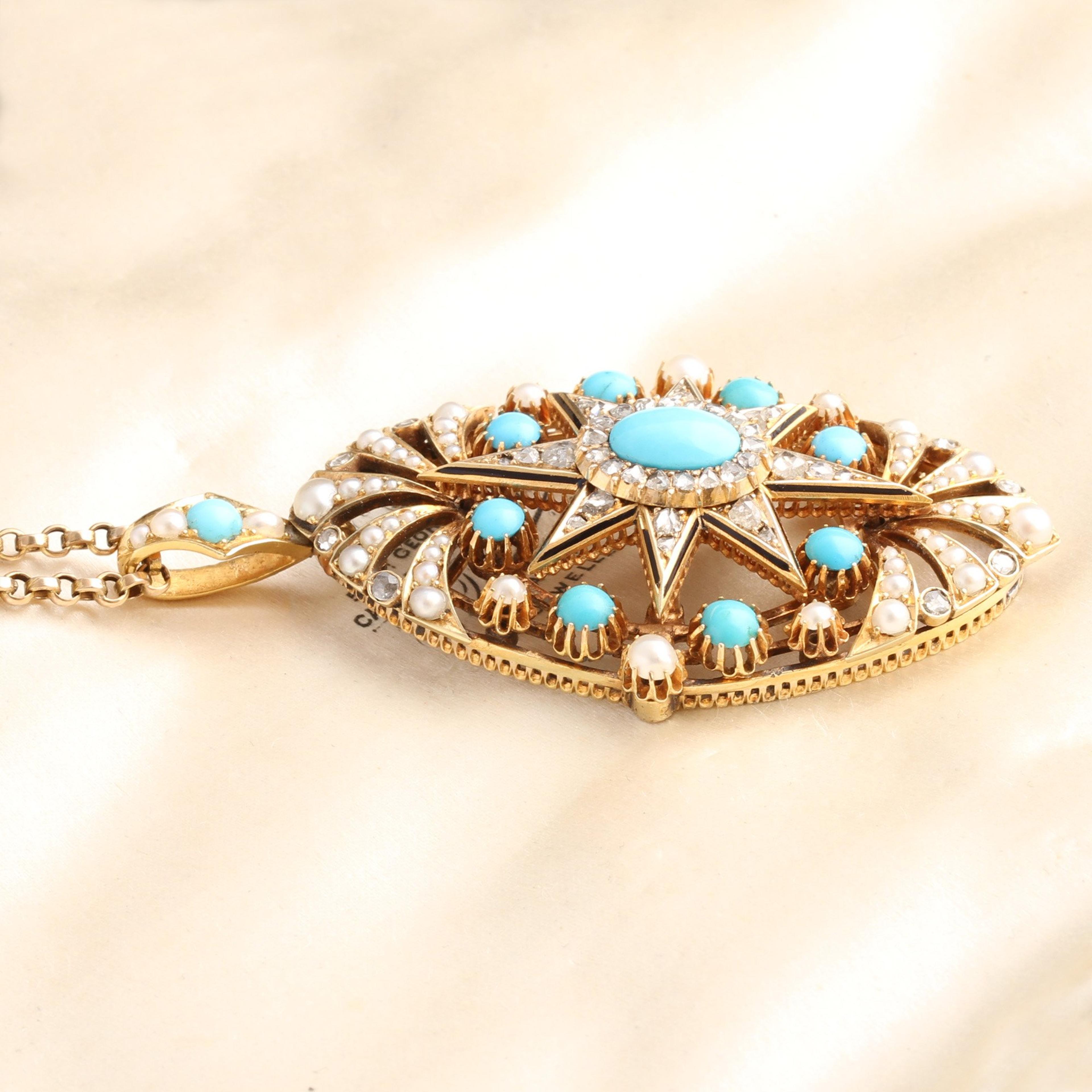 This very large and very outstanding Victorian era starburst pendant is rendered in 18k yellow gold and is absolutely encrusted with gemstones. The arms of the starburst at the center are lined with black enamel and studded with rose cut diamonds and surmounted by an oval Persian turquoise cabochon within a halo of yet more rose cut diamonds. The celestial focal point sits within a frame of turquoise cabochons and is capped with a spray of seed pearls with interstitial rose cuts. Hangs from an 18" antique 9k gold chain.
