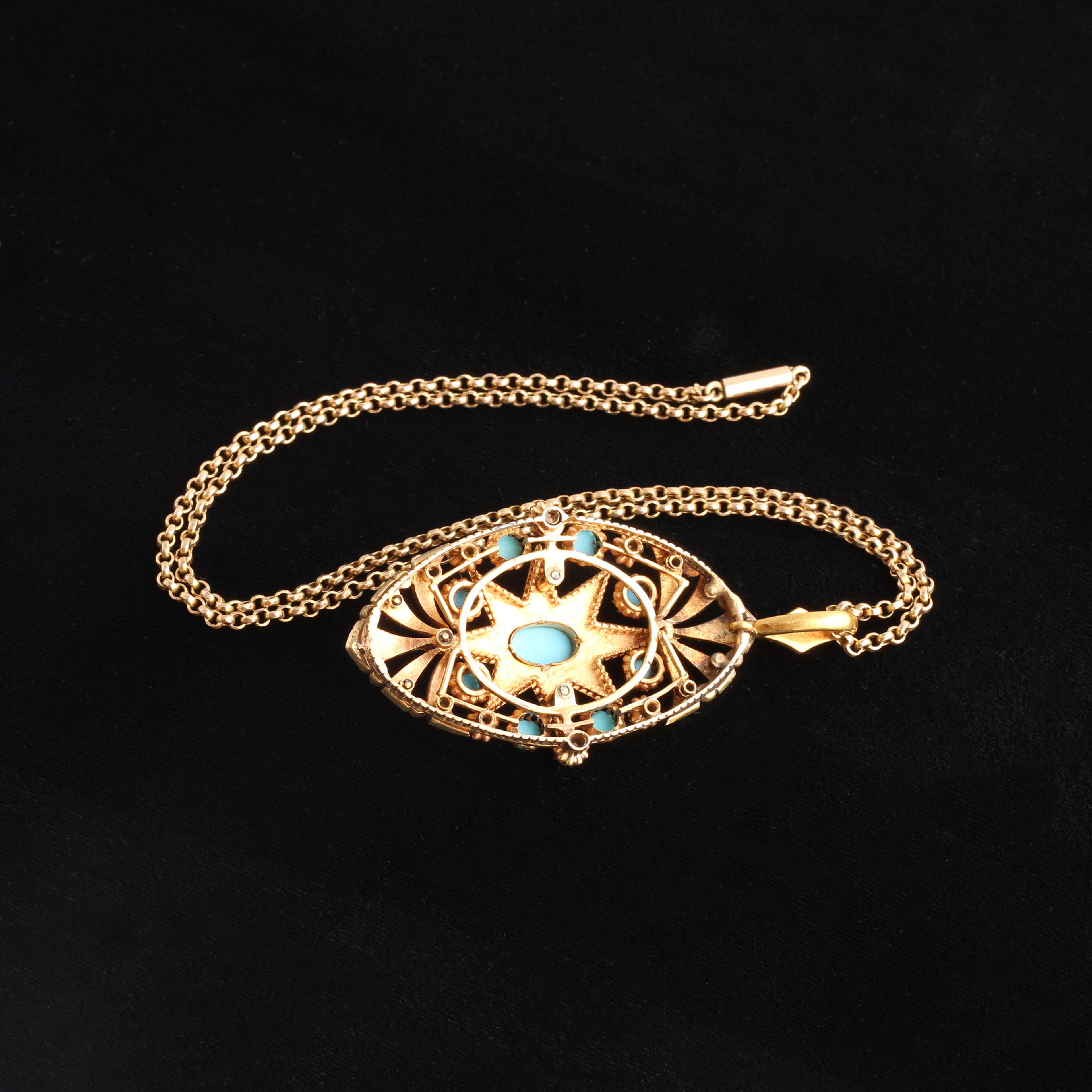 18k yellow gold, enamel, 44 rose cut diamonds, 9 4mm turquoise cabochons, 9.5 x 6.5mm enter turquoise cabochon, seed pearls, 9k gold chain.