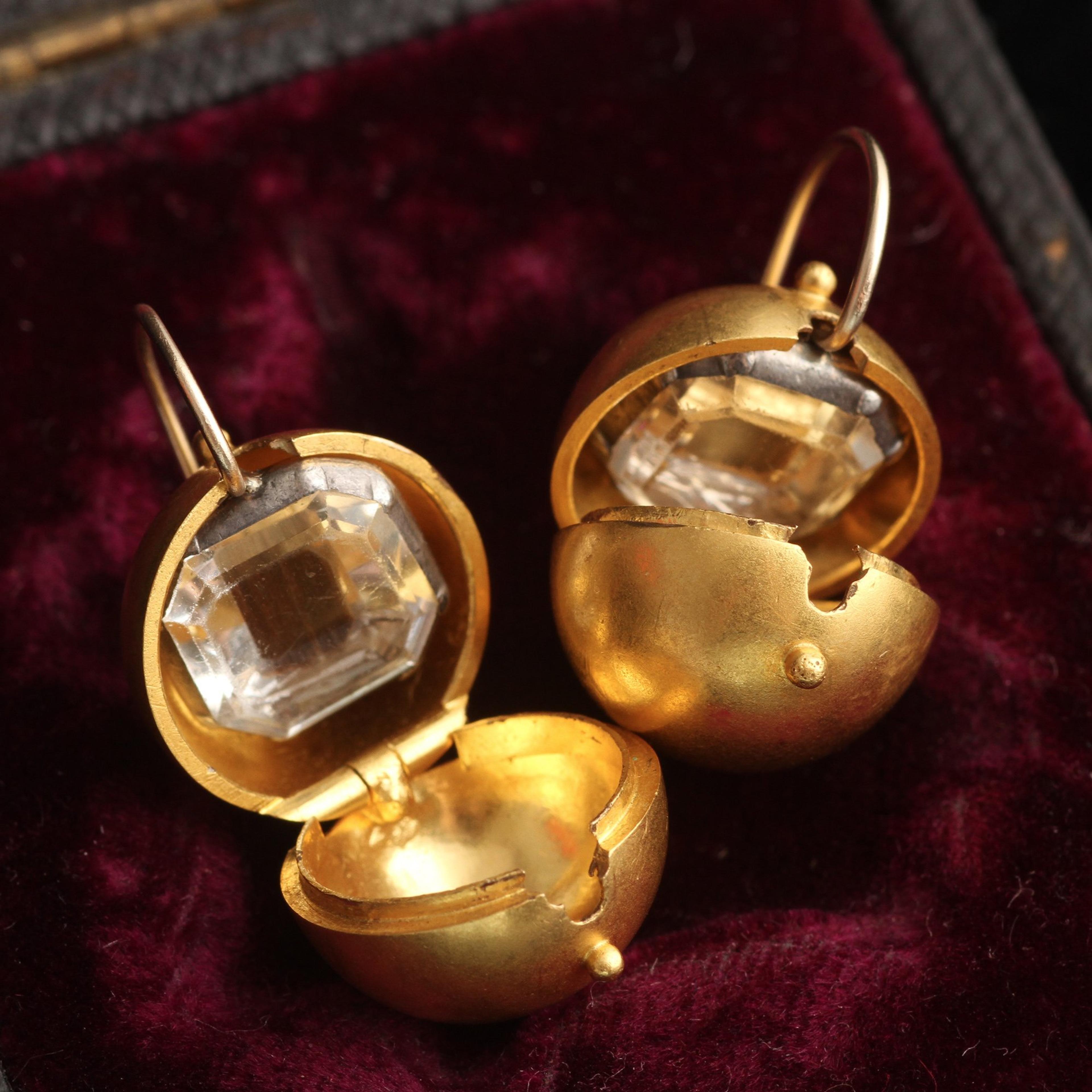 These ultra rare coach covers are a collector's dream come true. An invention of the late 19th century, coach covers take their name from what was their primary intended use; the hinged spheres fastened over diamond drop earrings to conceal the valuable stones from robbers and highwaymen while in transit (by coach, obviously). Upon arrival at the fabulous dinner or party or ball, the coach covers would be removed to reveal the dazzling gems within. The secondary use for coach covers would be as a day-to-night accessory - the covers would be worn over flashy earrings to give them a modest appearance suitable to the daytime, and then removed for evening hours when more elaborate jewels were appropriate.