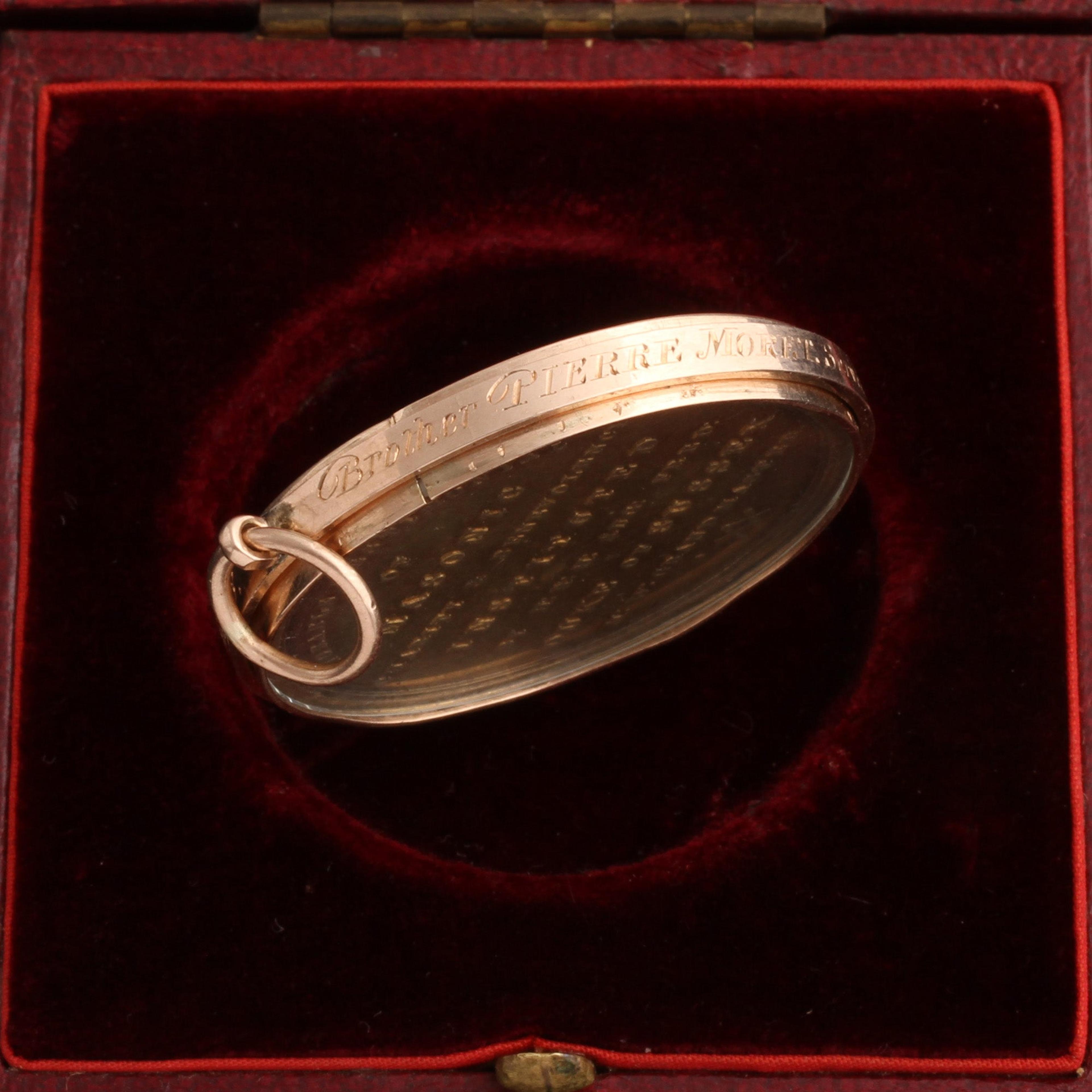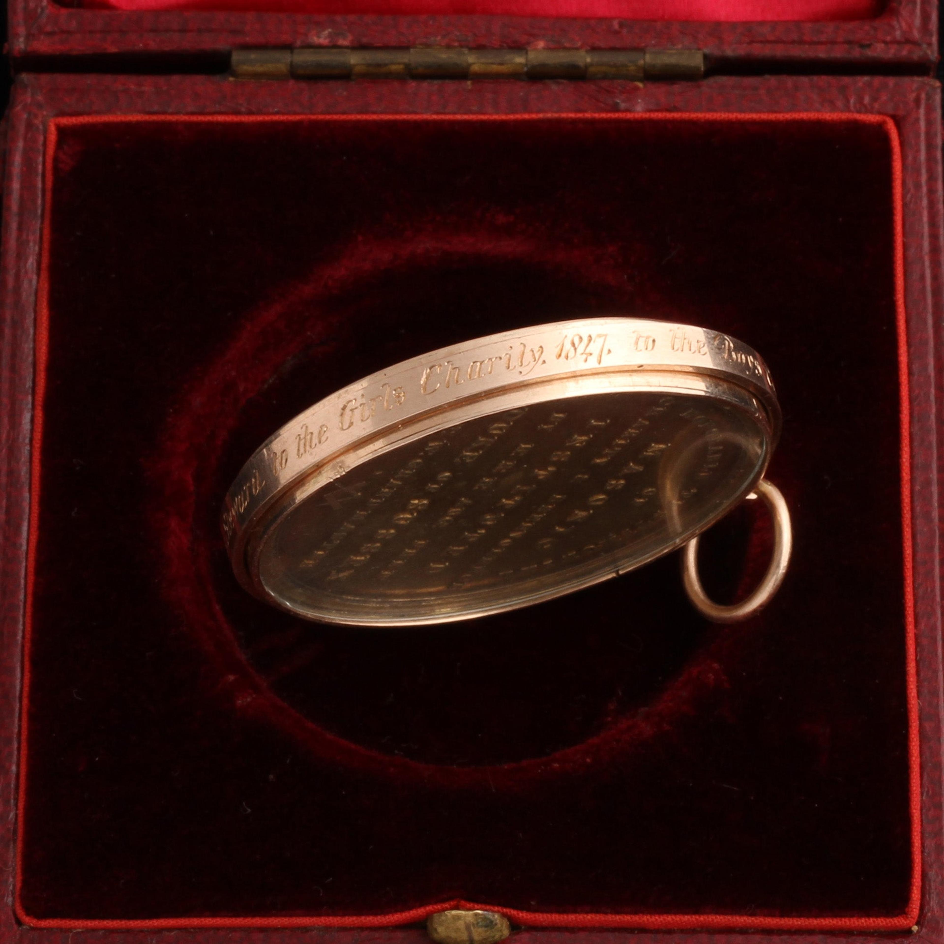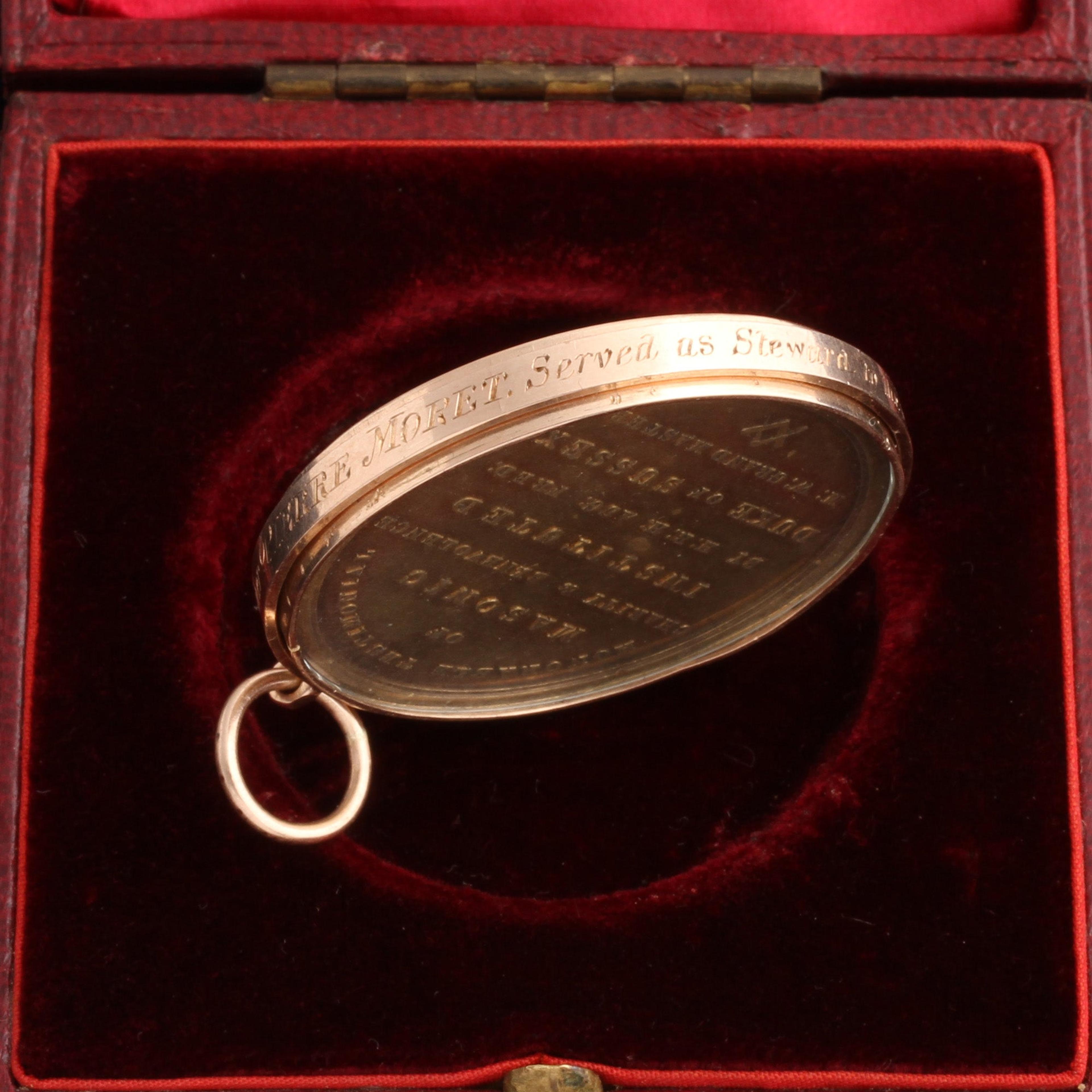 Augustus Frederick, Duke of Sussex and favorite uncle of Queen Victoria, was Grand Master of the United Grand Lodge of England, the governing body of Freemasonry in both England and Wales. This medal, an award for service, was presented only a few years after his death in 1843. The front of the medallion features a seated woman with her arms around a young boy and girl beneath the symbol of the all seeing eye. The obverse reads: "Honorable Testimonial of Masonic Charity & Benevolence Instituted by H:R:H: Aug[ustus] Fed[erick] Duke of Sussex M: W: Grand Master". The medal is fitted in gold and engraved along the outer edge, "Brother Pierre Moret Served as Steward to the Girls Charity 1847, to the Boys Charity 1848". The Royal Masonic Trust for Girls and Boys still exists to this day with the purported aims of relieving poverty and advancing education for children and young people. Originally, this piece would have been suspended from a ribbon and ceremonially pinned to a lapel.