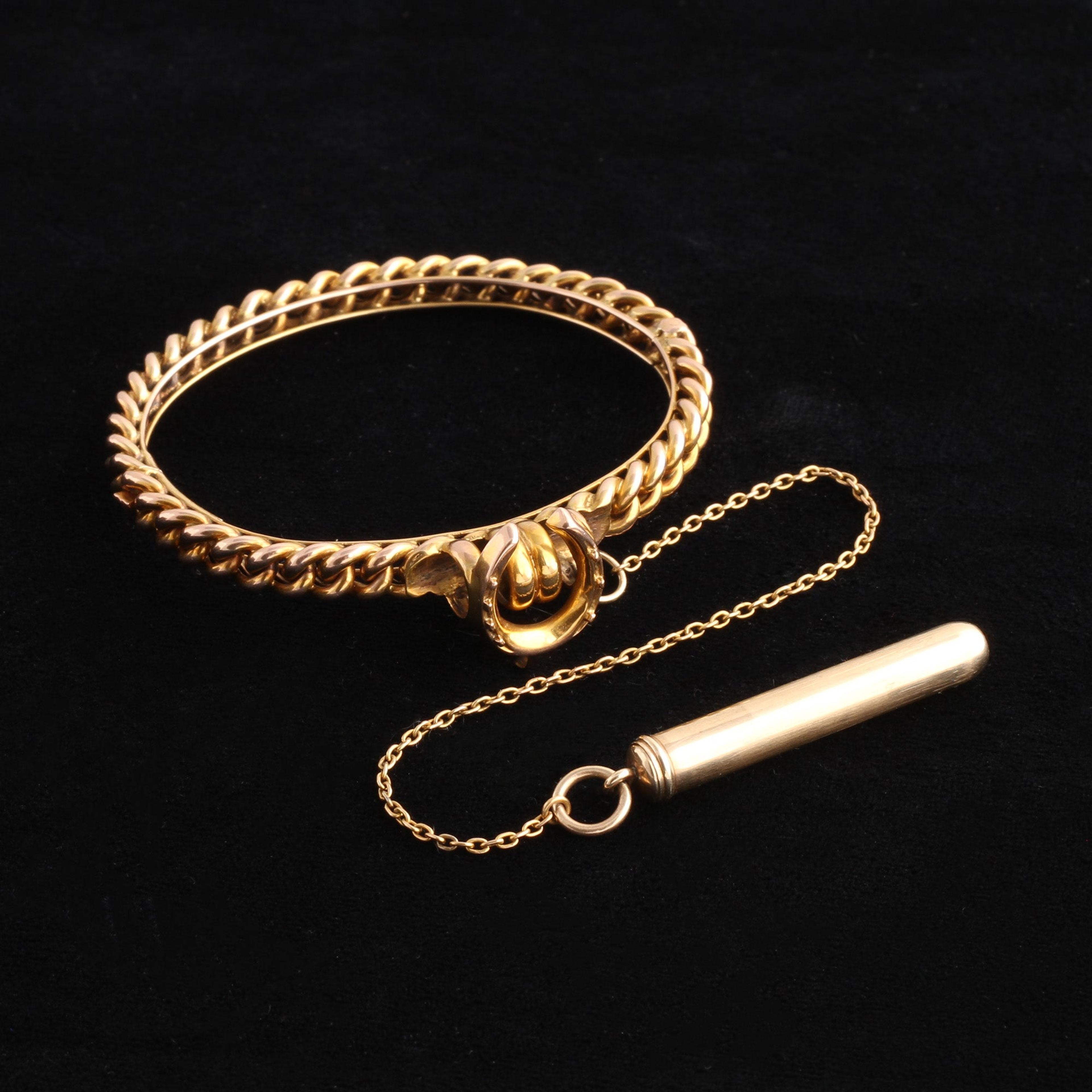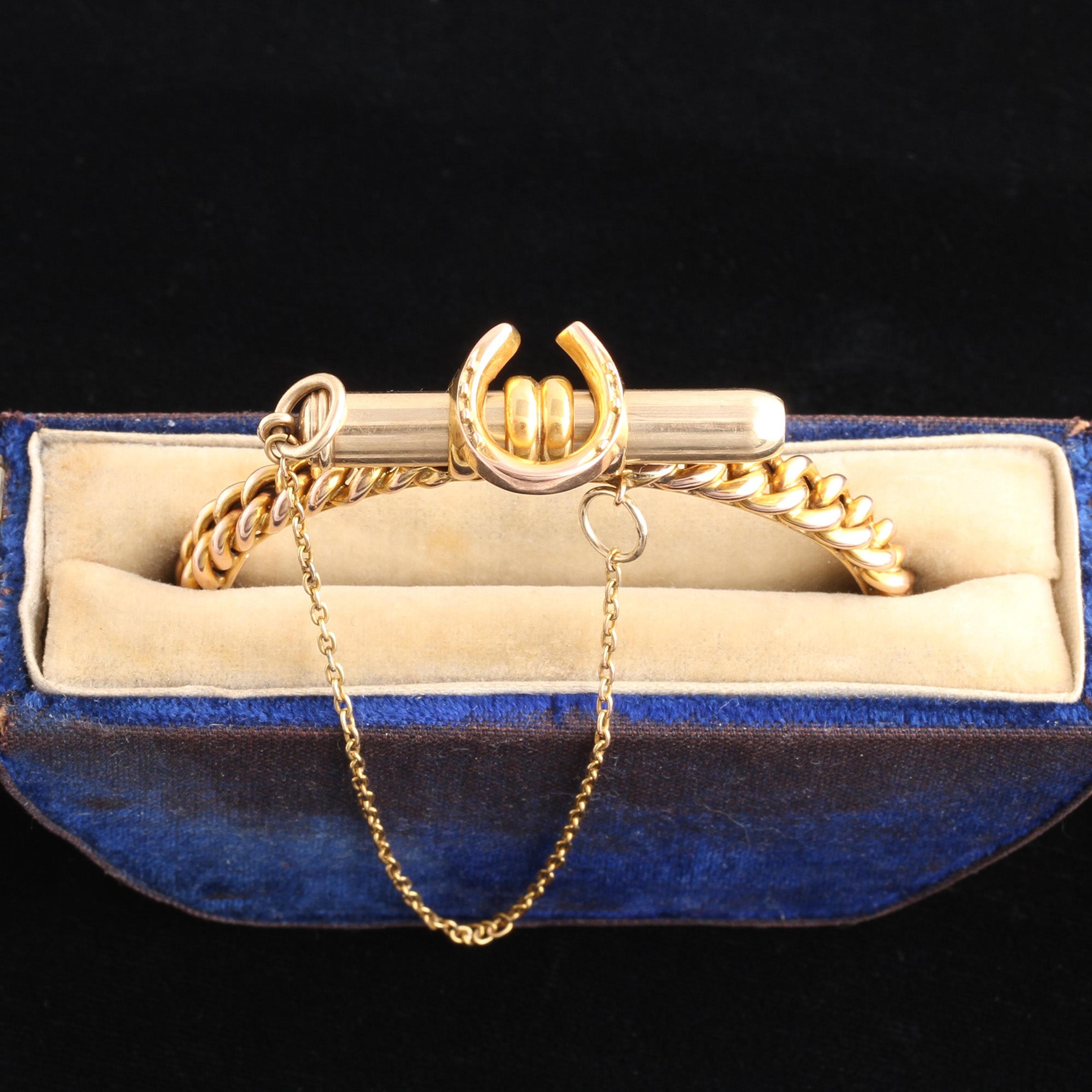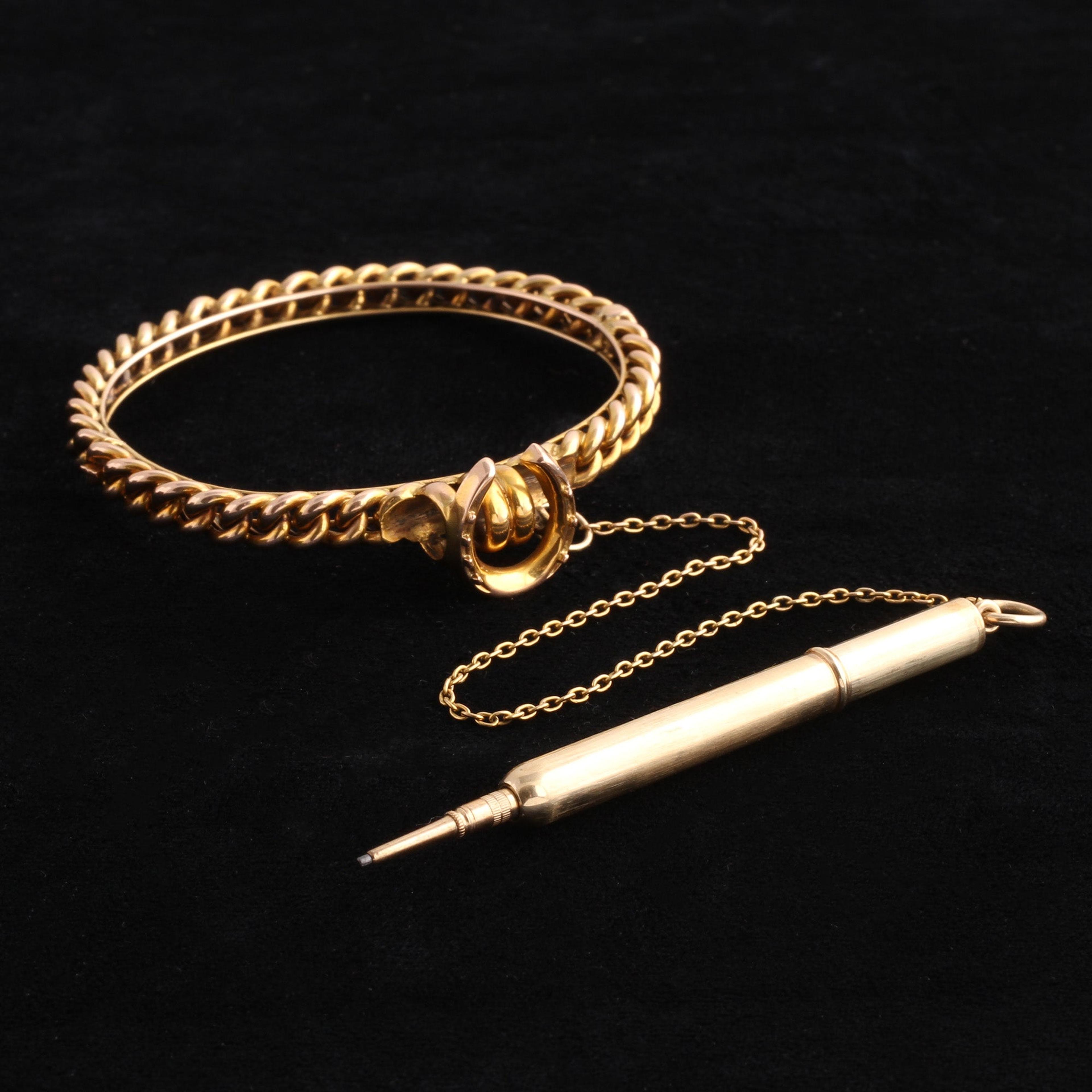 This wonderful Victorian bracelet combines function and form to a tee. Fashioned in 9k gold, the horseshoe at the head of the bangle holds a removable pencil. The pencil telescopes out to just over 3" in length and has retained some of its original lead. This bracelet would have been worn by a young Victorian debutante and used to record the names of her partners on her dance card. Comes in its original box.