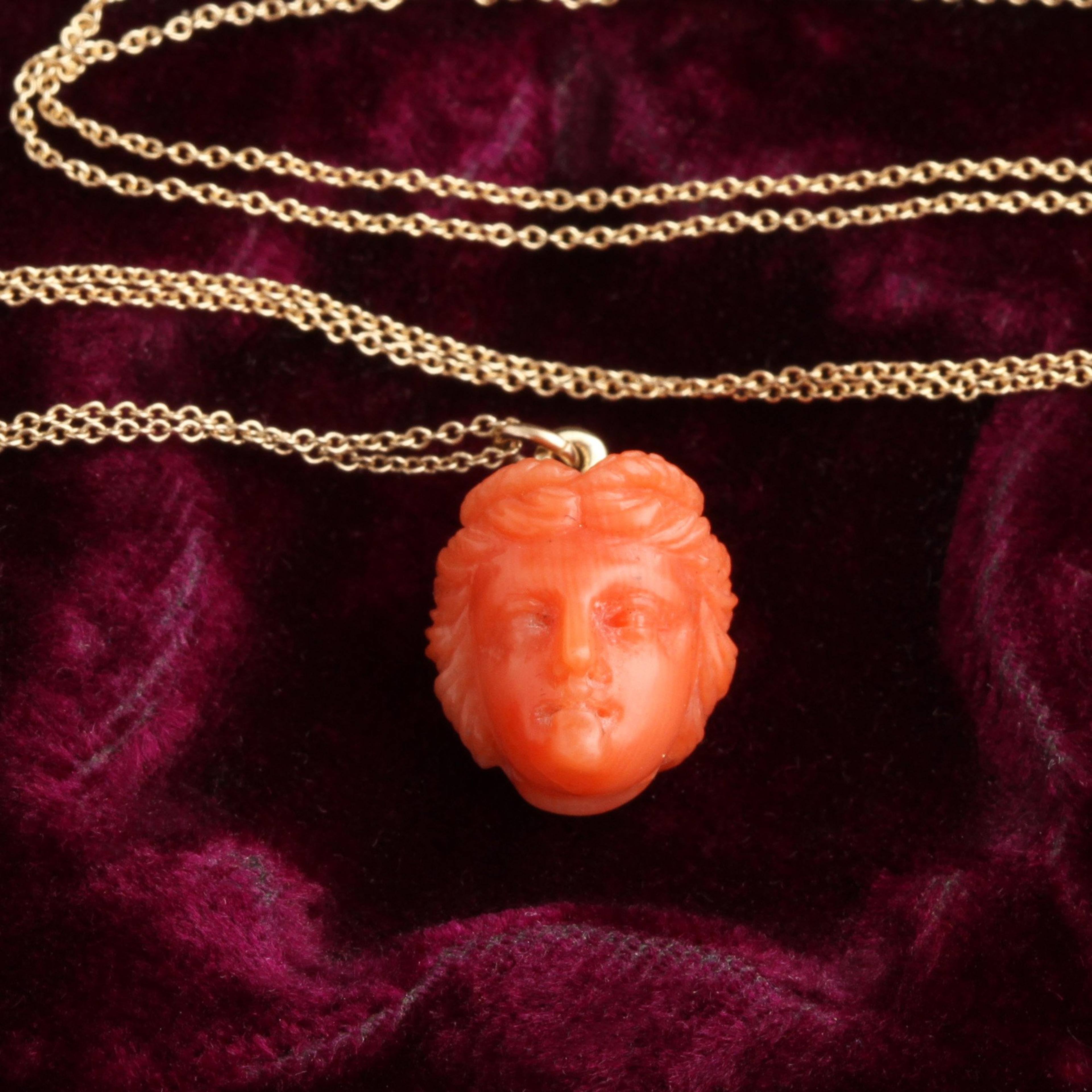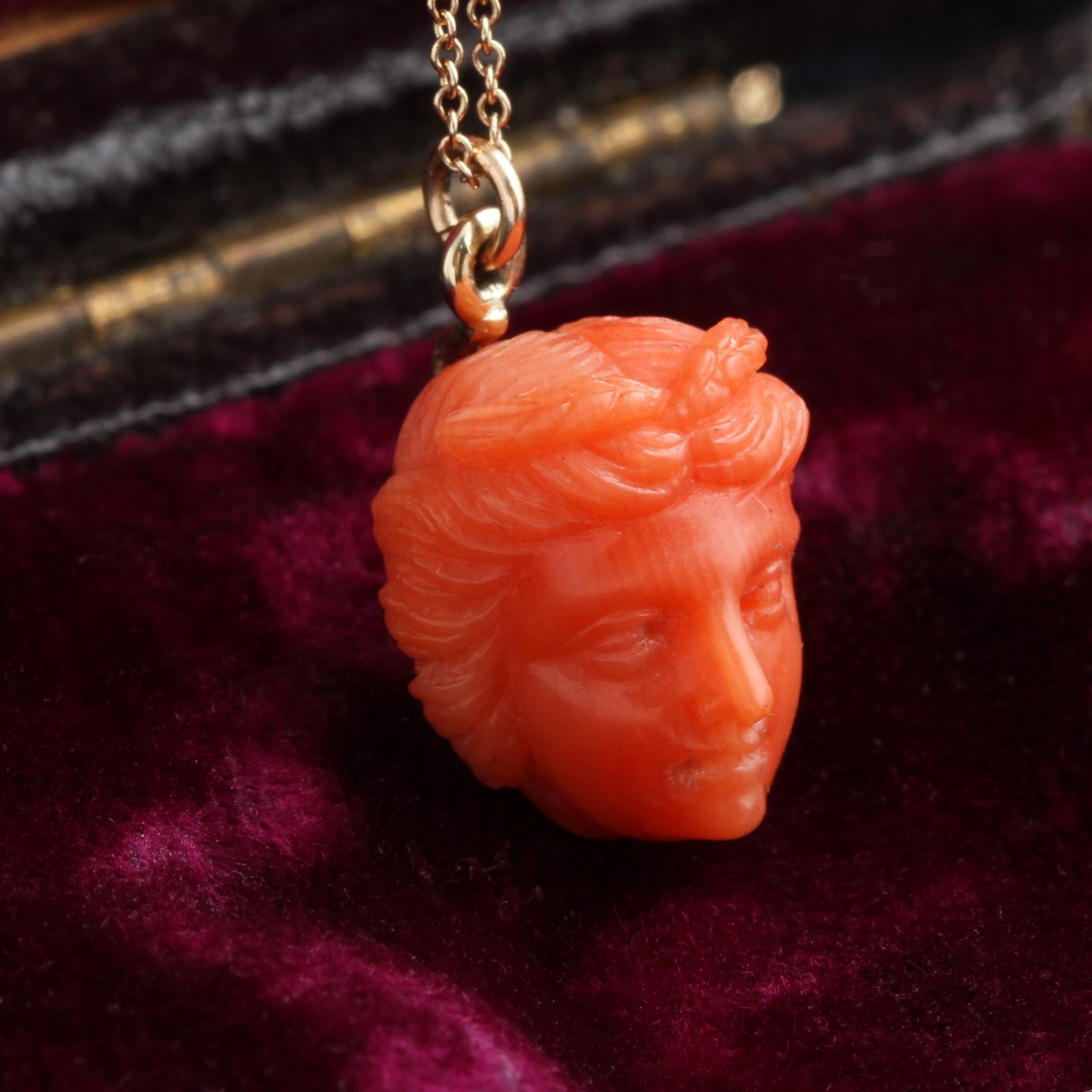 Demeter is the Greek goddess of agriculture, fertility and harvest and represents the autumn season. This tiny and exquisitely rendered coral carving of Demeter depicts her with a crown of wheat. It is very likely this lovely little pendant was a souvenir from the Italian leg of the Grand Tour. Hangs from a new 18" 14k gold chain.