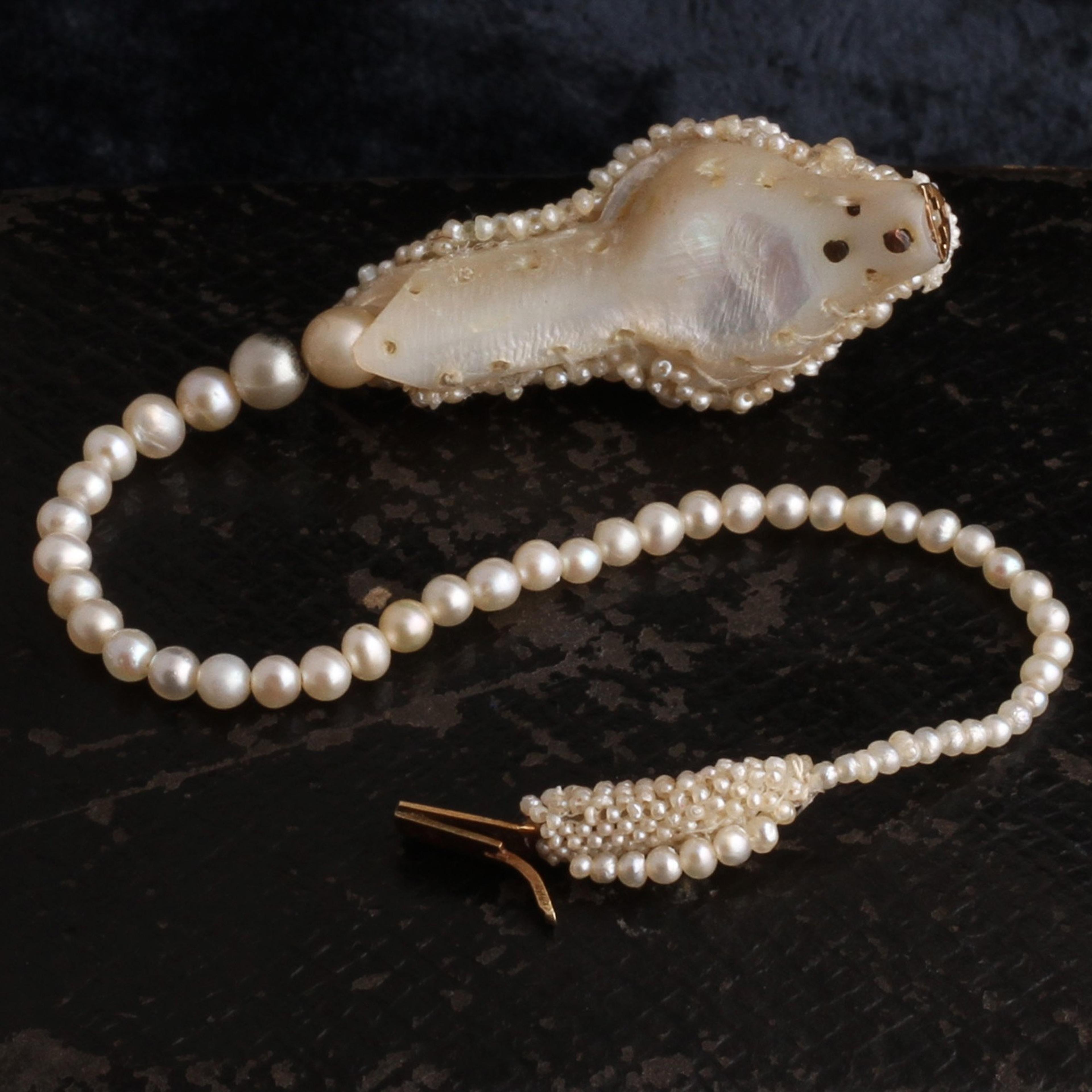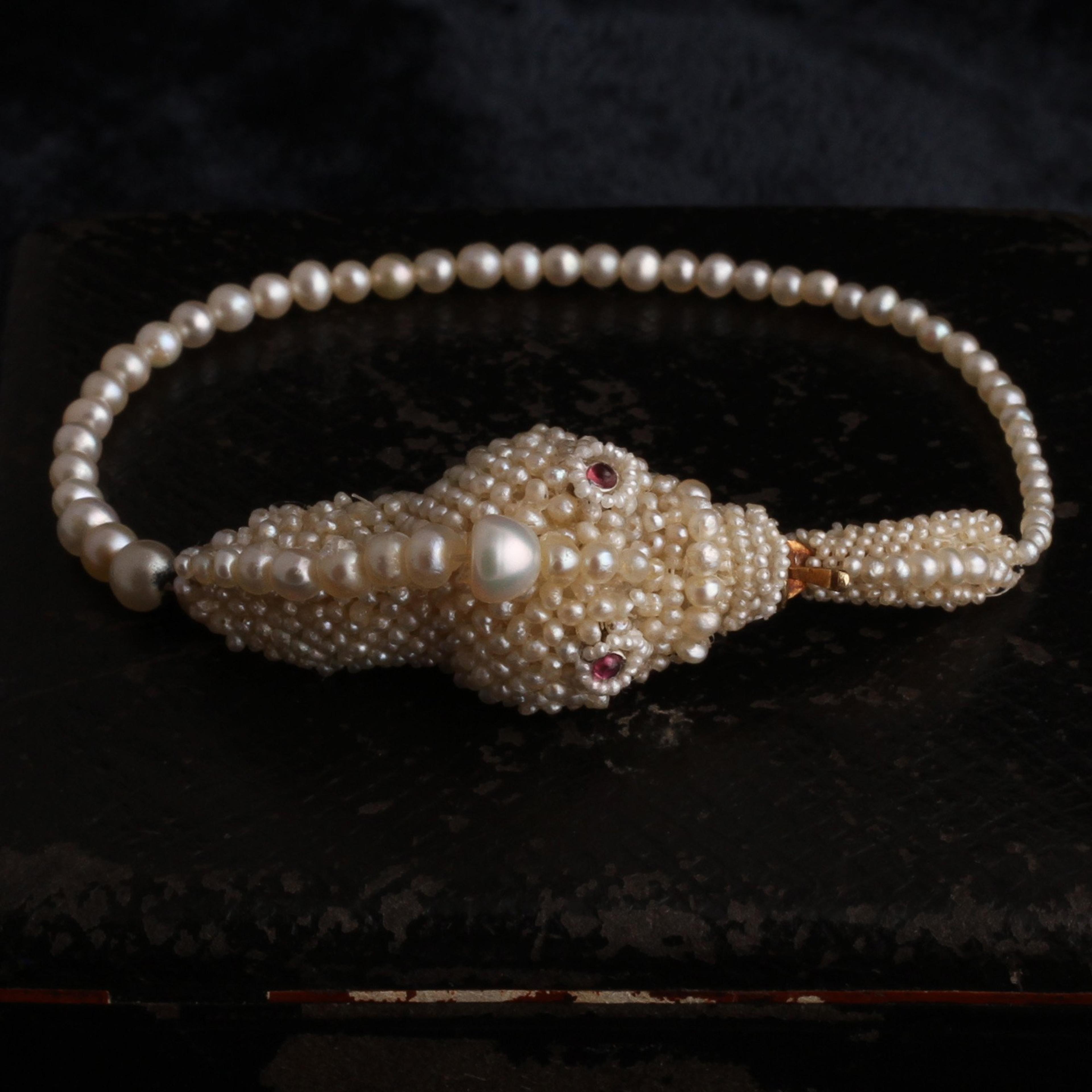 Over the past several millennia, the snake has been used to represent many things: both good and evil, as well as fertility, passion, and rebirth. The Victorians employed the image of the snake as a symbol of everlasting love. This beautiful and incredibly unusual snake bracelet is fashioned almost entirely in pearls and dates to the late Victorian period. The snaked head is crowned with a row of larger pearls and its garnet eyes are framed with a strung fringe of tiny seed pearls. The pearls are strung and sewn onto a mother of pearl base. An absolutely stunning piece sold in its original box.