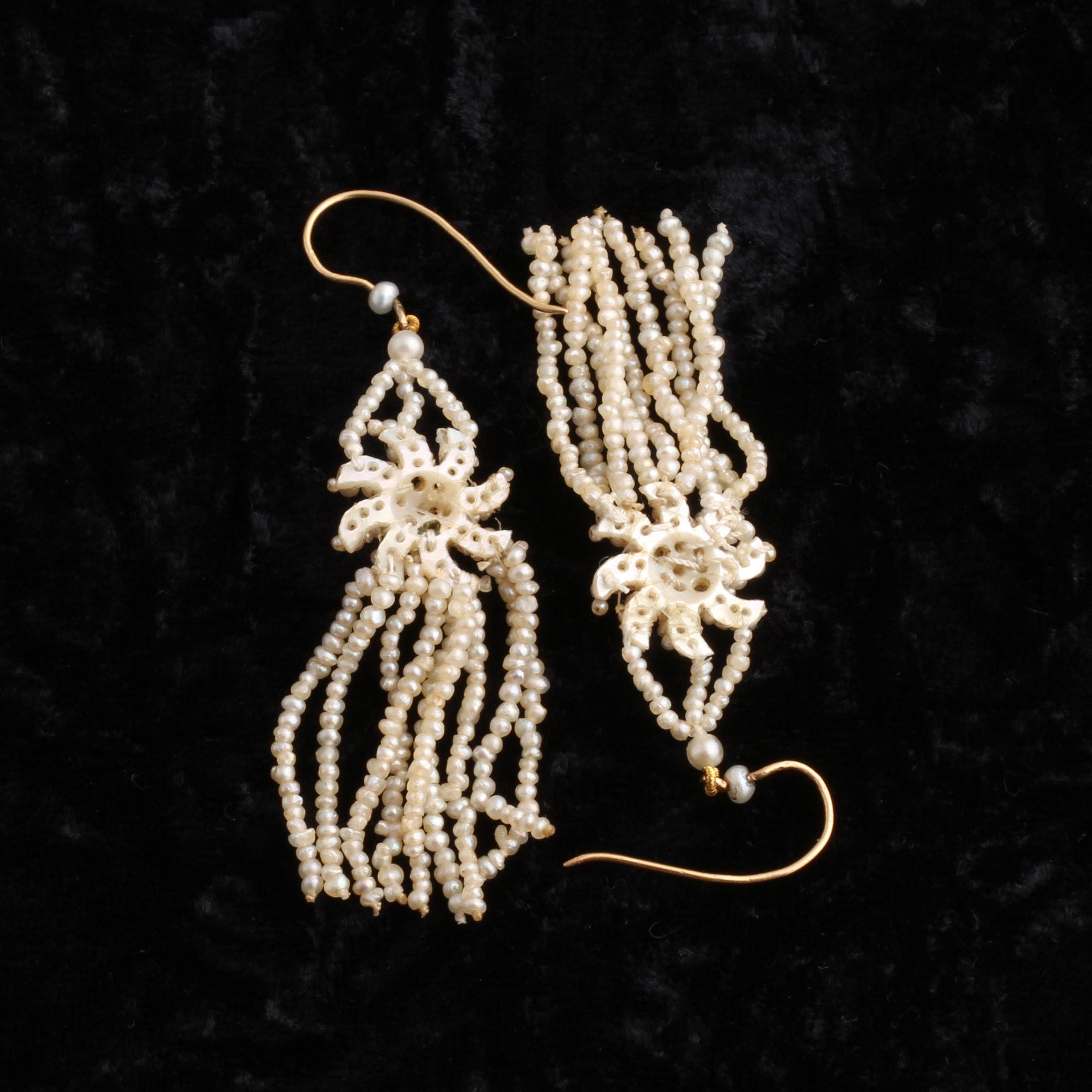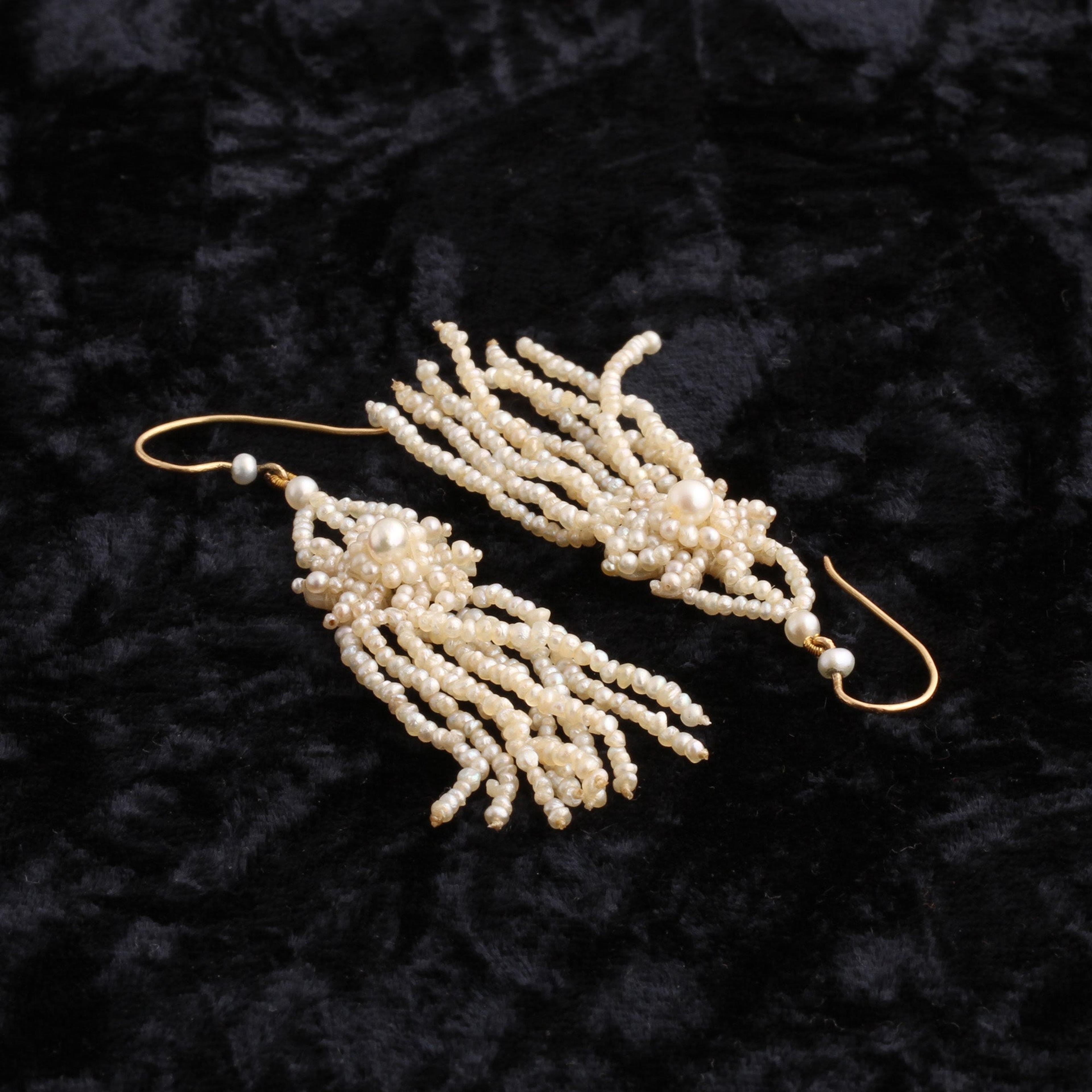 A pair of Victorian tassel earrings made entirely of seed pearls and mother of pearl. The strung pearl tassels connect to nacre pinwheels onto which additional strings of pearls have literally been sewn in place.