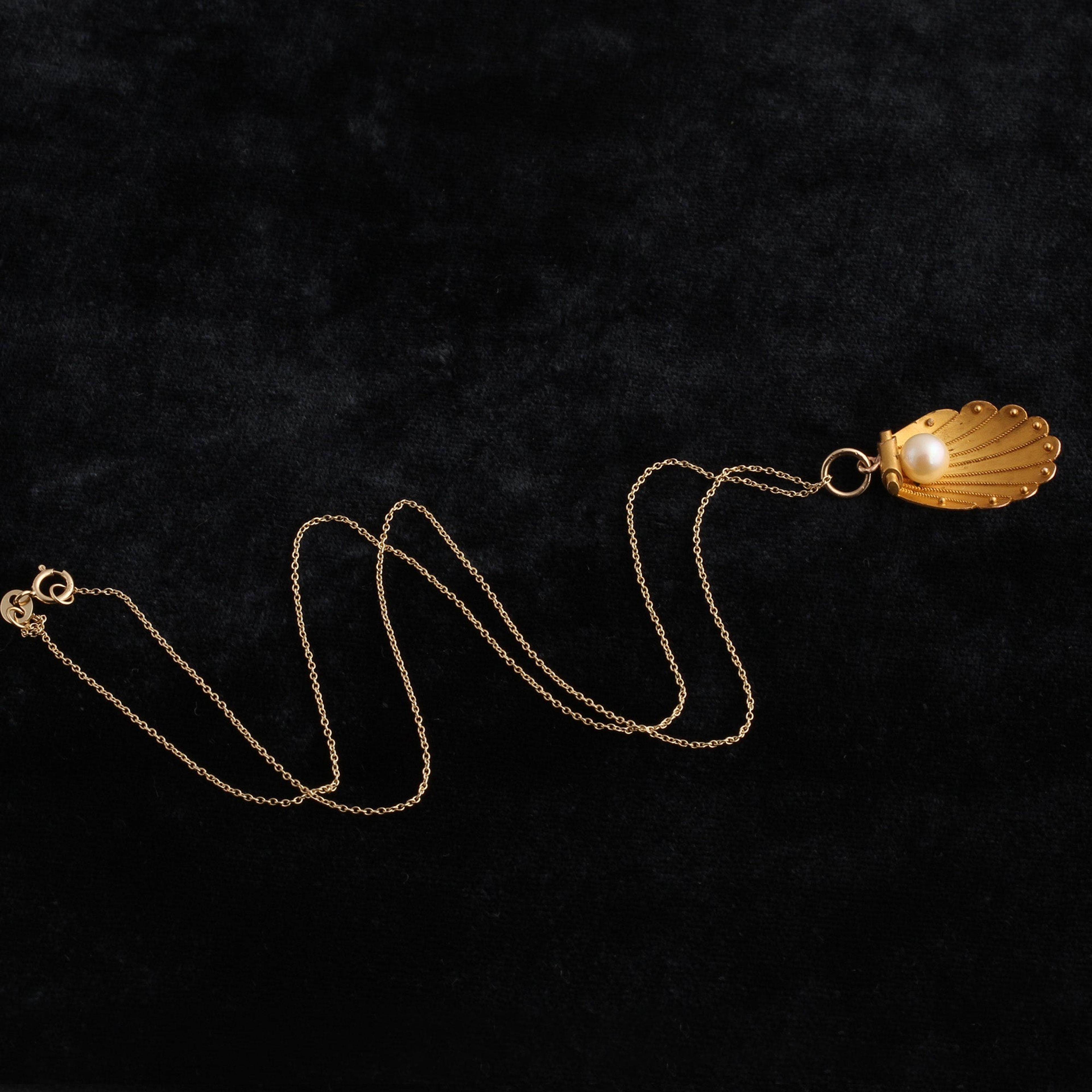 A stylized gold shell charm affixed with a large, luminous pearl. The bivalve is detailed with twisted wire to emulate the fluting of a shell and little beads of granulation along its scalloped edge.