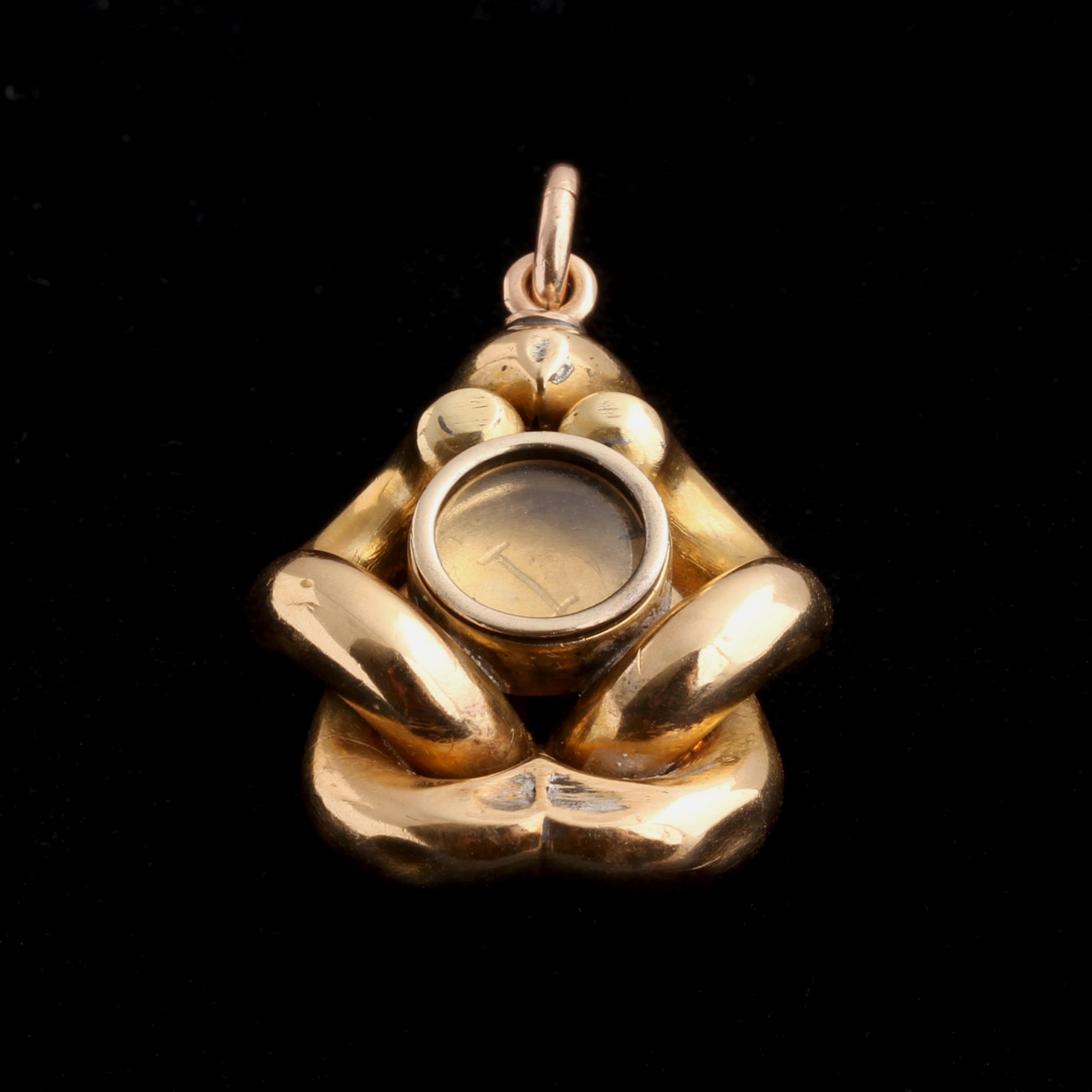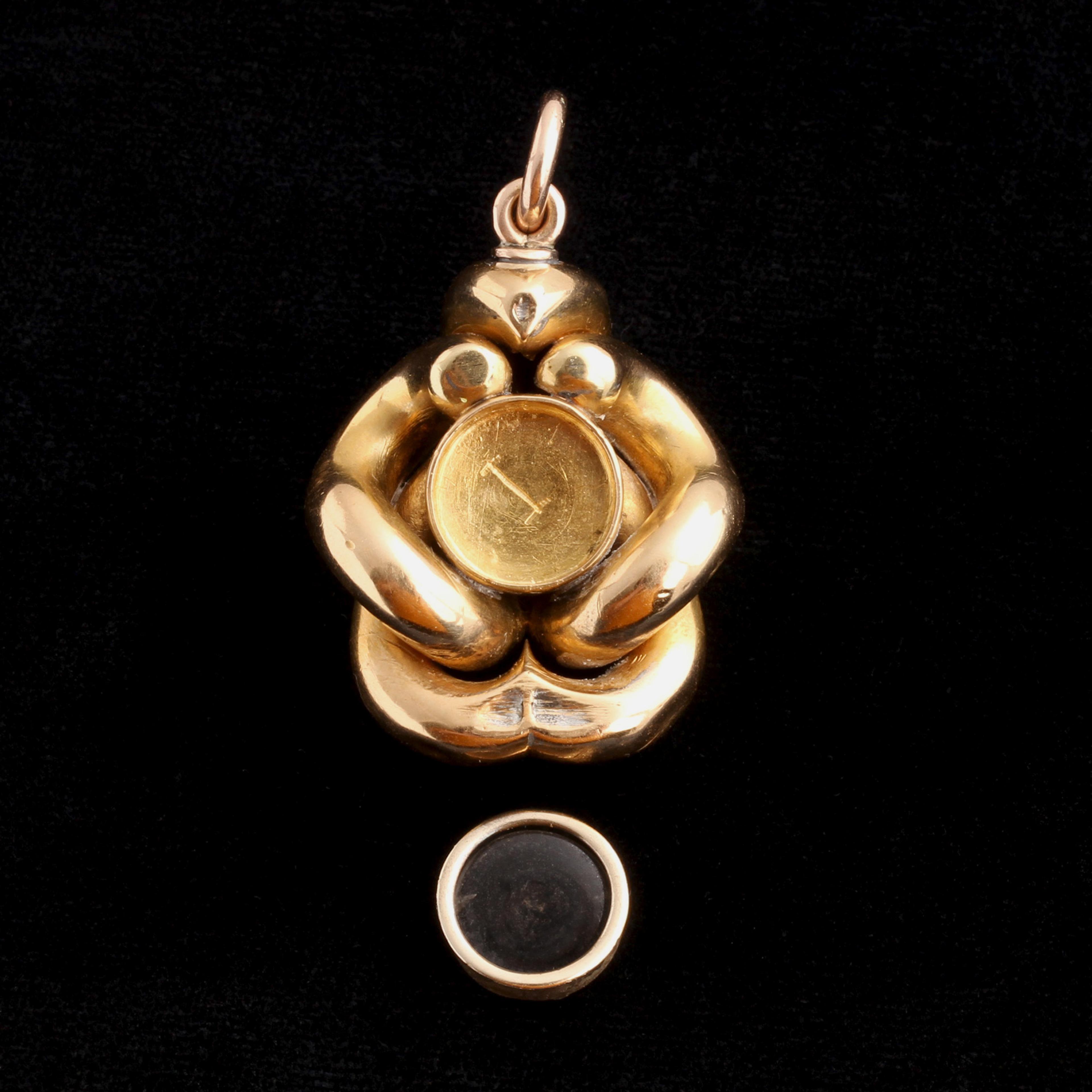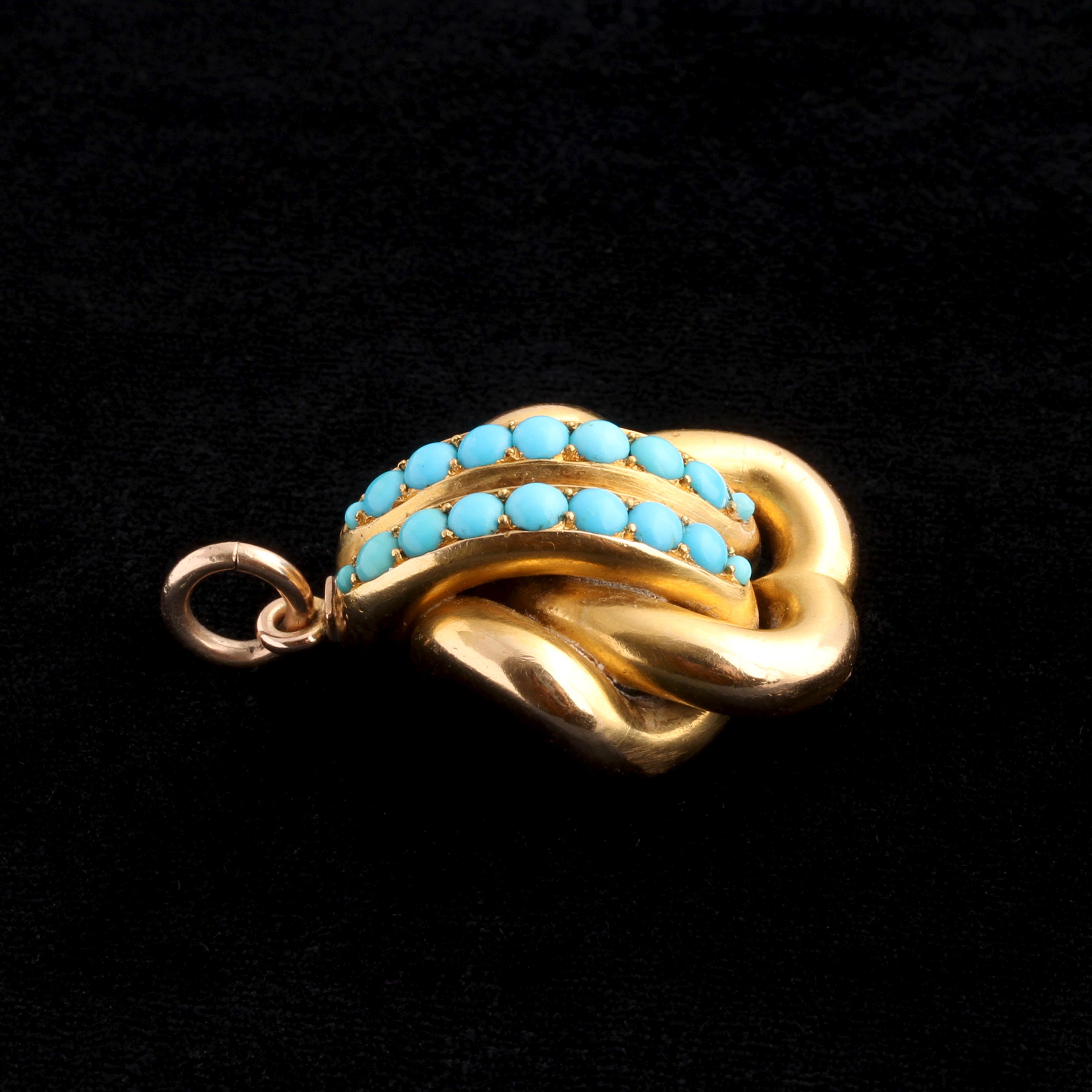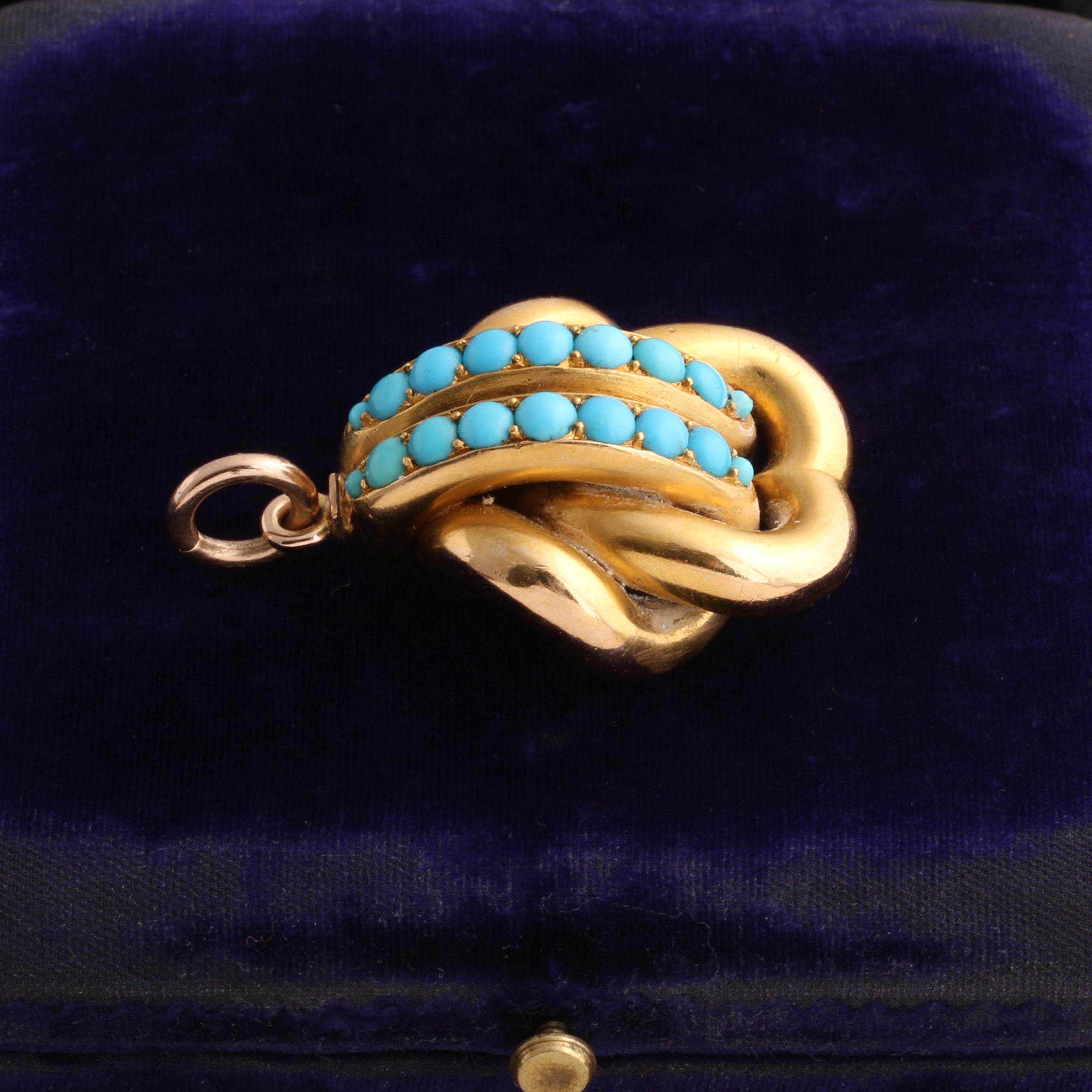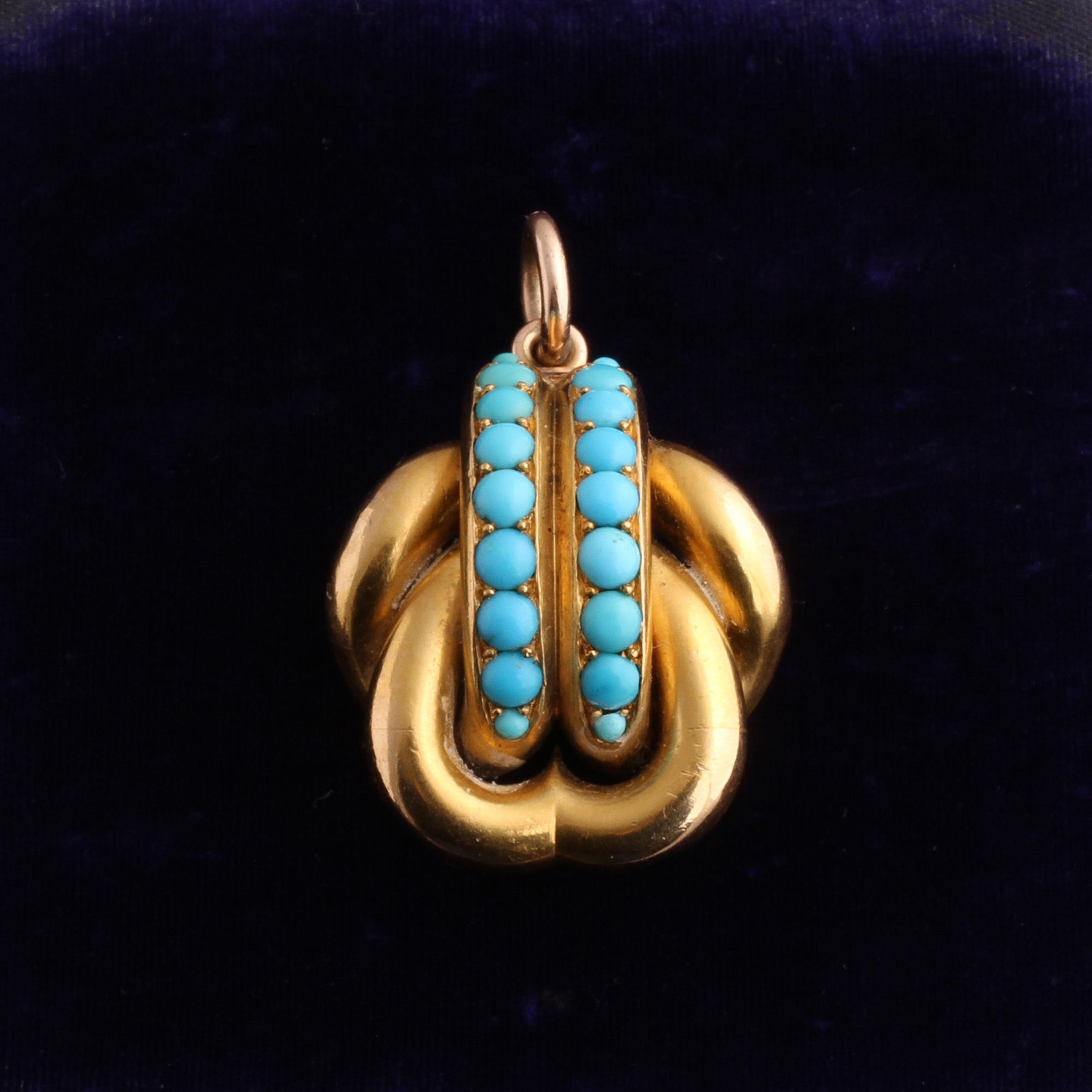 Large in scale, hefty in weight and exquisite in craftsmanship, this Victorian locket is modeled in the shape of an elaborate love knot (note the cleft heart shape at the base). Twin arcs of robin's egg blue turquoise adorn the front and the reverse side holds a small round locket.