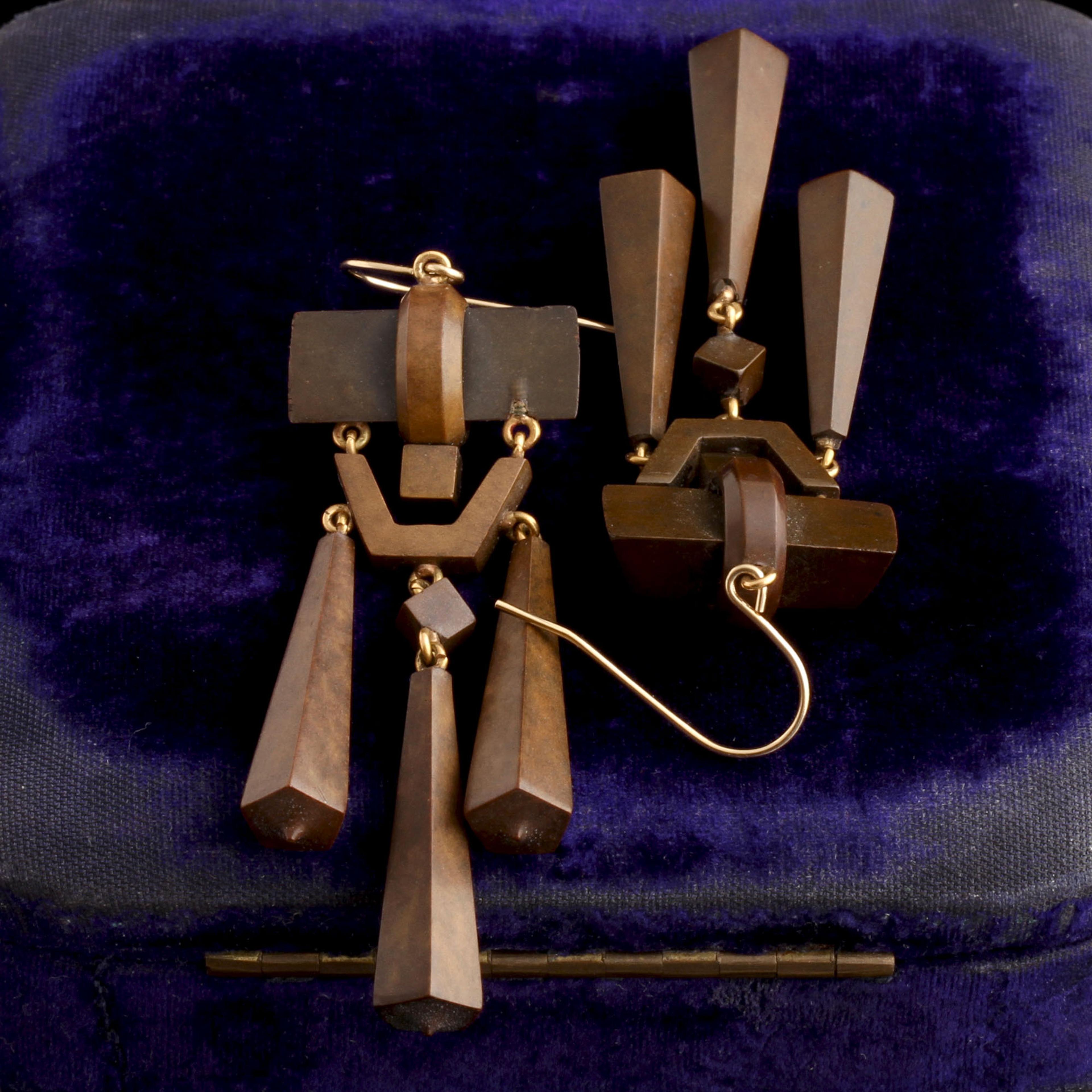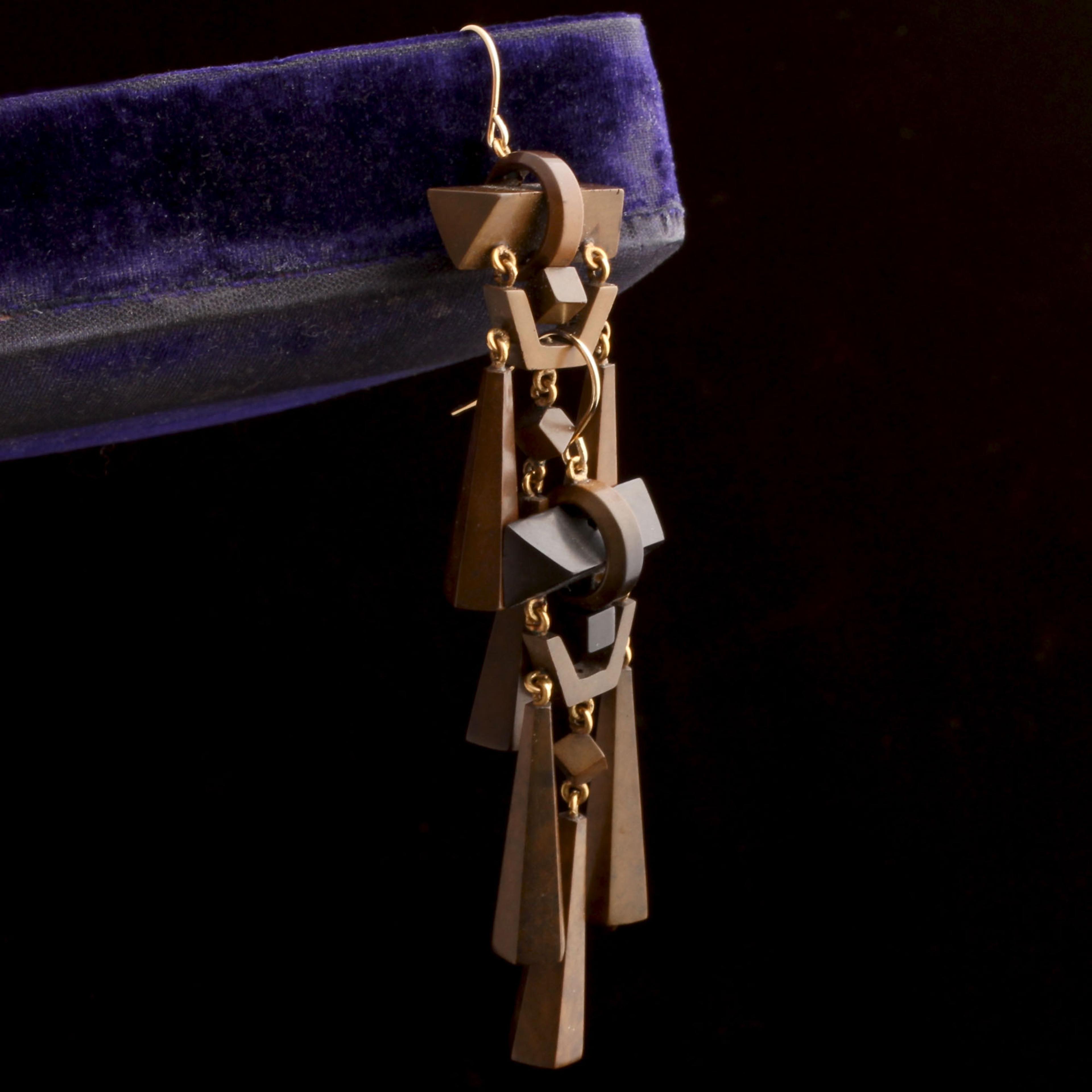 Vulcanite - a combination of sulphur and India rubber - was developed in the mid 19th century by Charles Goodyear (the tire guy). It can be white or lots of other colors, plus it's easy to work with, so it was often used to imitate coral, tortoiseshell and jet. Especially the latter, as black mourning jewelry became more popular in the late 1800s. Vulcanite fades to a fantastic creamy brown color and smells vaguely like burning tires when you rub it. These earrings are a hodgepodge of geometric graphic shapes, and they move fantastically when you walk.