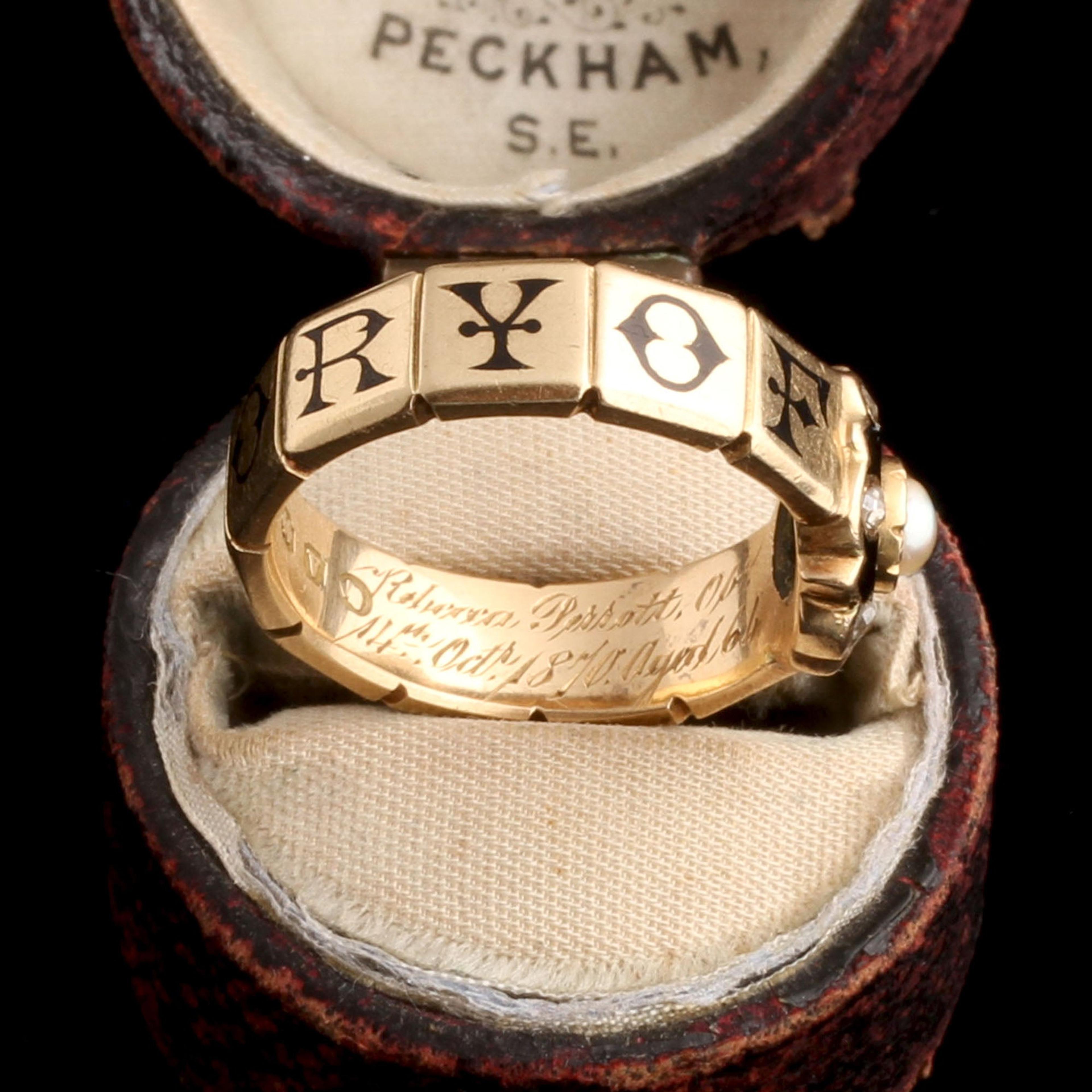 William Perrott died on October 18th, 1869. He was 63 years old. Almost exactly one year later, his wife Rebecca followed him into the great beyond. She was 64. Someone who loved them both commissioned this "IN MEMORY OF" ring with teeny tiny script inside telling us the -partial- story of this married couple. The typography is exquisite: Neo-gothic / Renaissance vibes.