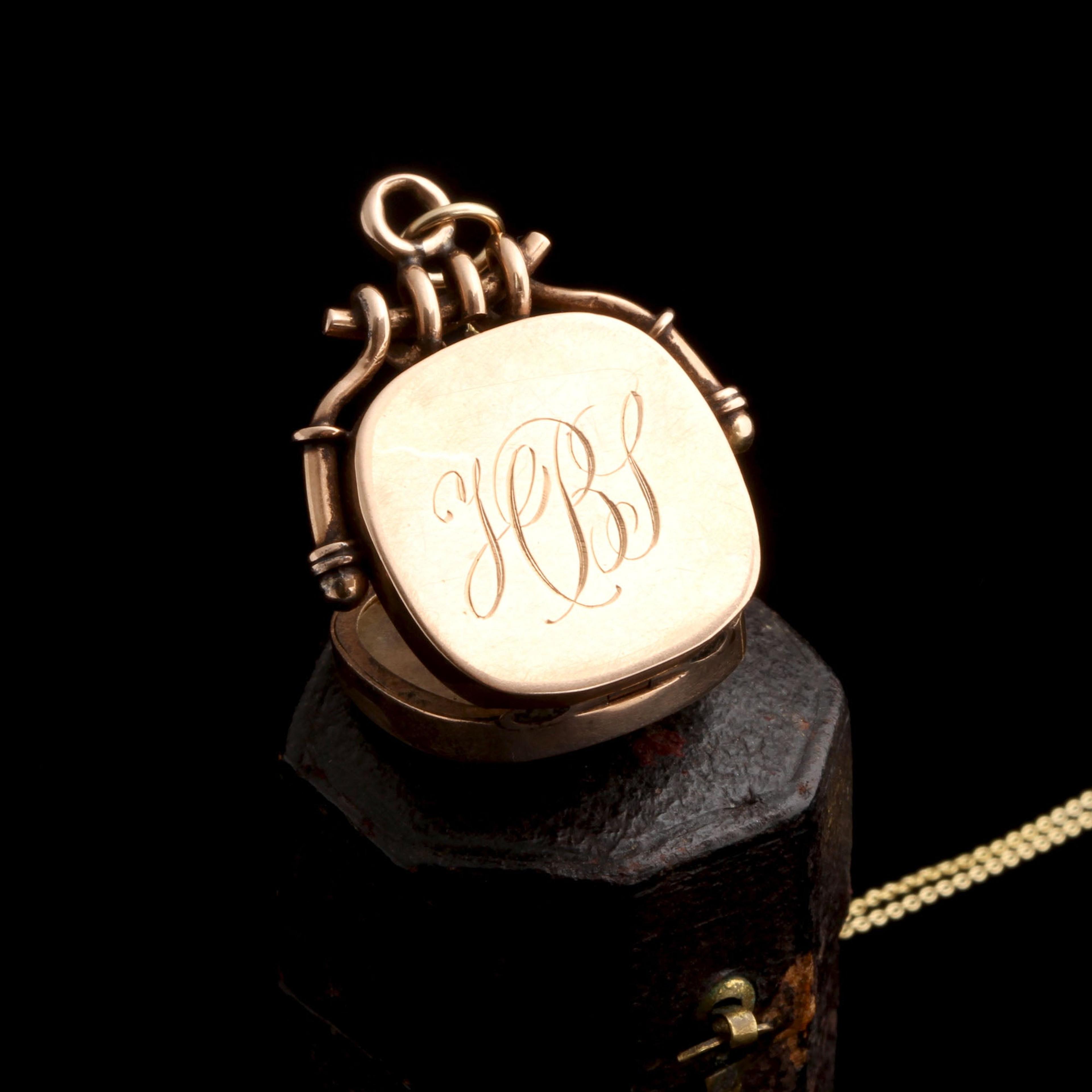 This 10k gold locket has a diamond in the front in a star-shaped setting. There are nice twisted mounting details and completely intact interior frames and lenses. Looks to have never been worn - it's what we called "deadstock" which means it probably has been unsold in a jeweler's vault for many decades. The monogram on the back is "HBS" or "HBI".