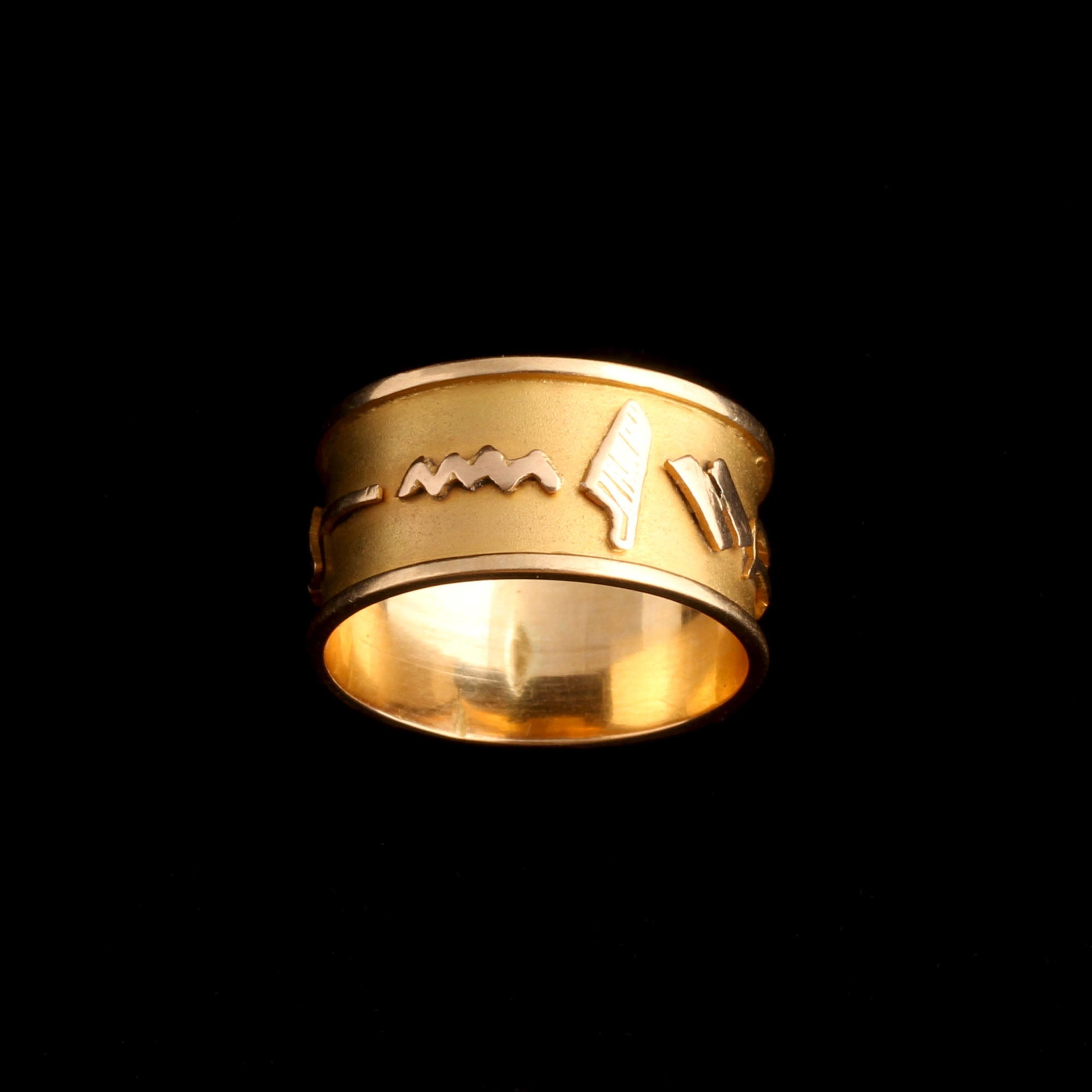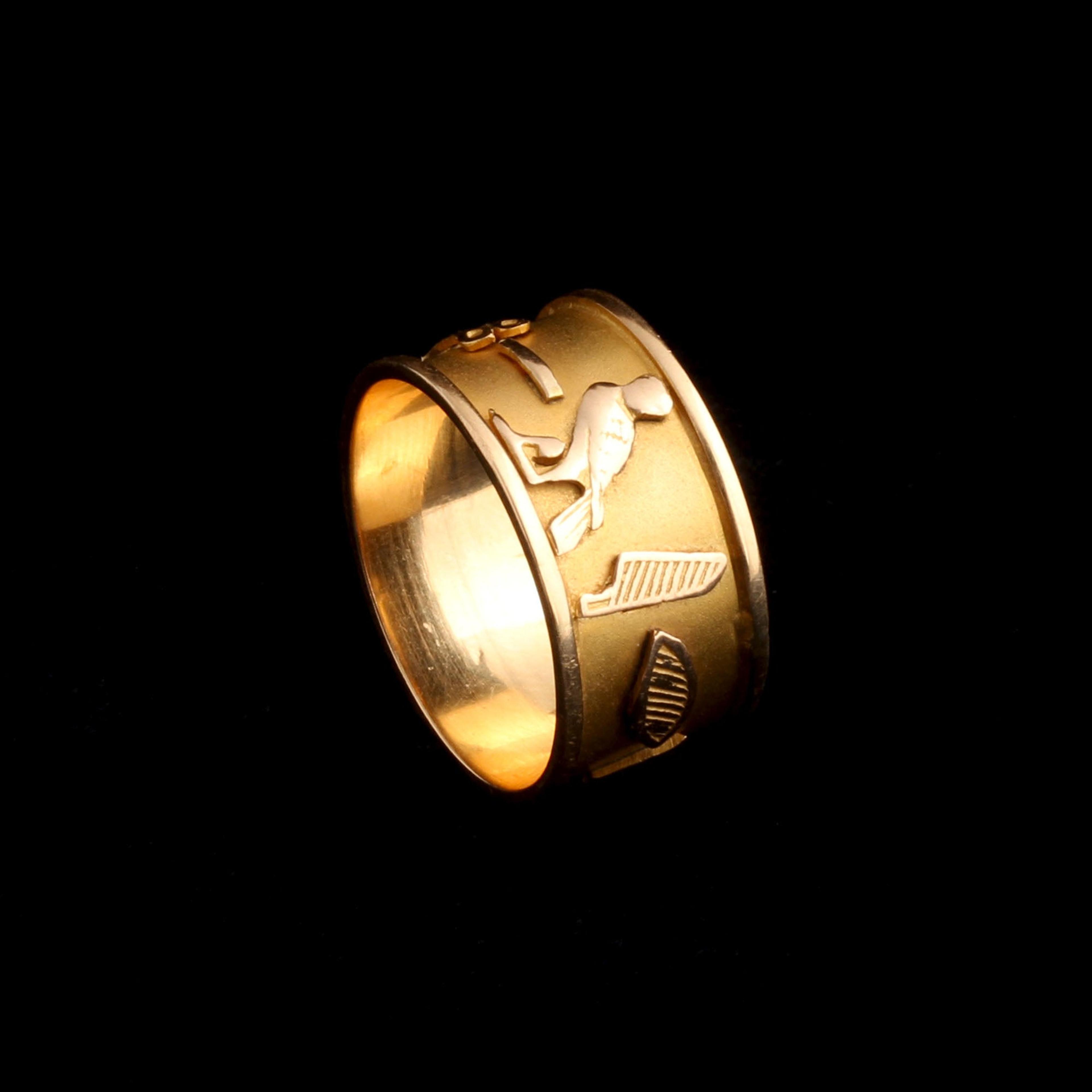 A vintage wide gold band decorated with heiroglyphics. Size 8.