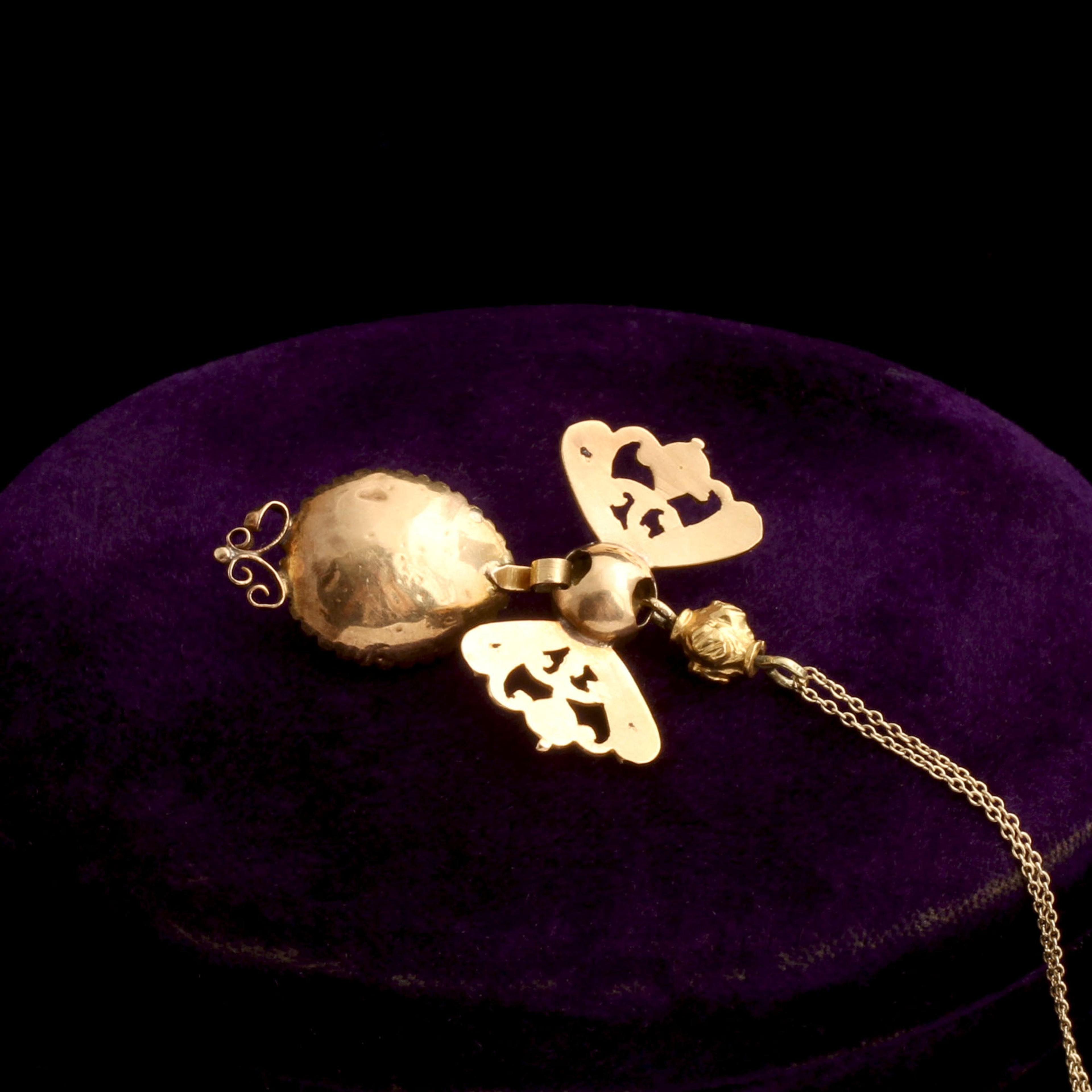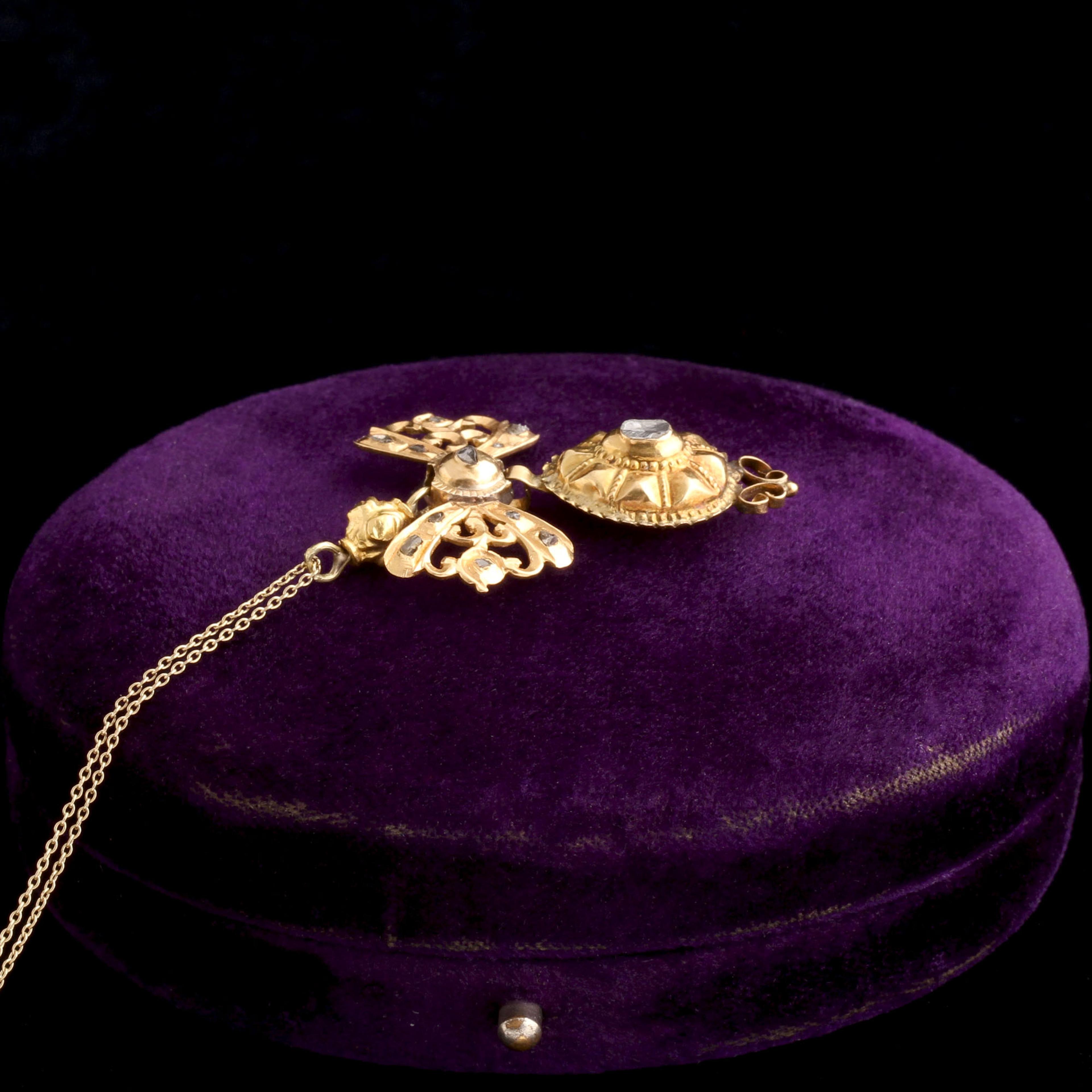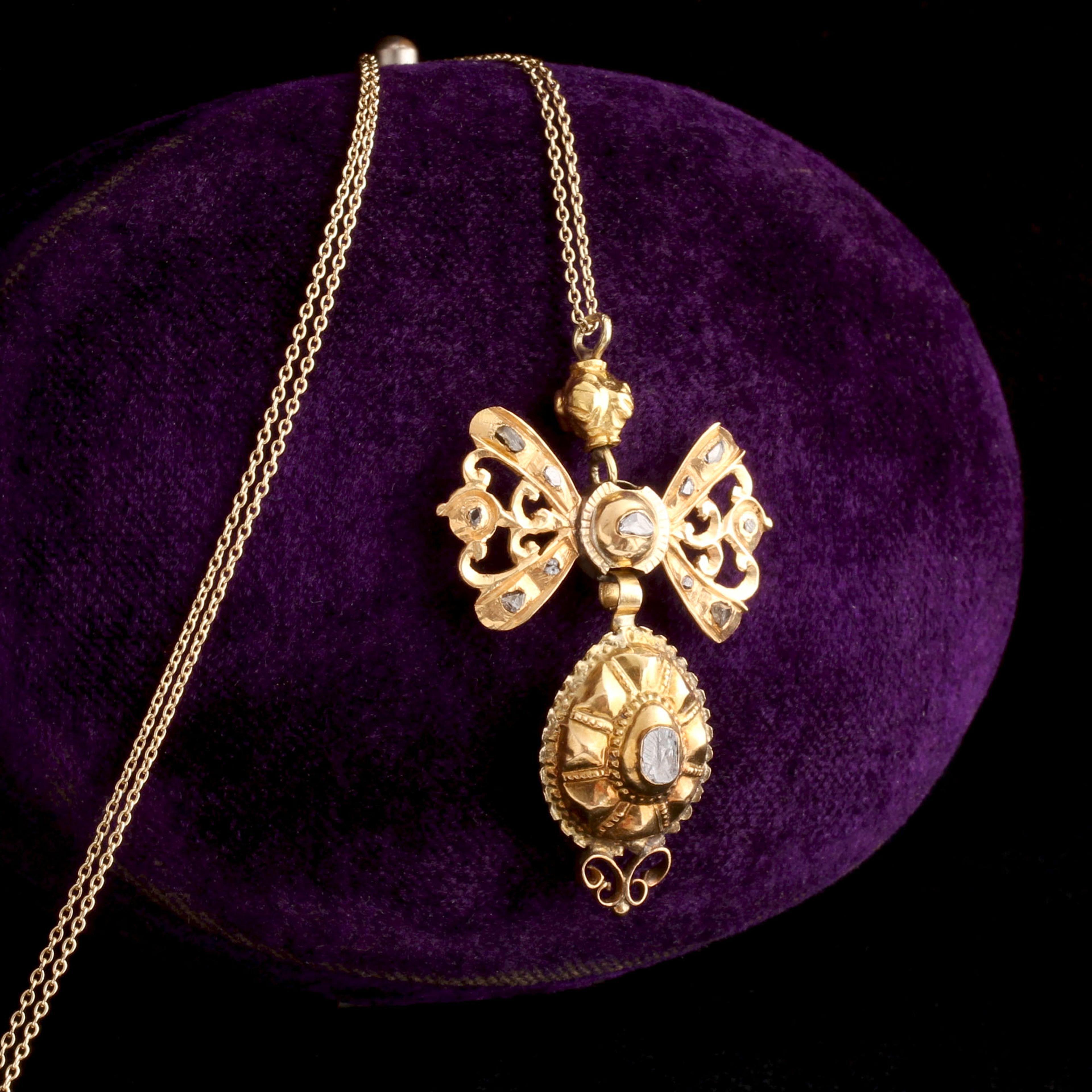 This late 18th century Iberian bow with a pear shaped pendant is modeled in gold and set with rose cut diamonds. Now a pendant, this piece was almost certainly an element of an earring - known as “pendeloque” - that came into fashion at the tail end of the 1700s. Ever so slightly simpler in style that the girandole earrings that preceded them, pendeloque earrings are typically formed with a cluster of sorts at the top, a bow-themed element in the middle, and a pendant at the base.