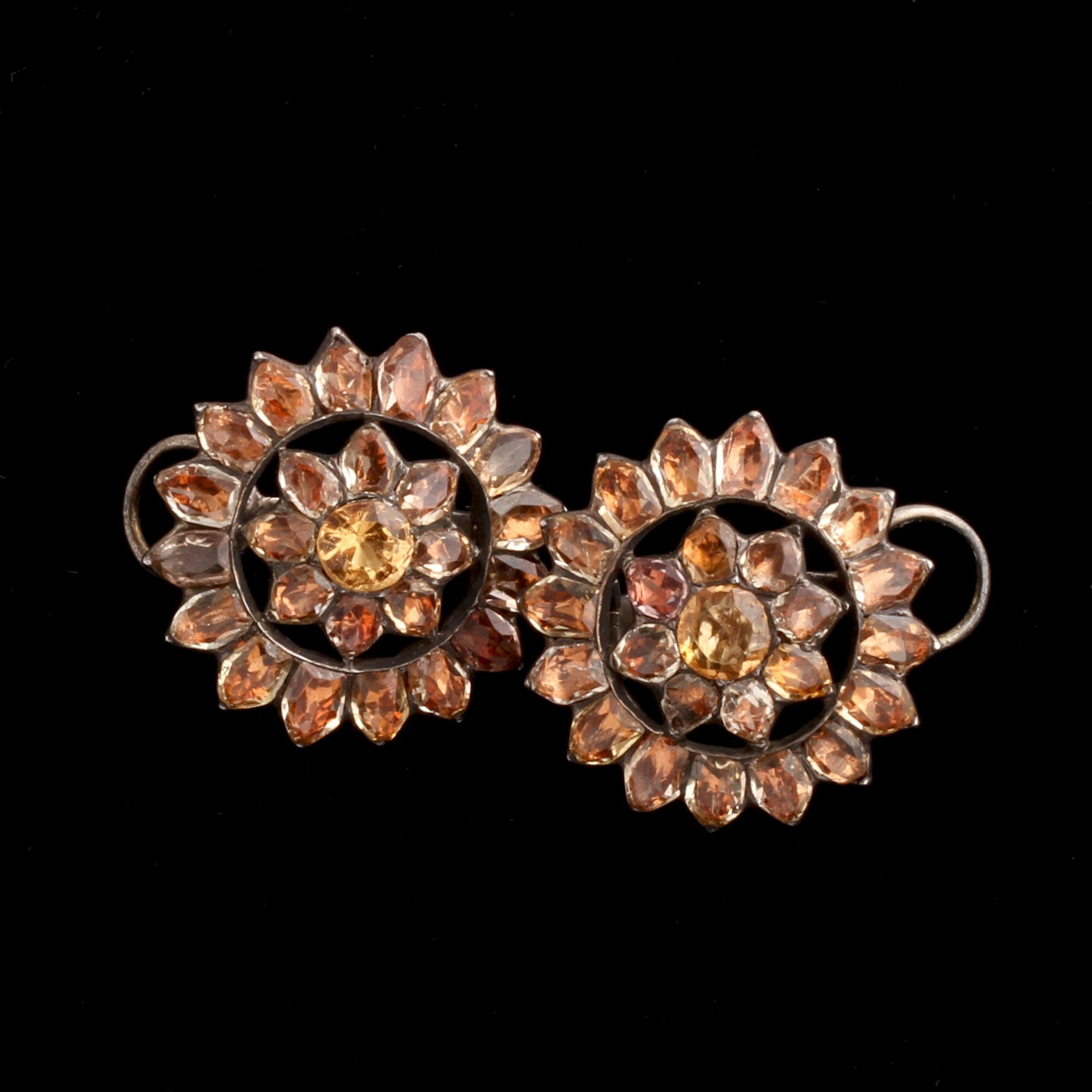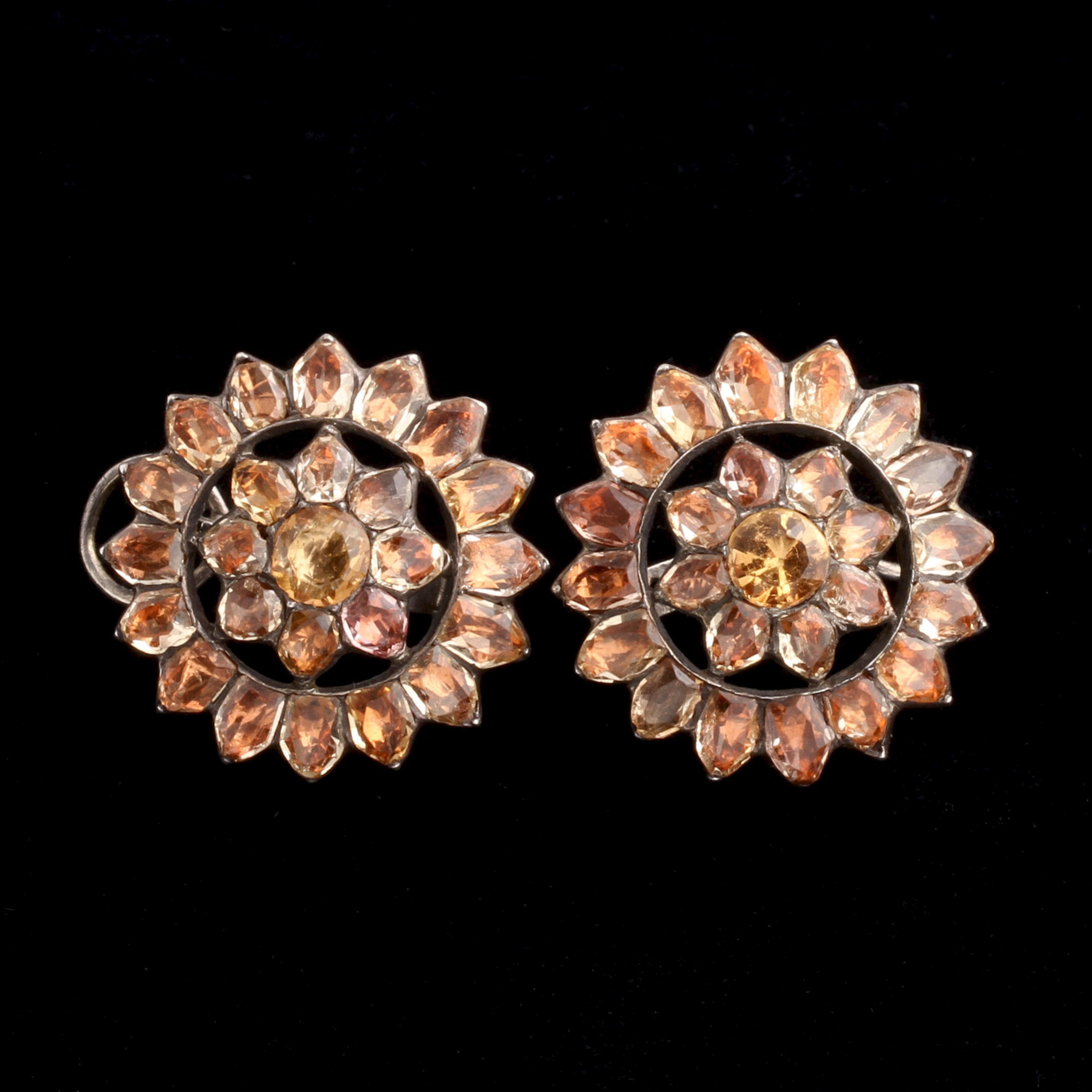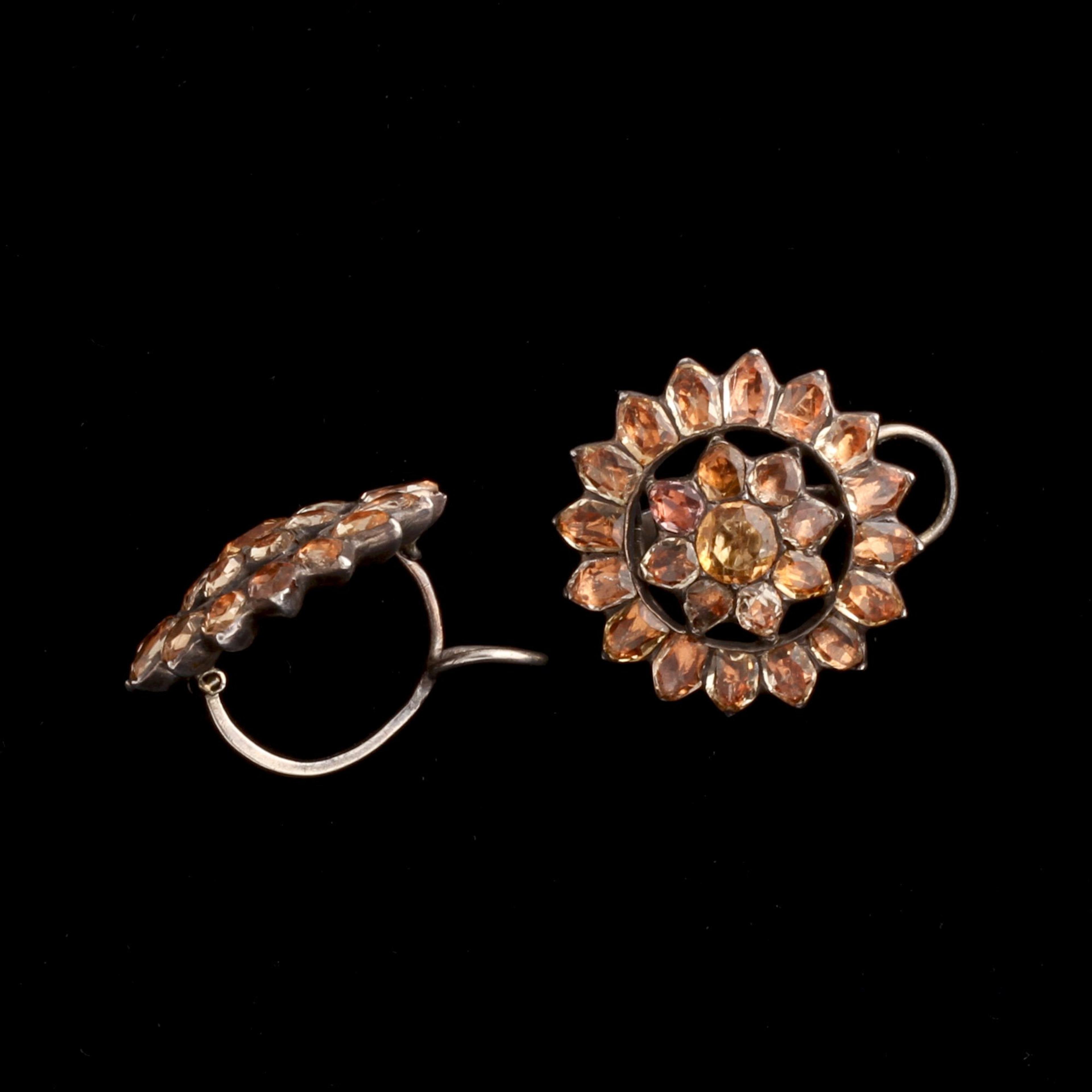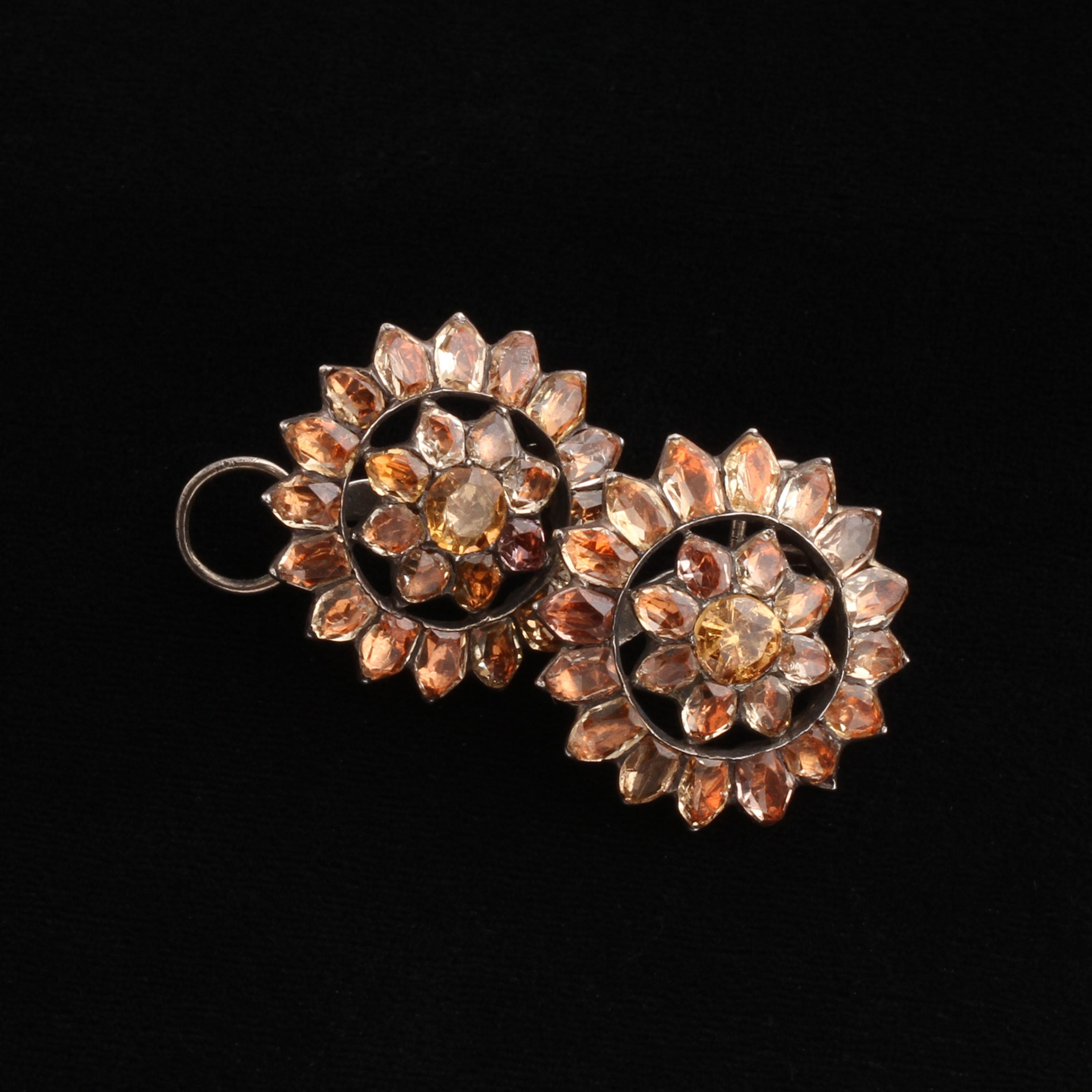 These 18th century floral earrings are made in silver and set with vibrant topaz. Topaz is believed to derive its name from either the ancient Sanskrit word topas meaning "fire", or for the old Greek island of Topazios. The gemstone occurs in many places throughout the world, as well as in varied colors including yellow, blue, and colorless to name a few. Topaz mines were discovered in Brazil in the 17th century, and seeing as it was occupied by the Portuguese at the time, the fruits of these mines were shipped on to Portugal and traded throughout Europe for use in jewelry. These rare and exceptional earrings feature back to front wires complete with wig hooks. Outstanding.