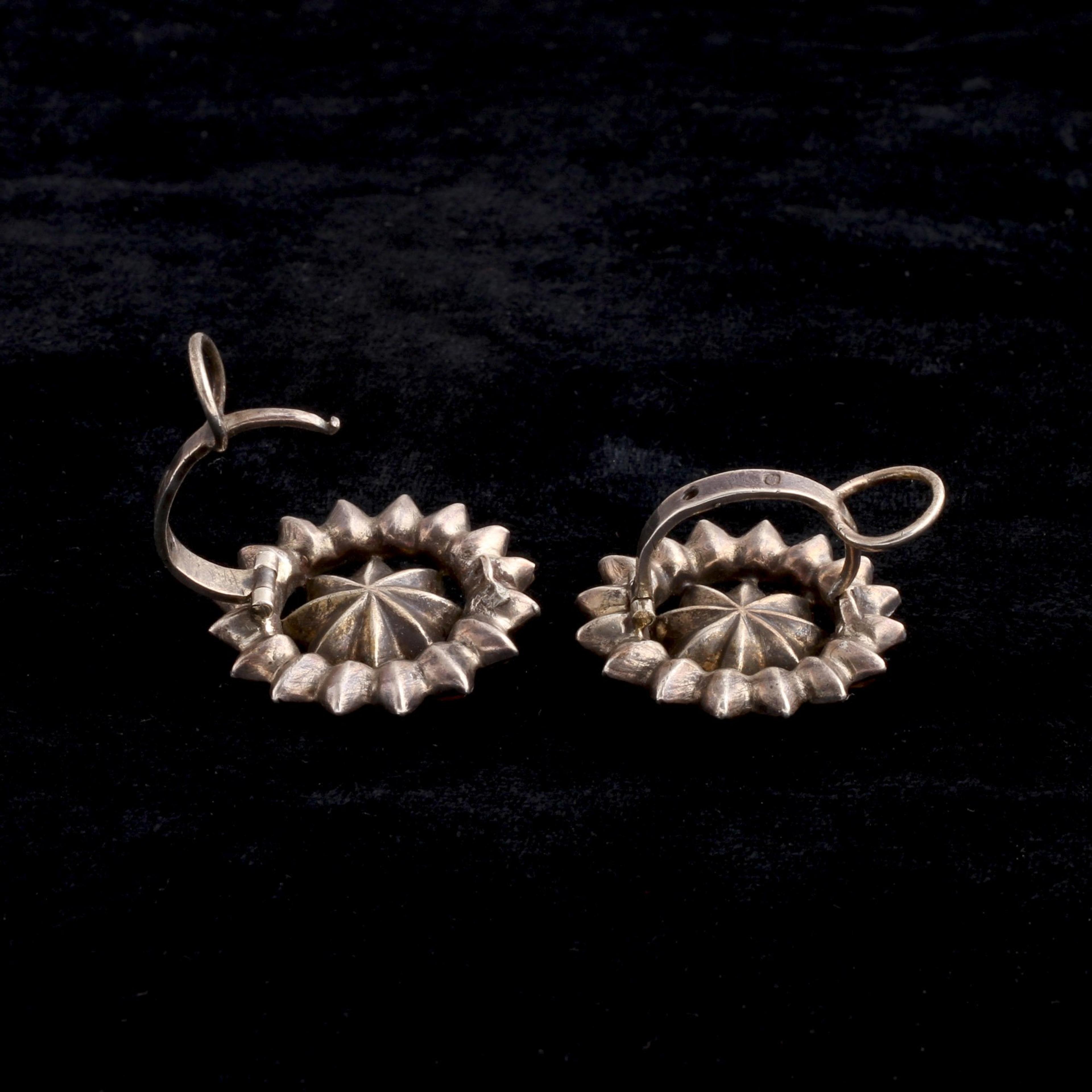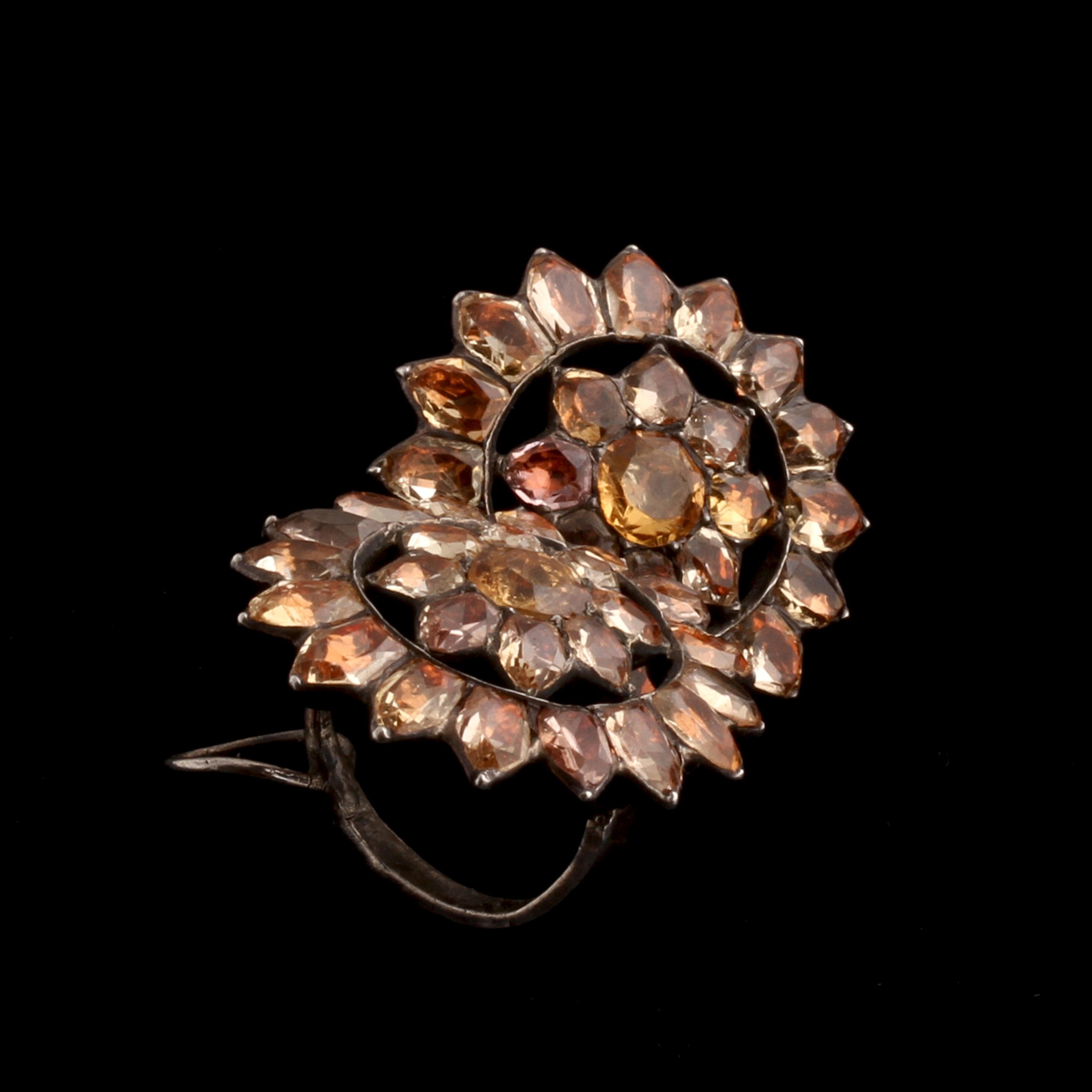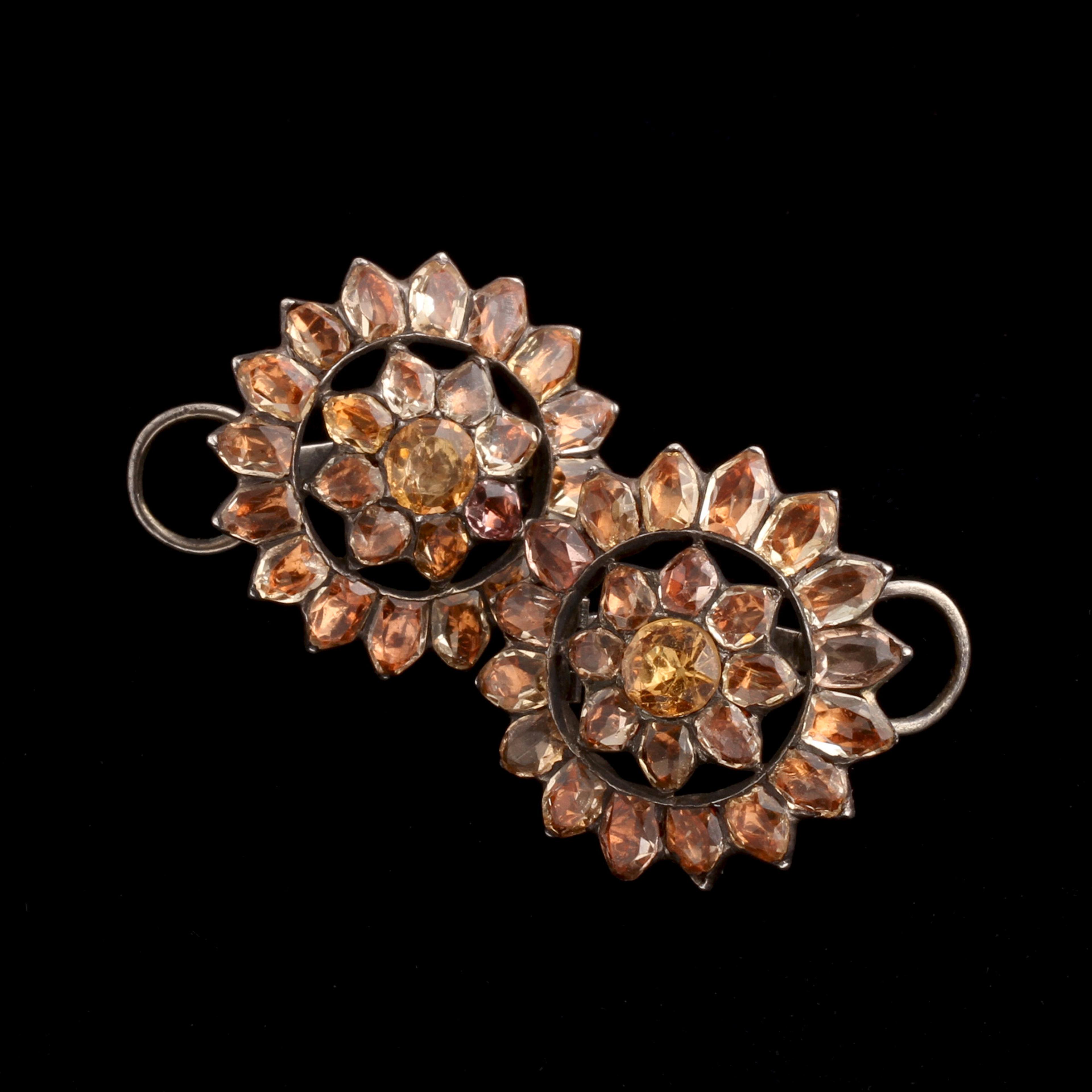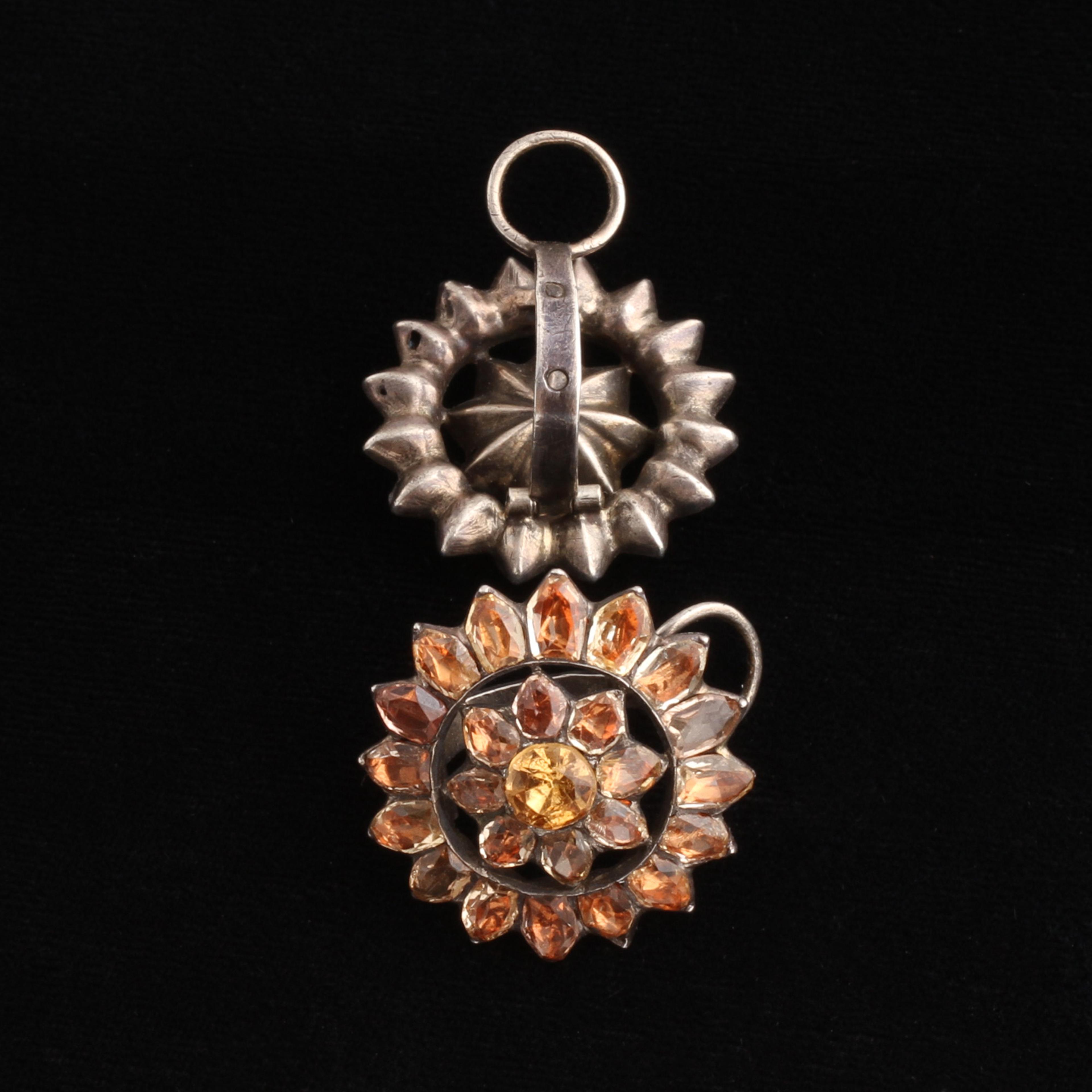 These 18th century floral earrings are made in silver and set with vibrant topaz. Topaz is believed to derive its name from either the ancient Sanskrit word topas meaning "fire", or for the old Greek island of Topazios. The gemstone occurs in many places throughout the world, as well as in varied colors including yellow, blue, and colorless to name a few. Topaz mines were discovered in Brazil in the 17th century, and seeing as it was occupied by the Portuguese at the time, the fruits of these mines were shipped on to Portugal and traded throughout Europe for use in jewelry. These rare and exceptional earrings feature back to front wires complete with wig hooks. Outstanding.