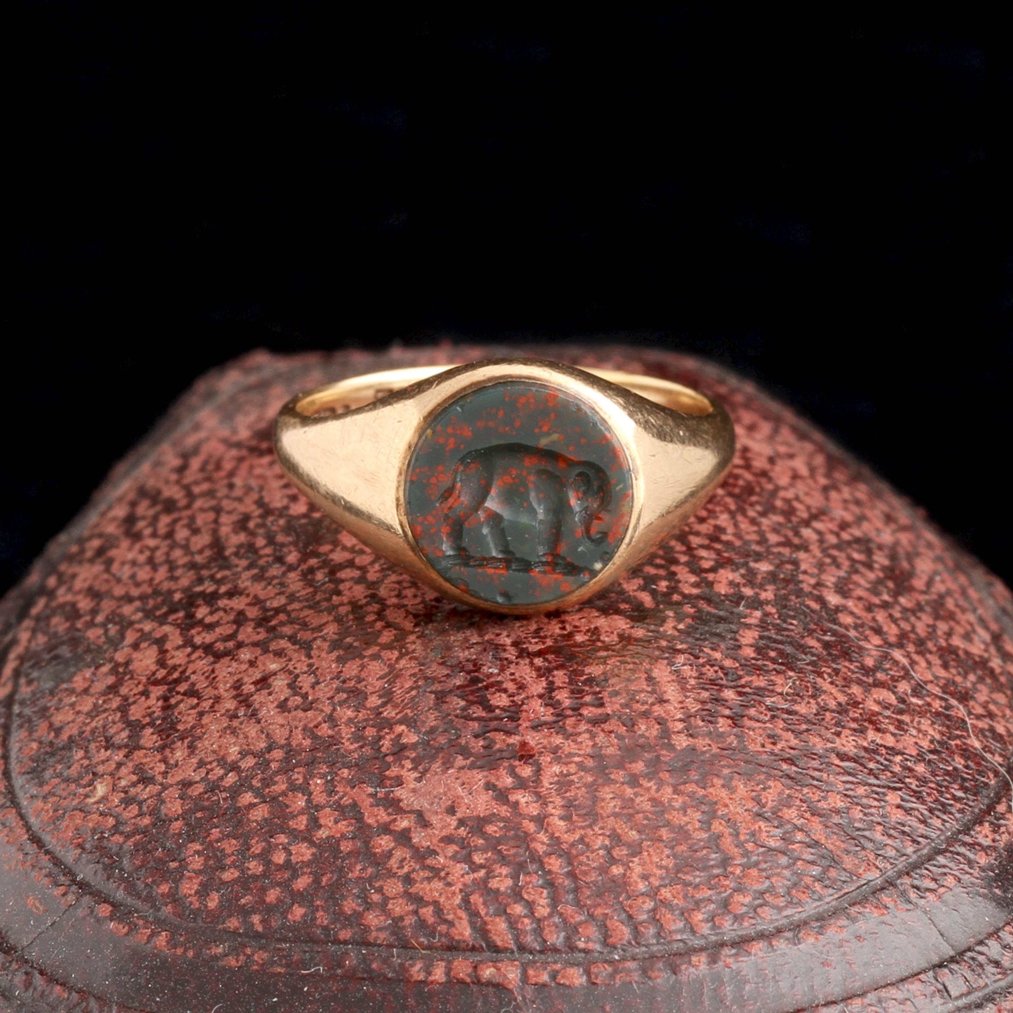 The elephant - a symbol of memory, strength, loyalty and power - decorates the face of this signet seal ring. Dating to the 1920s, the noble elephant is etched in bloodstone and set in 9k gold.