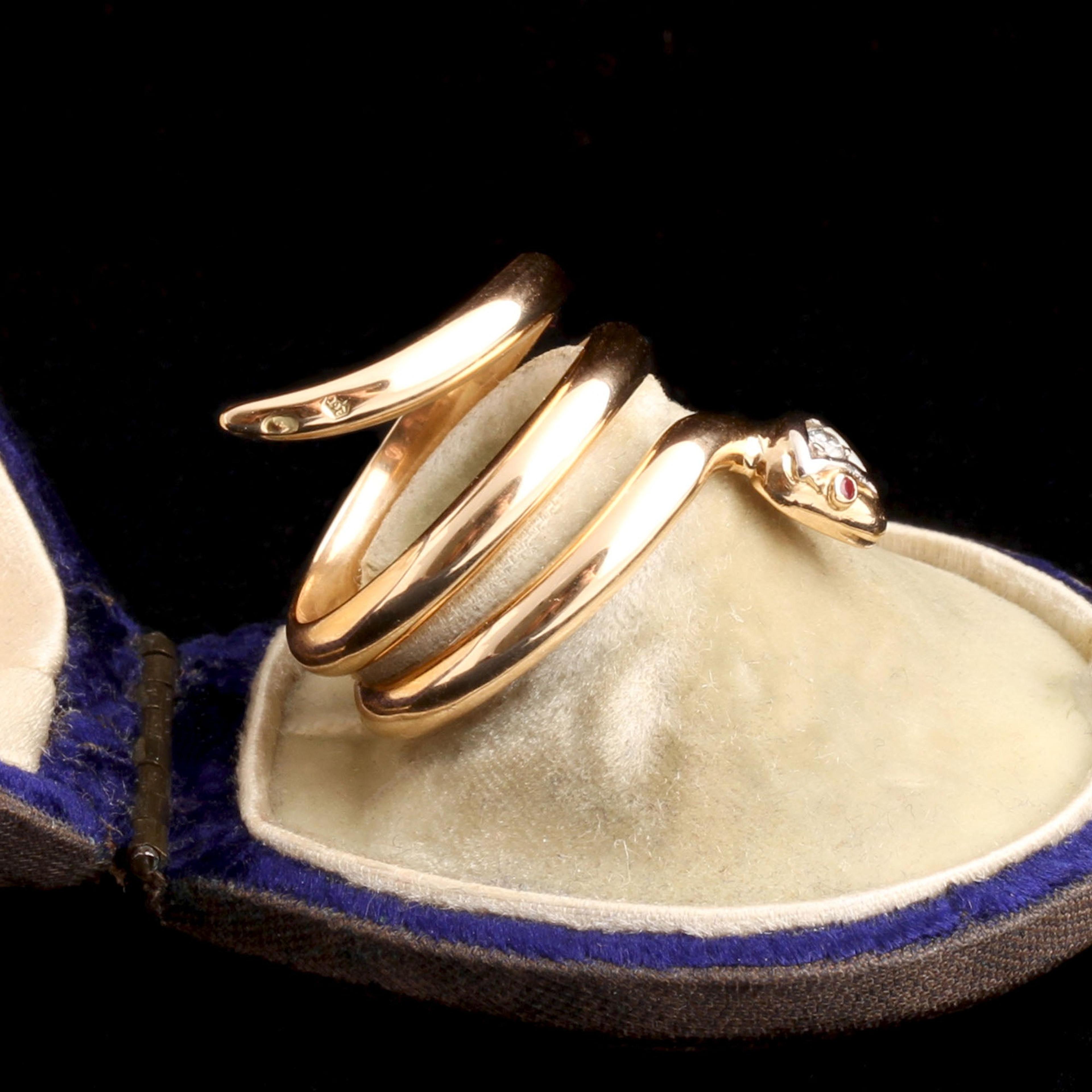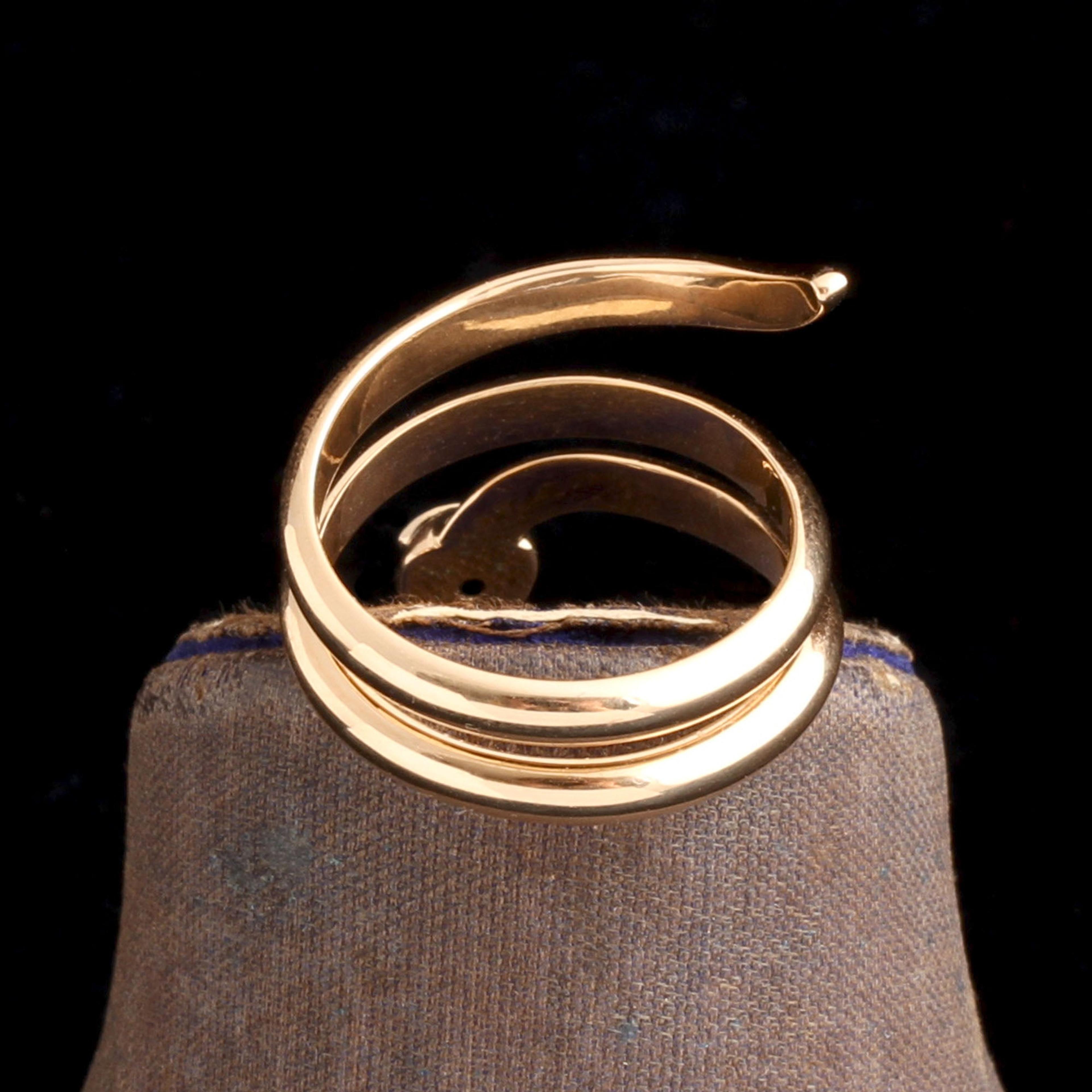 An Art Deco serpent that curls around and around your finger. The hallmarks on the tail are unidentifiable - we suspect they're Portuguese. Ruby eyes, nice two-tone gold details.