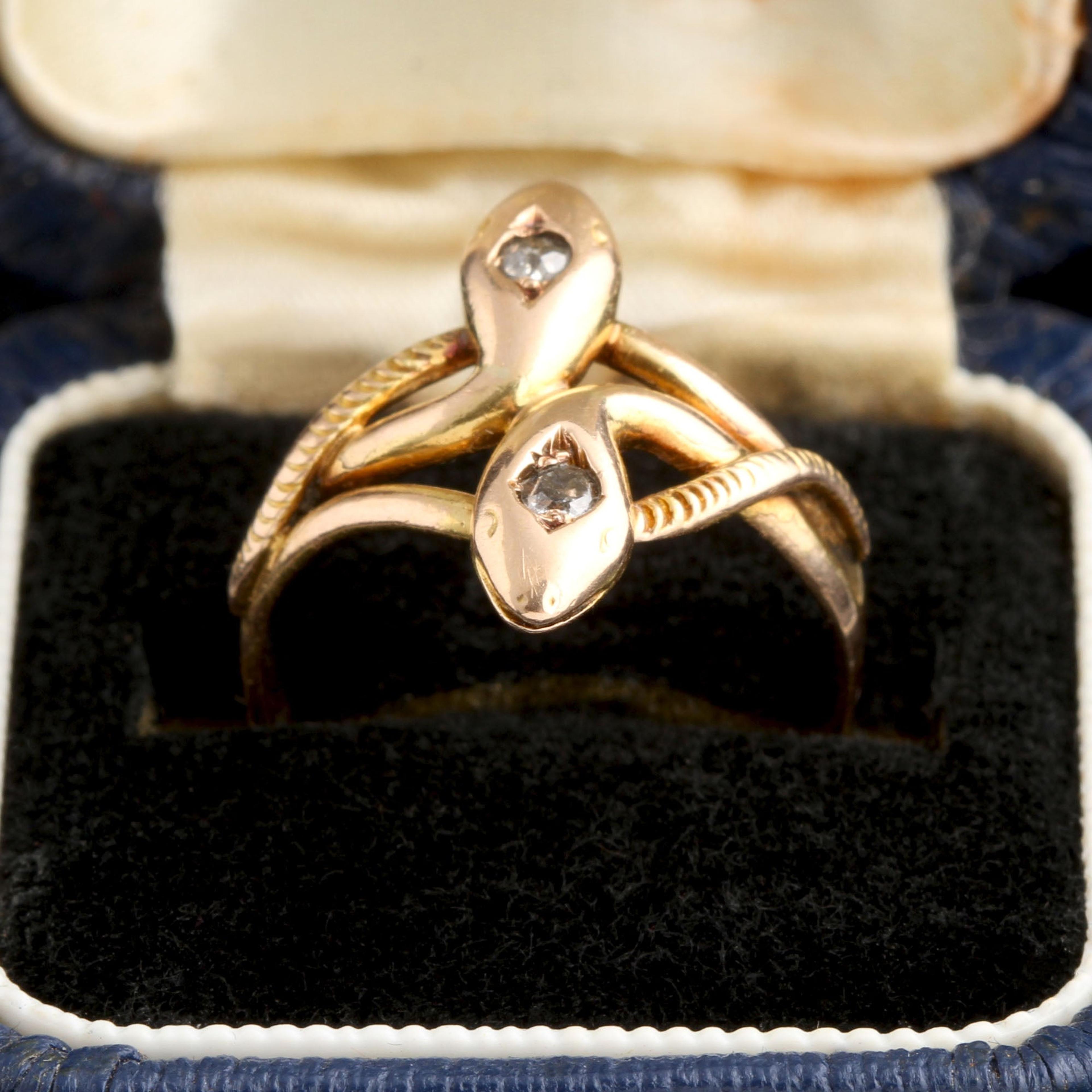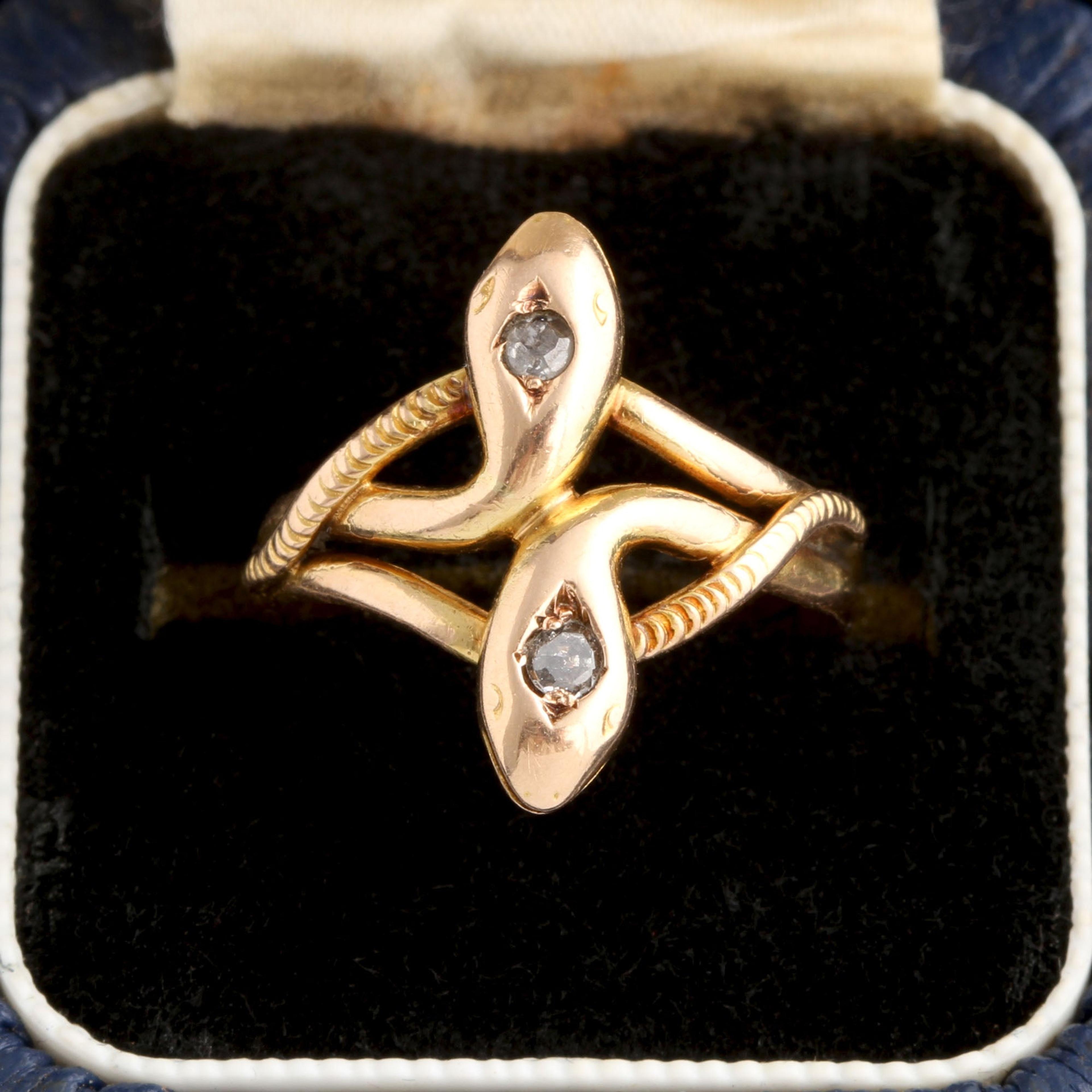 The ancient Egyptians used the serpent's image to denote royalty; the Romans used it as representation of everlasting love; and Hindus regard it as a symbol of desire. In somewhat more recent history, Prince Albert proposed to Queen Victoria with a snake ring set with an emerald. The queen set the bar for fashion in this period and, owing largely to Victoria's ring, serpent-themed jewelry was incredibly popular throughout the 19th century and well into the 20th (truth be told, it wasn't altogether uncommon in the 18th century either). This twin snake ring is fashioned in gold and dates to 1920s. The pair of serpents - each crowned with a flinty single cut diamond - symbolize the eternal love between two people.