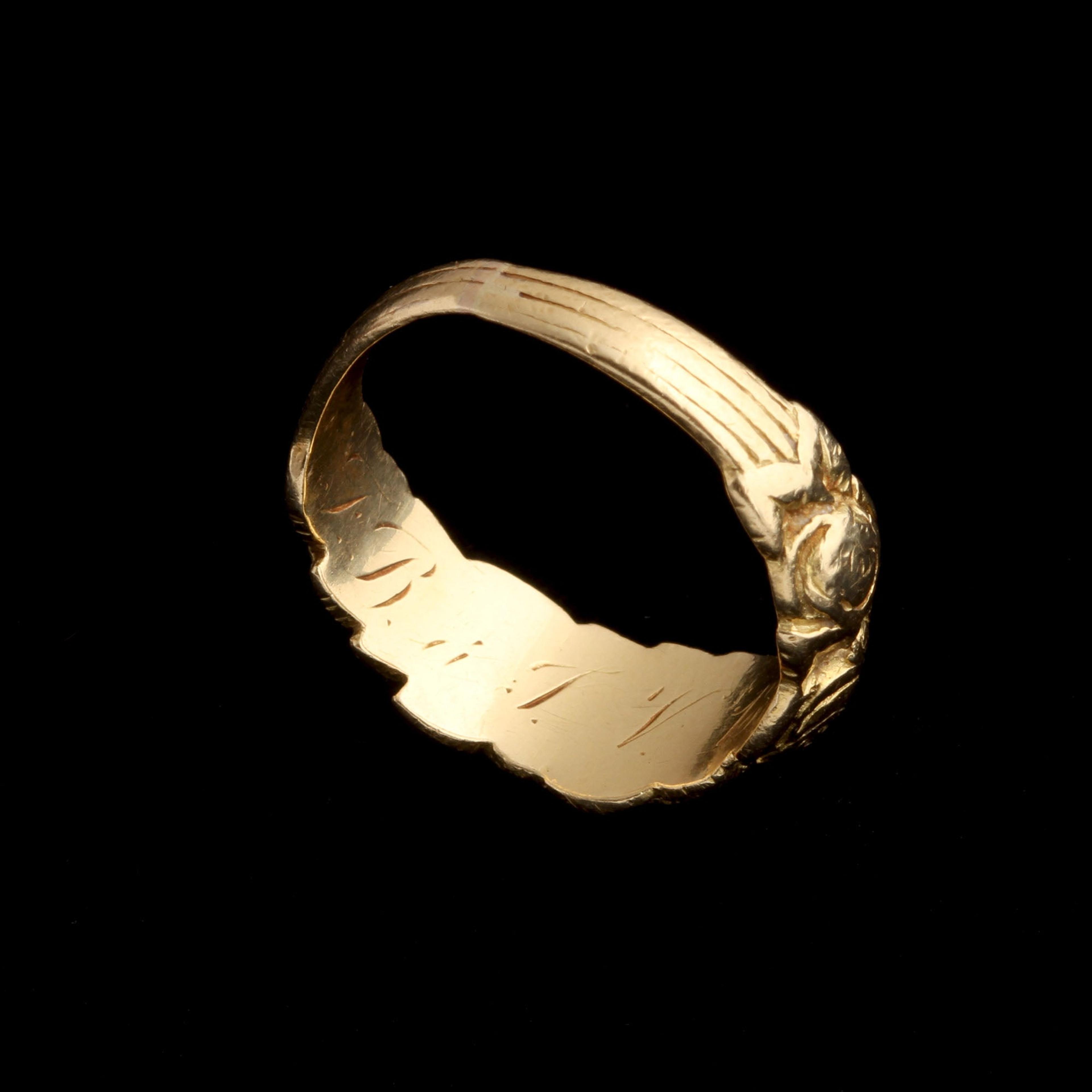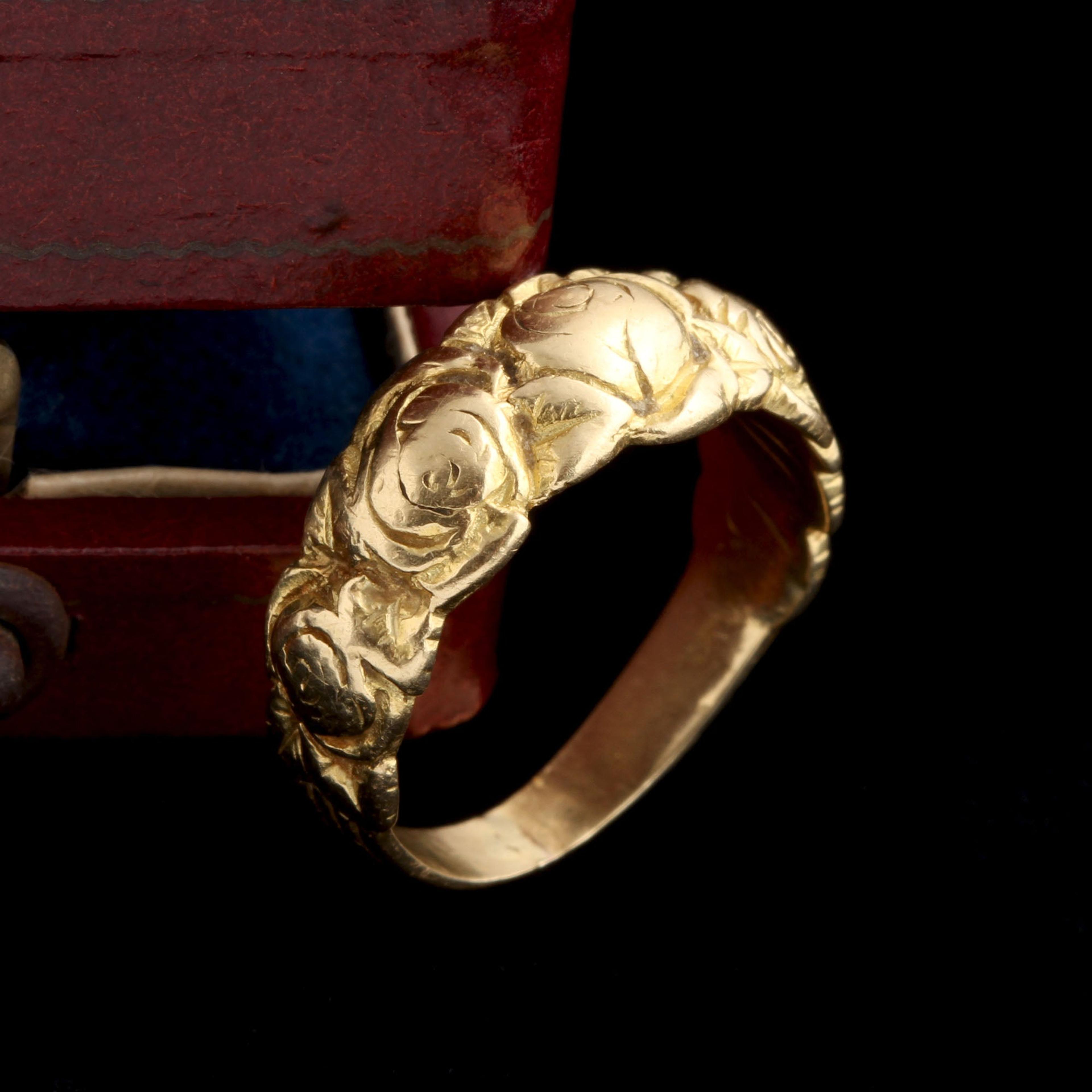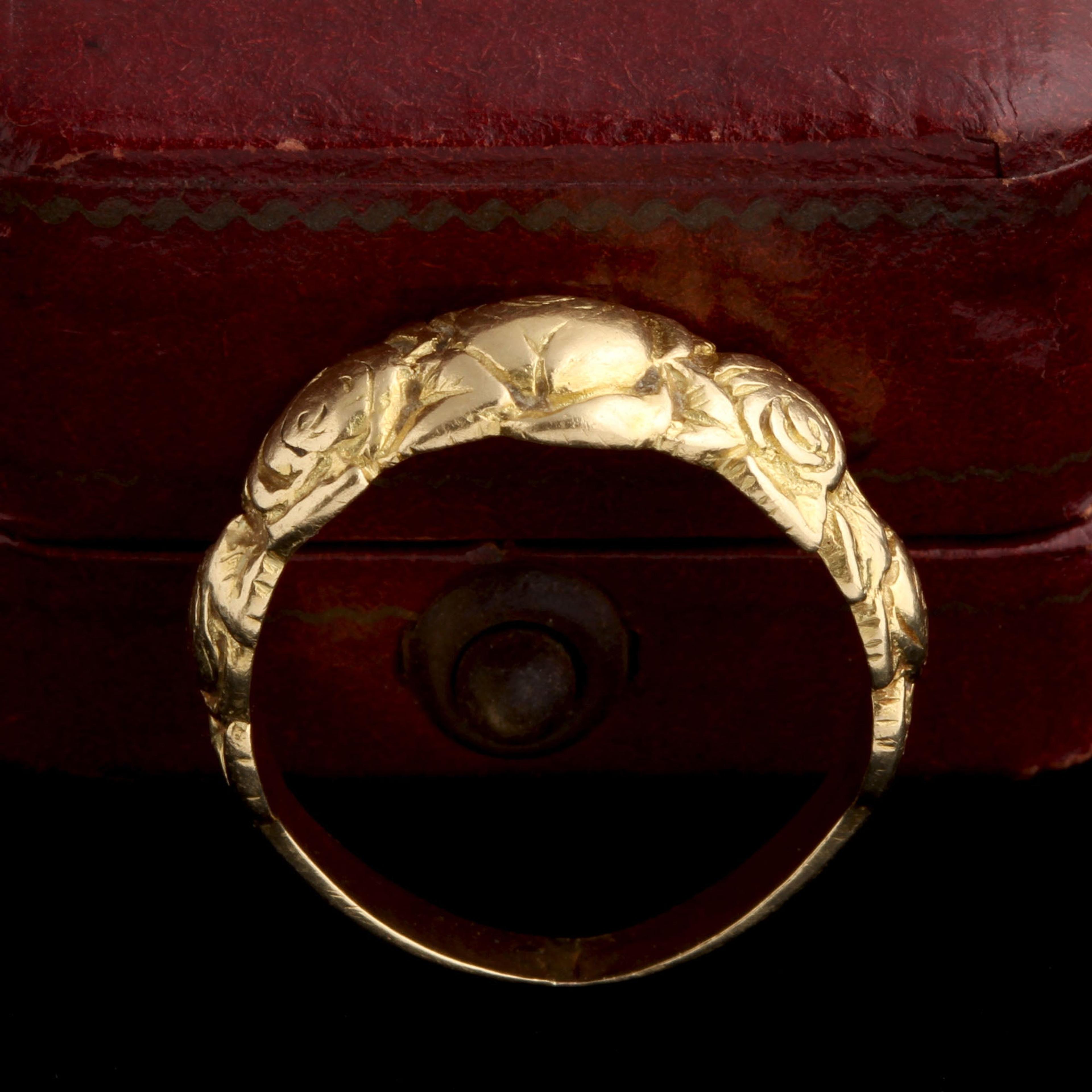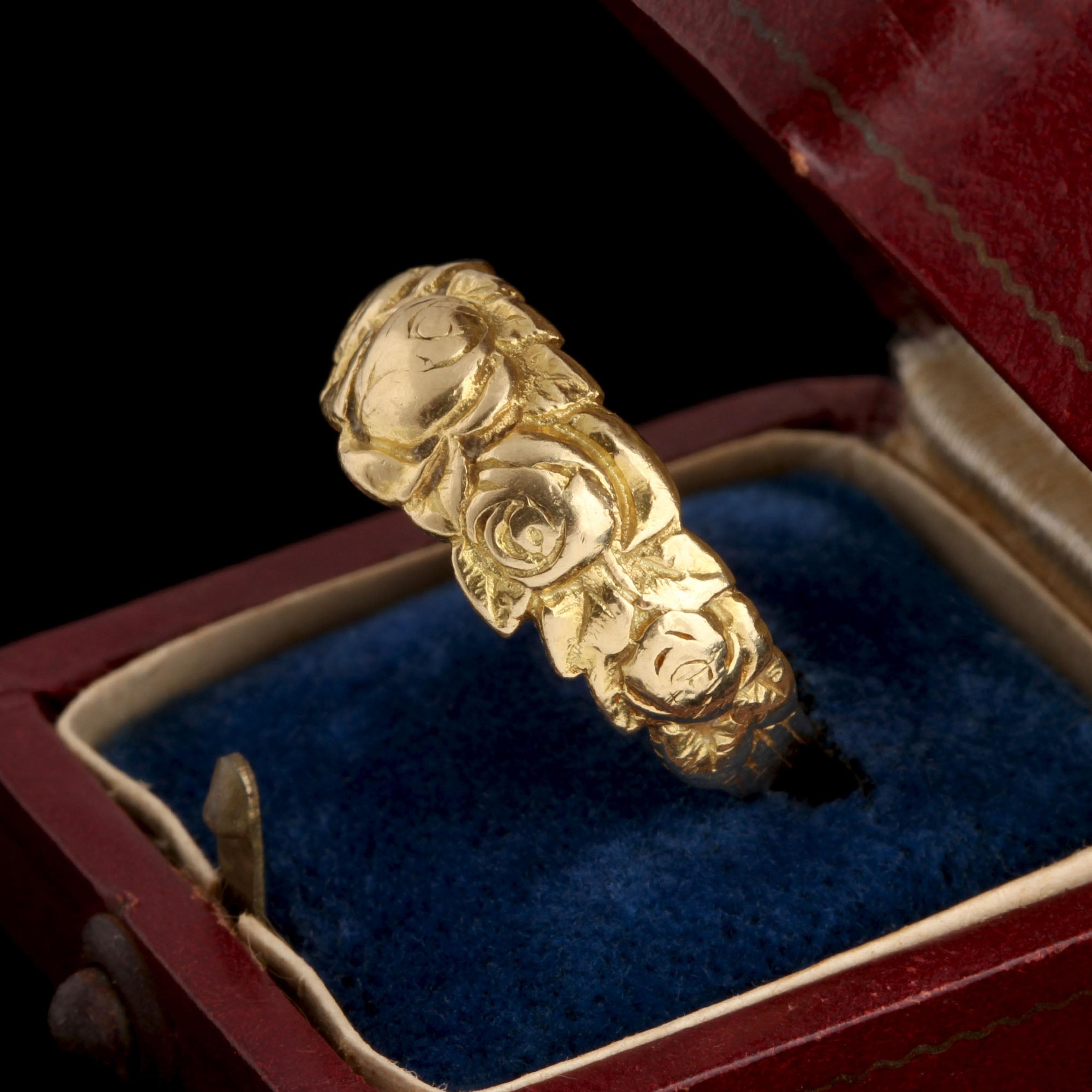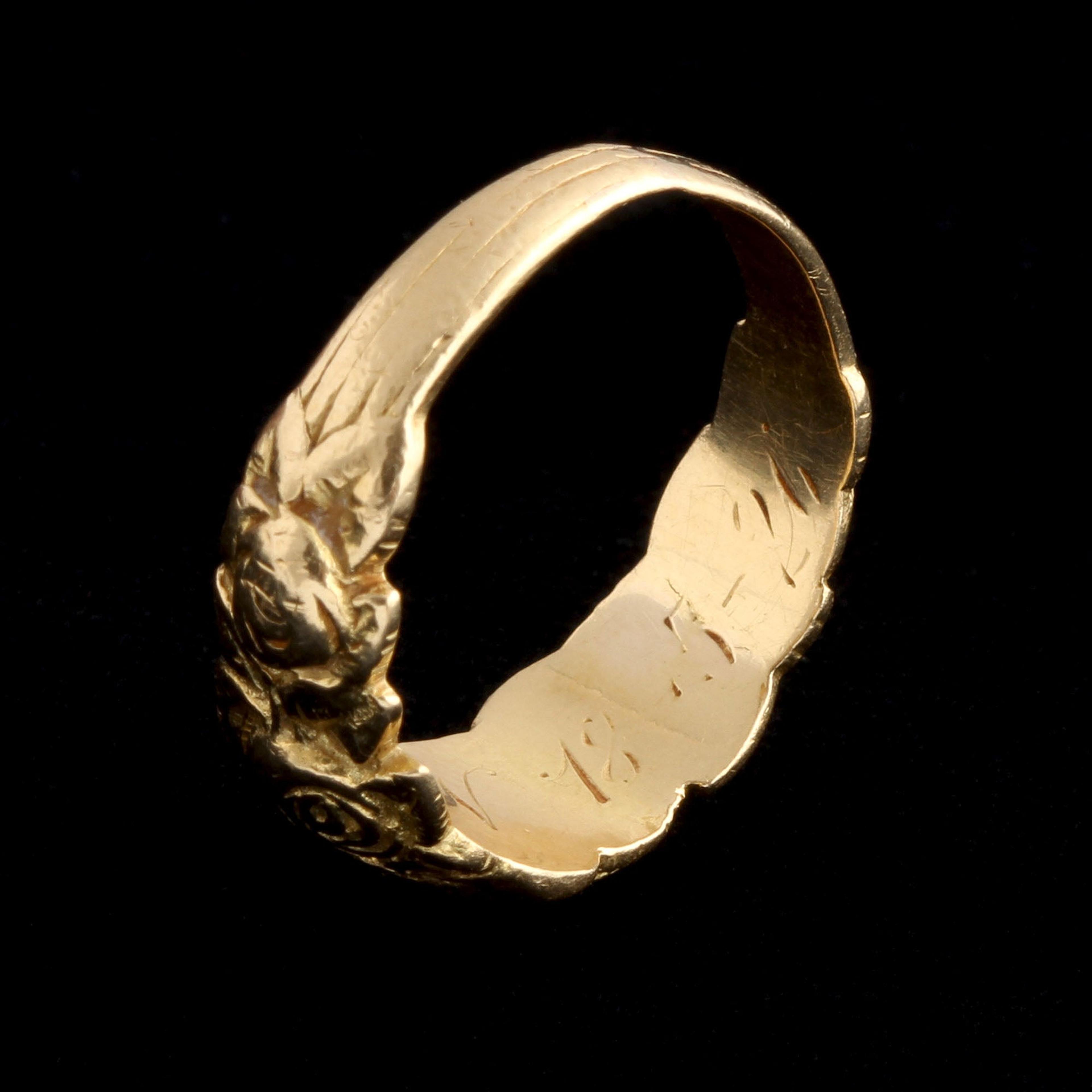 An especially beautiful floral wedding band with roses rendered in high relief across the face and a subtly striated shank. The interior is engraved, “T.B. à S.V. 18-5-26.”
