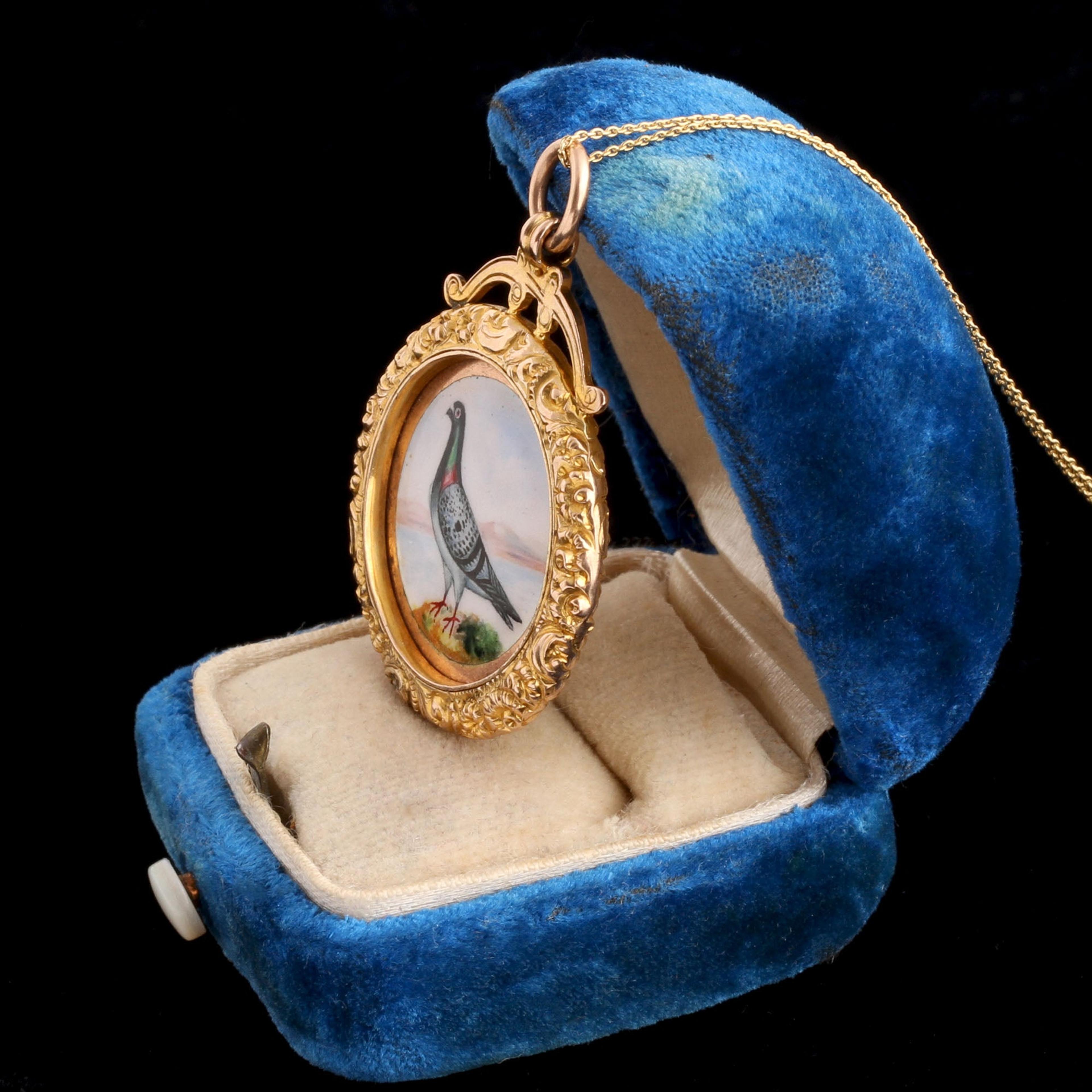 Pigeon racing was a big thing in the 19th and 20th centuries, and apparently still is in some places. These awards were often partially pre-made with a generic-looking bird either enameled or painted on. After a winner was determined, an artist would fill in the particular markings and colorings for the winning bird, personalizing the medal. Next step was the engraver's - this text boasts "D.H.C. Won By J. McKenzie O.B.A. 1923".