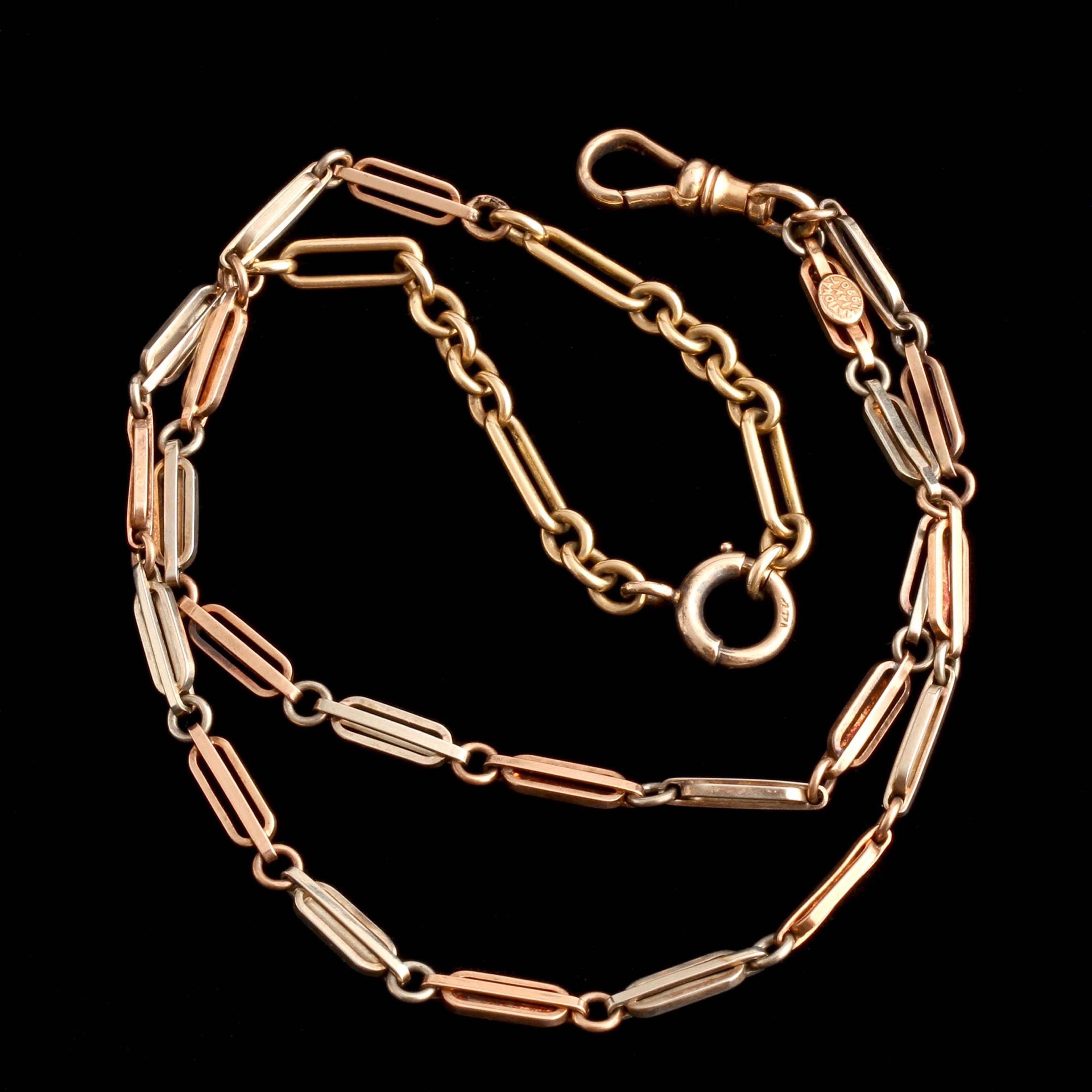 The spring and dog clip were moved around to make this a necklace (rather than just a fob chain) but could easily be swapped back. I prefer it this way - use it to wrangle your charm collection. Or I know a fellow antique dealer who uses a dog clip/chain setup like this to hold her foil-backed diamond ring while she washes her hands. 14k white and rose gold links, marked "National 14k 1920".